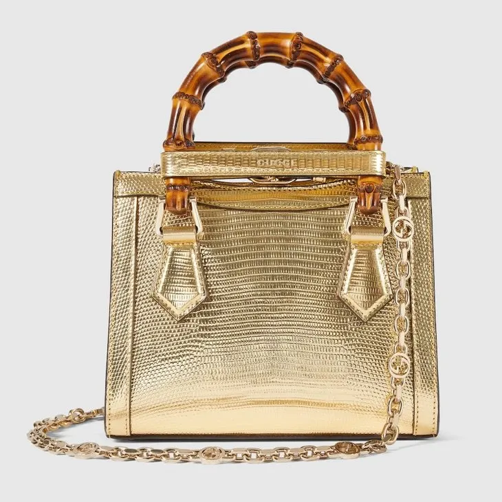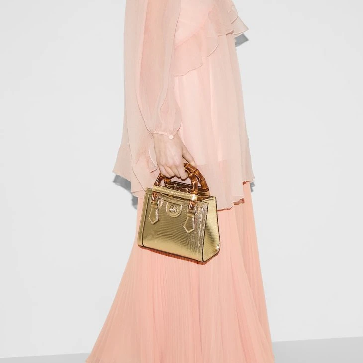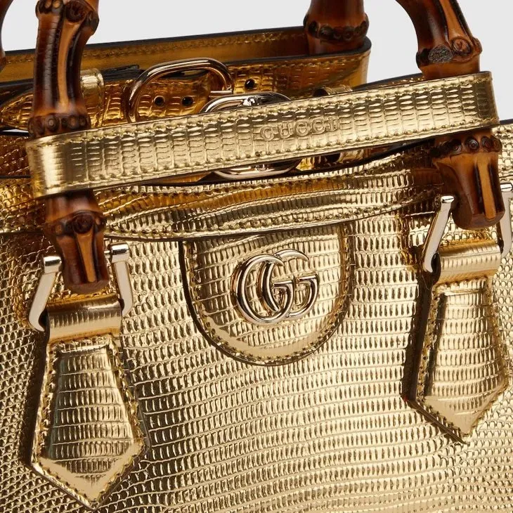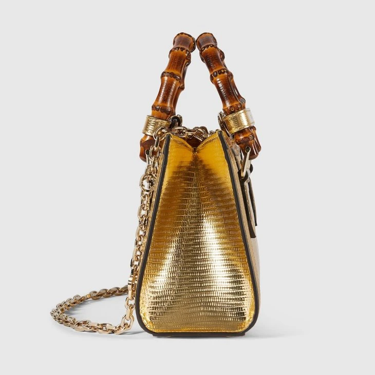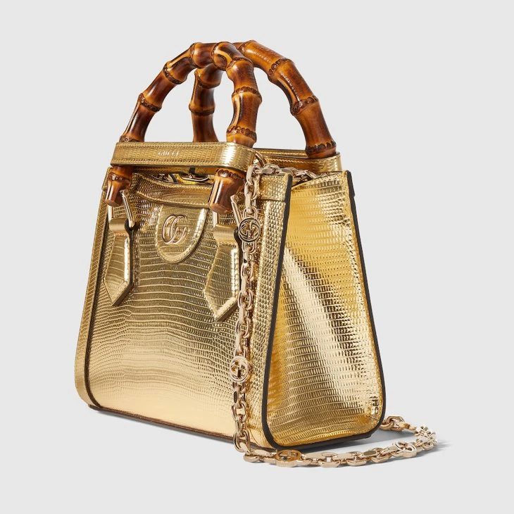 The Gucci Diana tote bag blends recognizable elements of the House, such as the bamboo handles and Gold-toned lizard