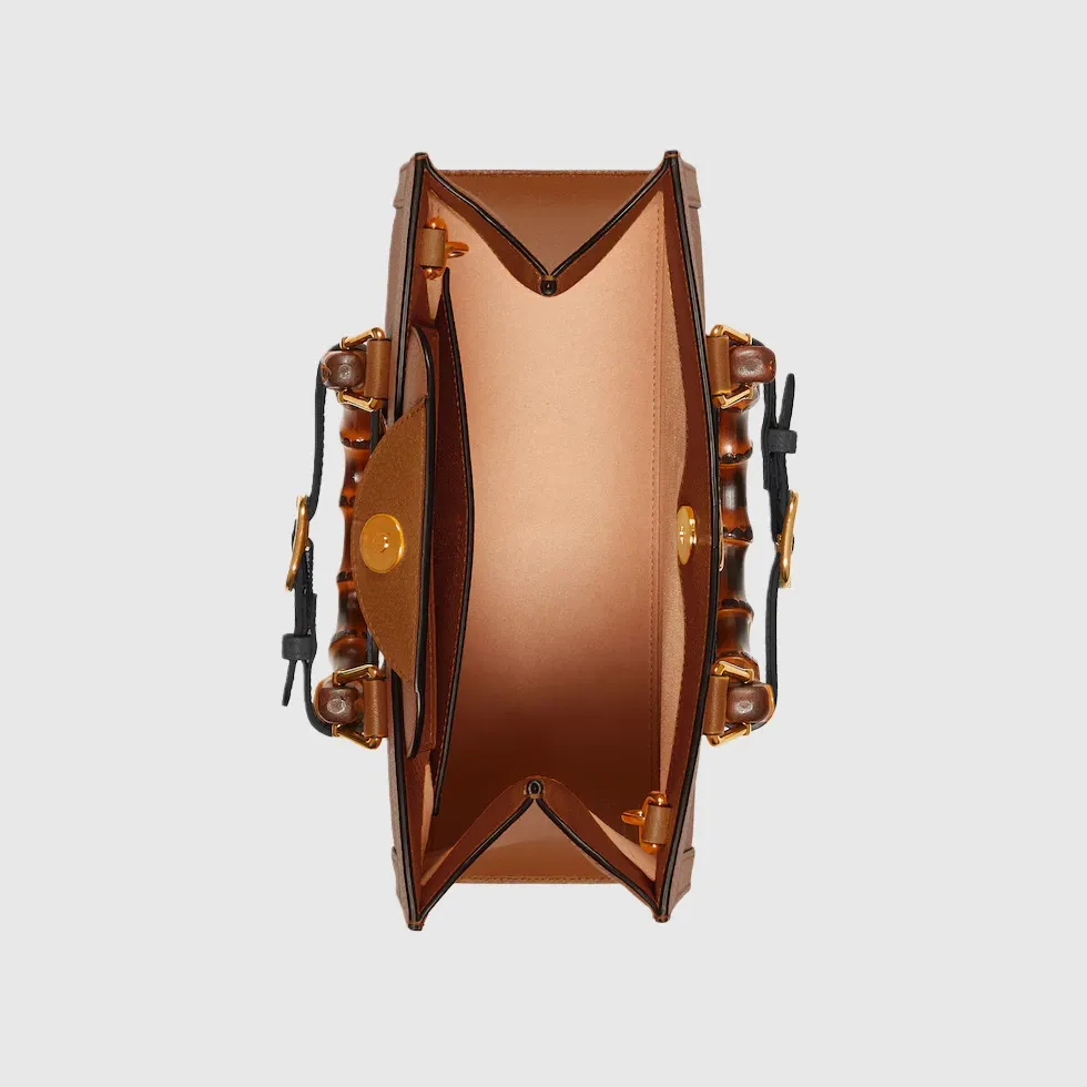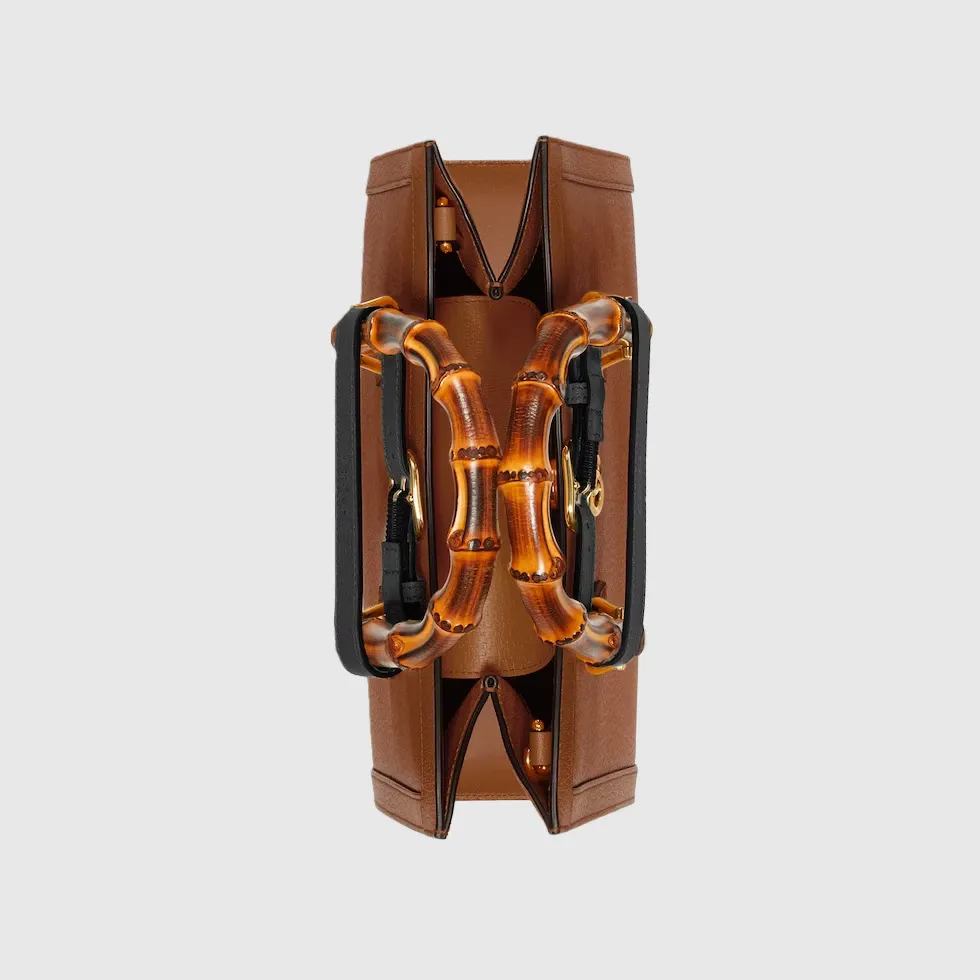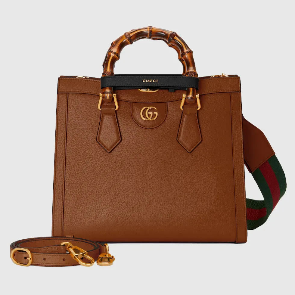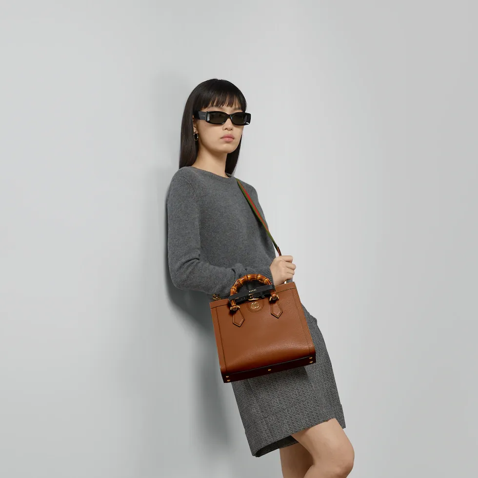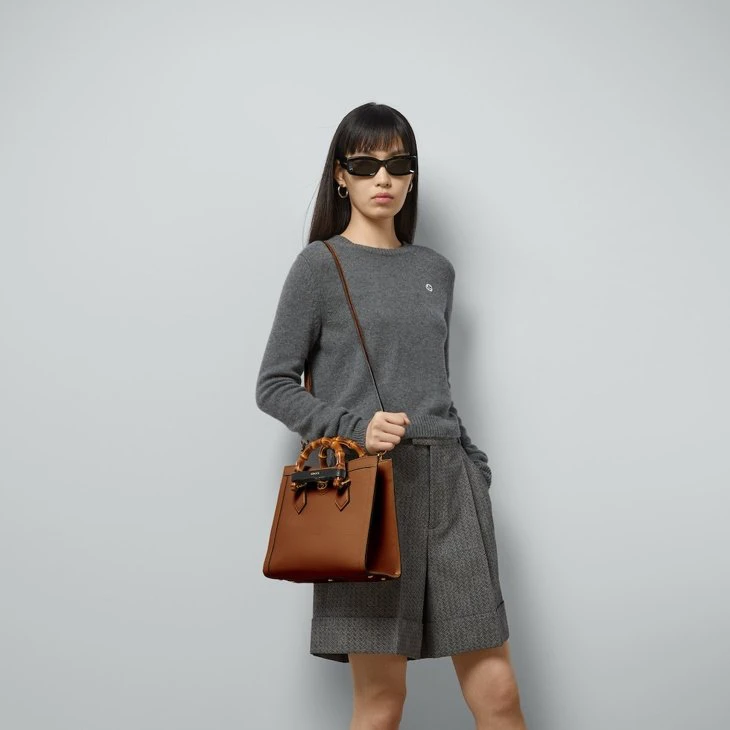 The concept of reinvention continues to shape the House’s designs. An evolution of a bamboo handle tote first introduced in 1991, the Gucci Diana represents the notion of style in constant evolution. The design plays with traditional details and renews them new meaning. Playing with this idea, the functional bands used to keep bamboo handles in shape are reimagined as playful leather belts. Here, the tote is introduced in cuir leather.Double G