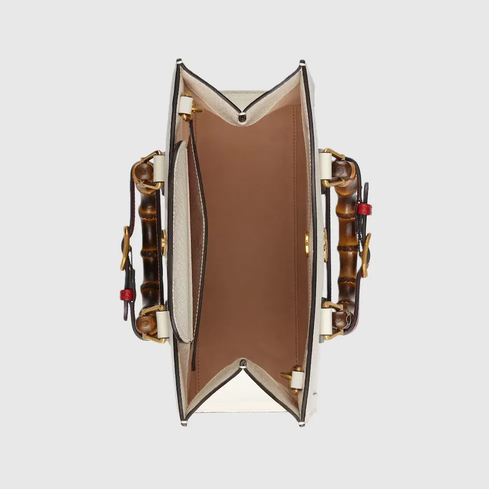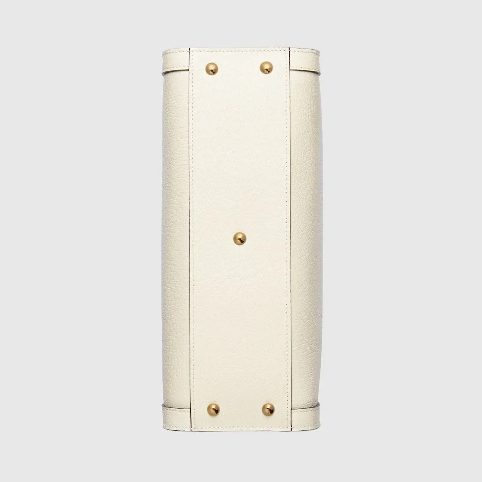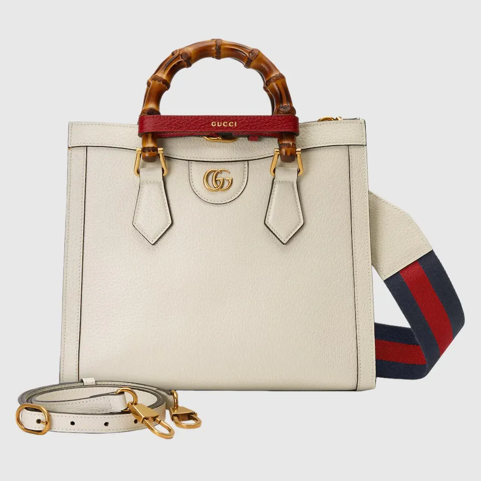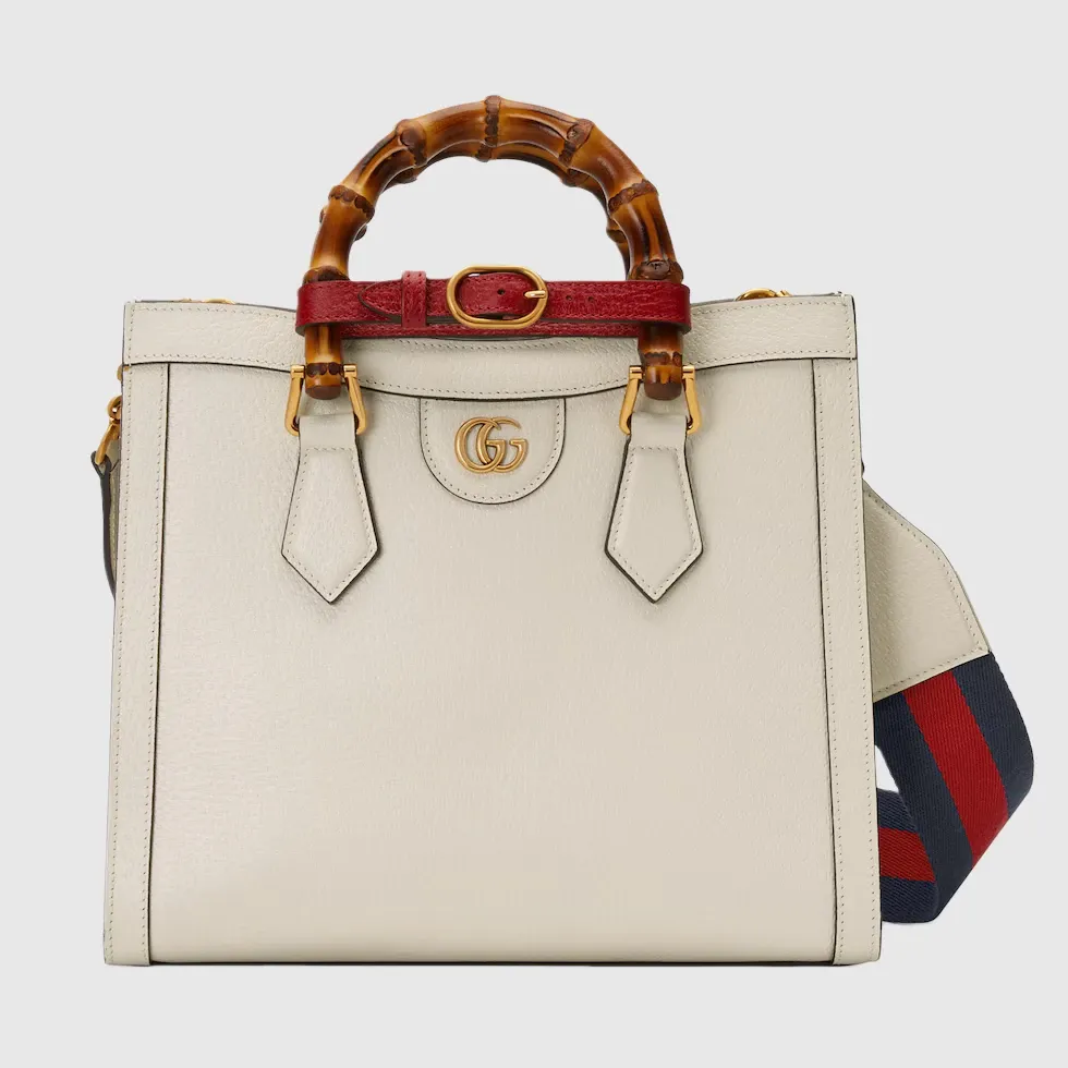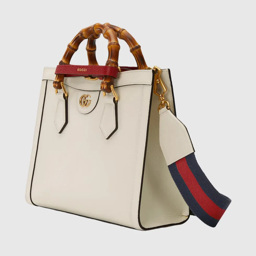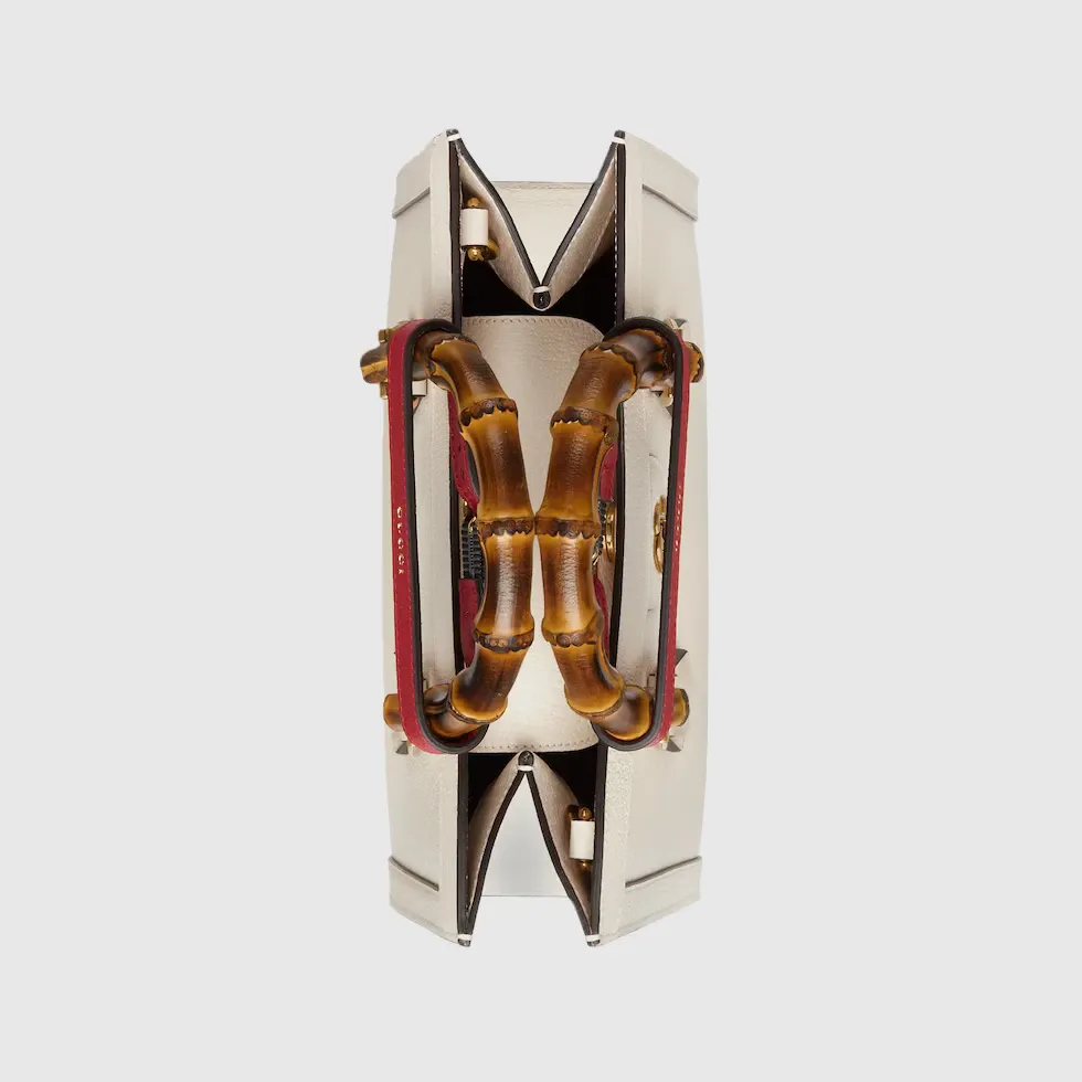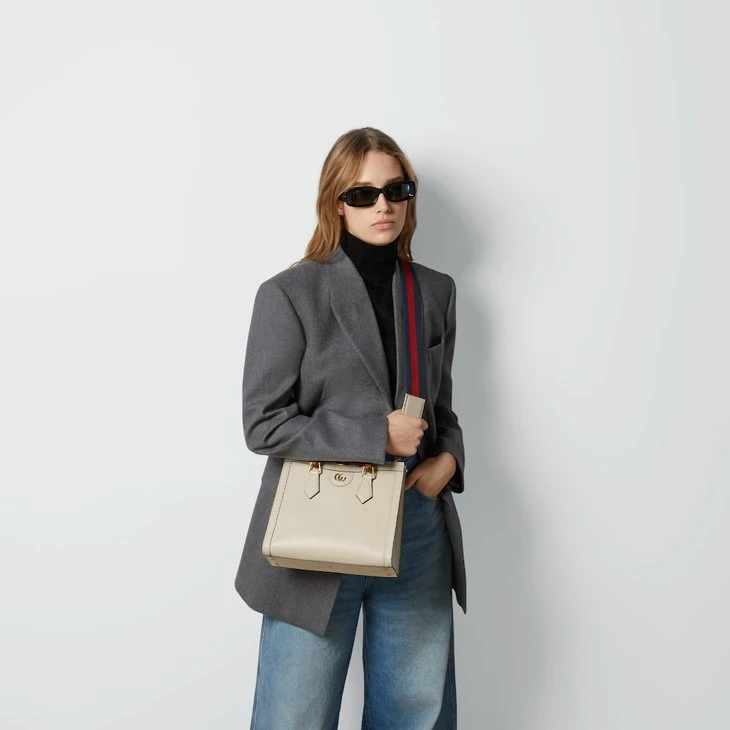 The concept of reinvention continues to shape the House’s designs. An evolution of a bamboo handle tote first introduced in 1991, the Gucci Diana represents the notion of style in constant evolution. The design plays with traditional details and renews them new meaning. Playing with this idea, the functional bands used to keep bamboo handles in shape are reimagined as playful leather belts. Here, the tote is introduced in white leather.Double G