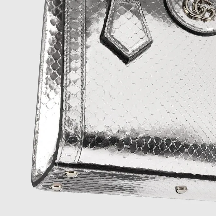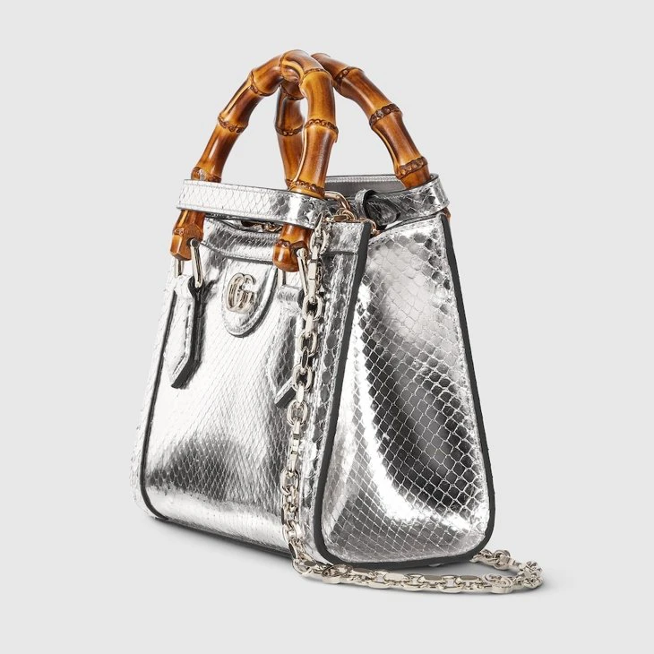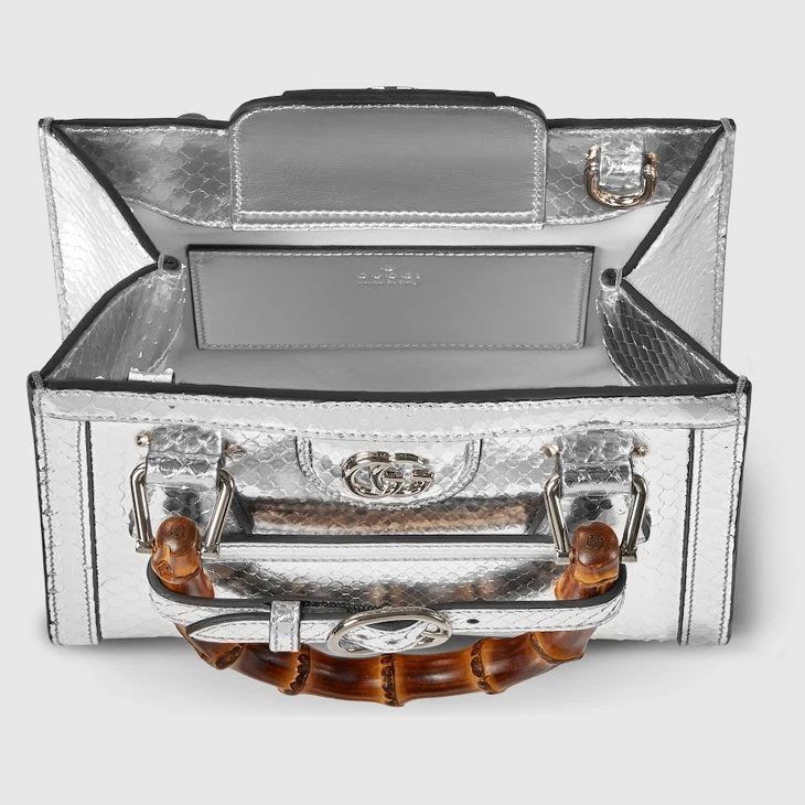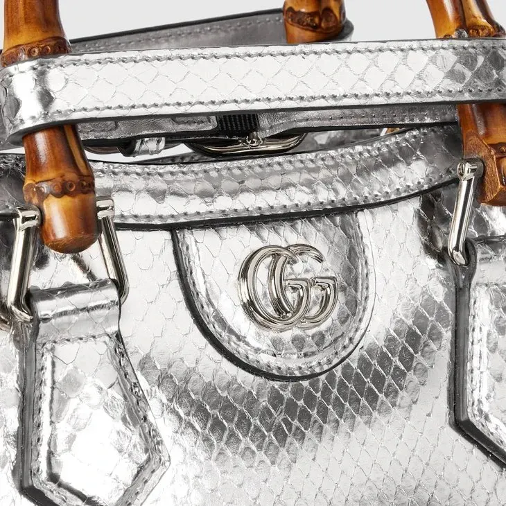 The Gucci Diana tote bag blends recognizable elements of the House, such as the bamboo handles and Double G hardware. This style is crafted from silver-toned python, and can be worn crossbody with the detachable and adjustable shoulder strap.Silver-toned python