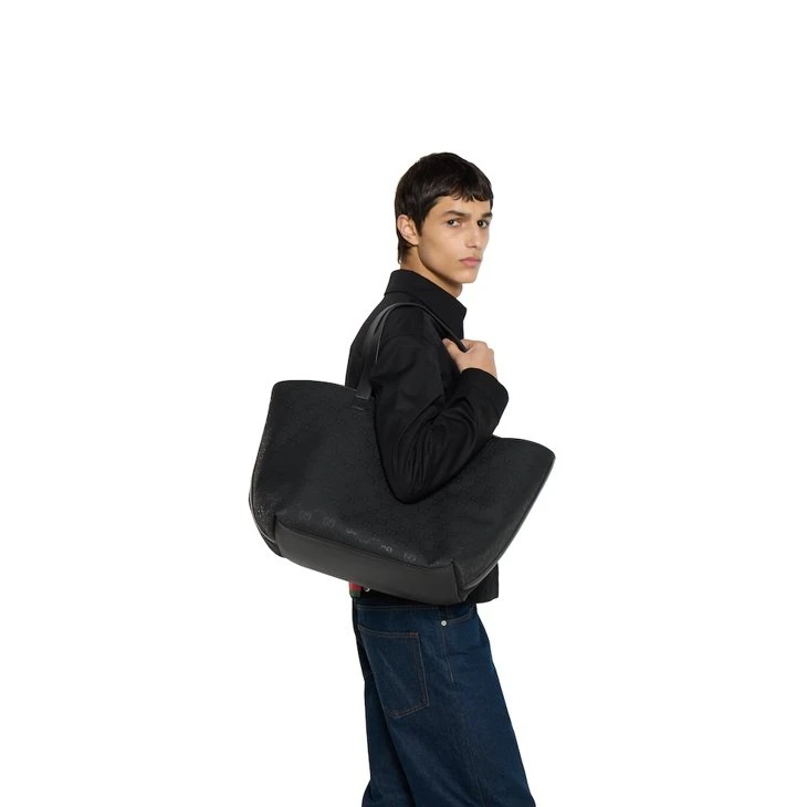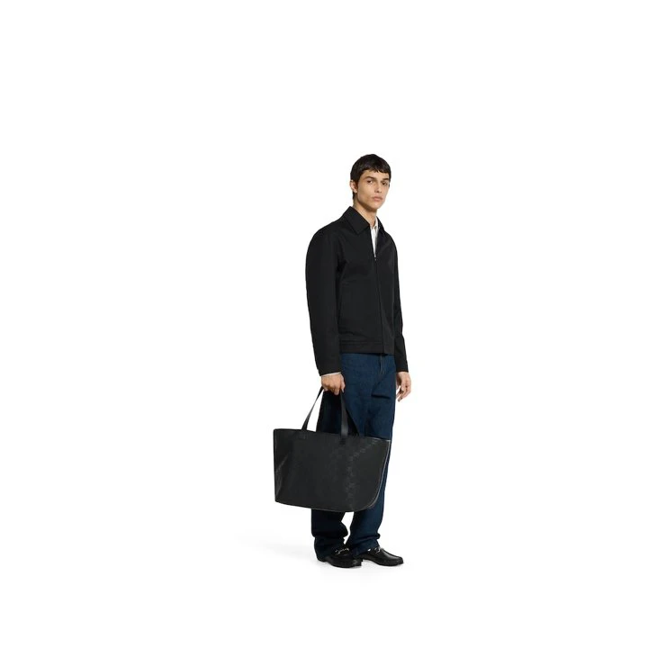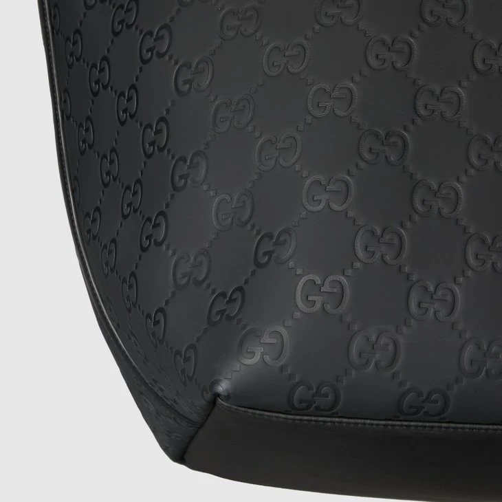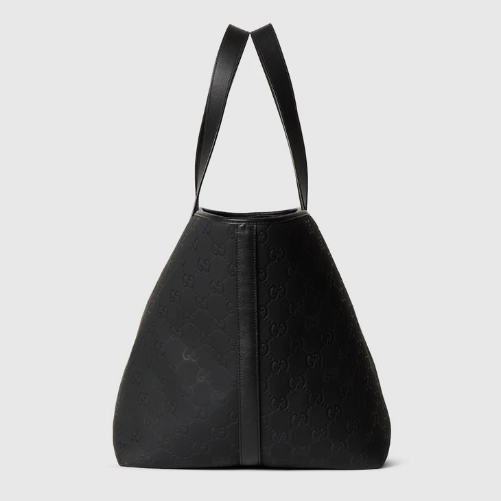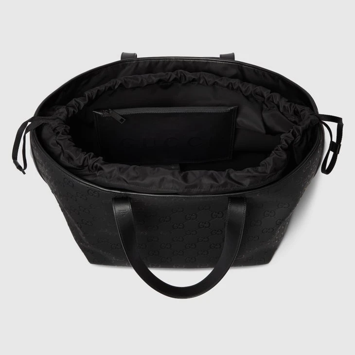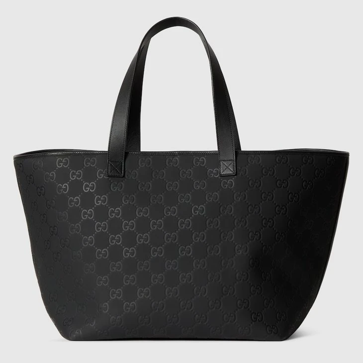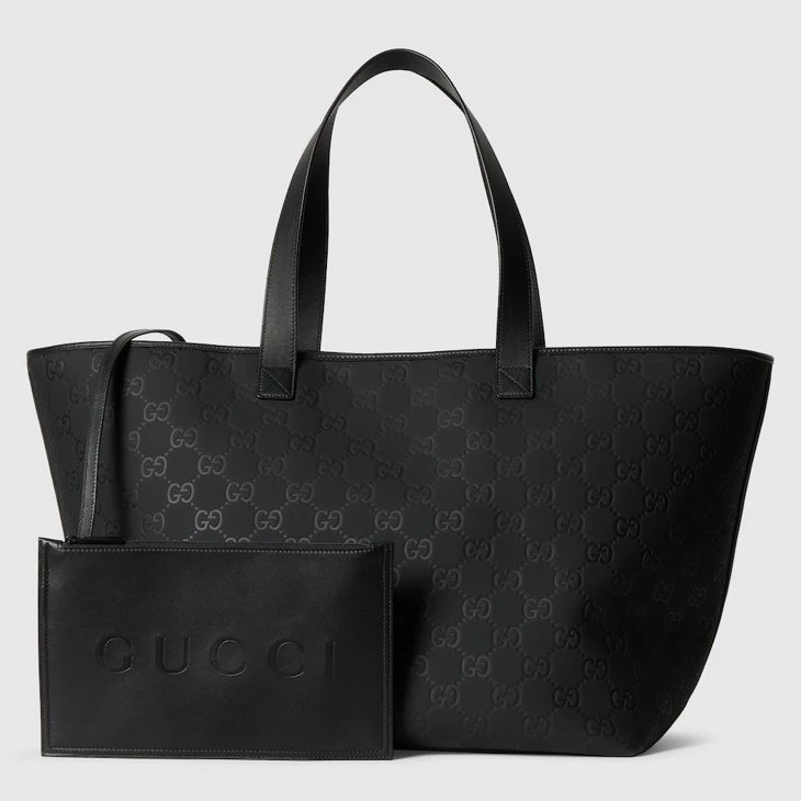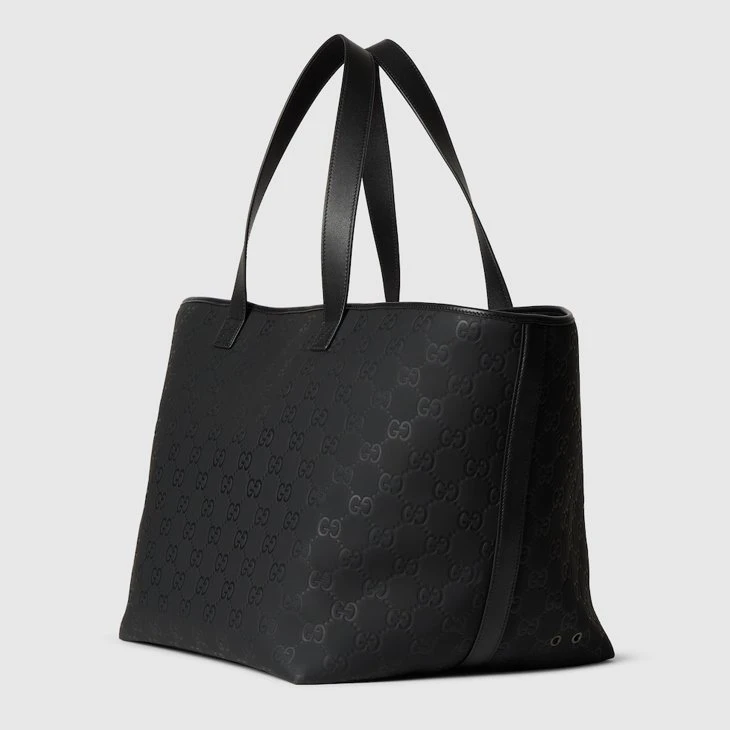 The name Gucci Edge captures the energy of streamlined silhouettes as innovative material meets lightweight adaptability, marked by the subtle GG monogram. This large tote bag is stated in a GG matte rubber fabric and comes complete with a detachable Gucci logo pouch.Black GG matte rubber fabric