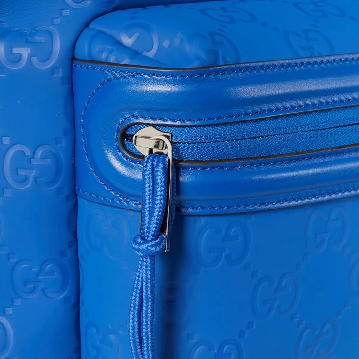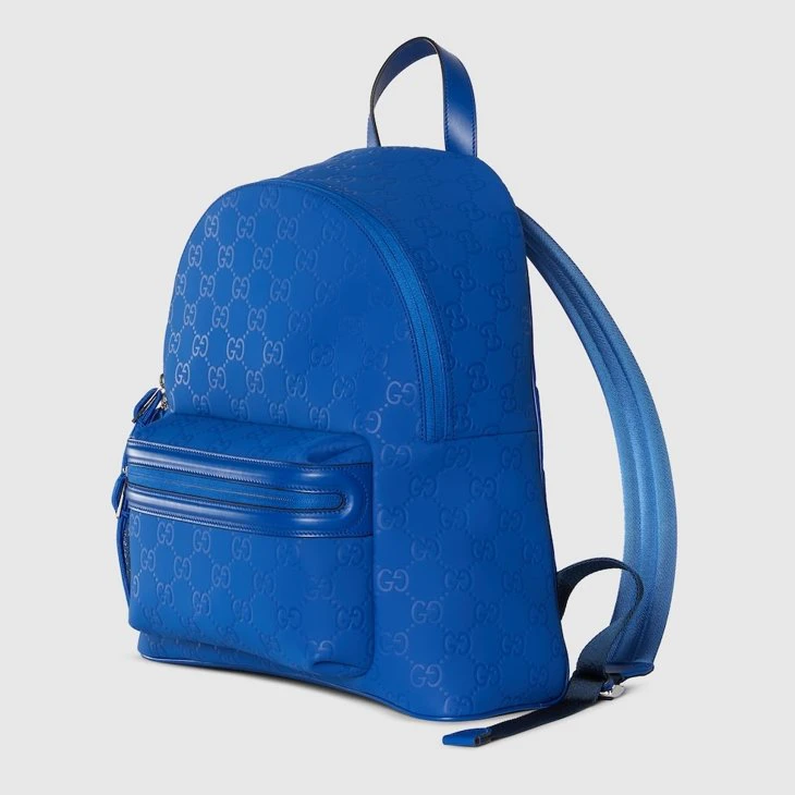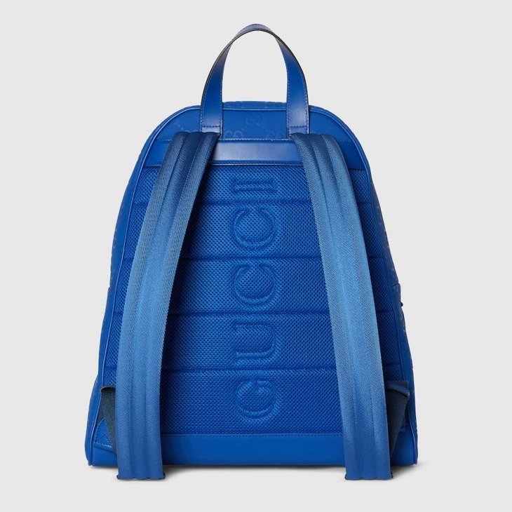 The name Gucci Edge captures the energy of streamlined silhouettes as innovative material meets lightweight adaptability, marked by the subtle GG monogram. This backpack is stated in a GG matte rubber fabric and reveals a Gucci logo detail across the padded mesh back.Bright blue GG matte rubber fabric