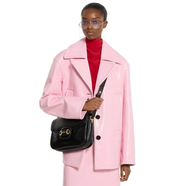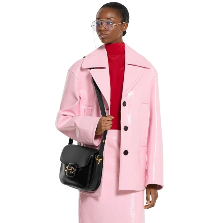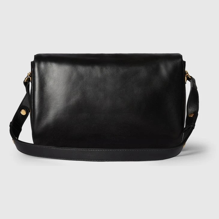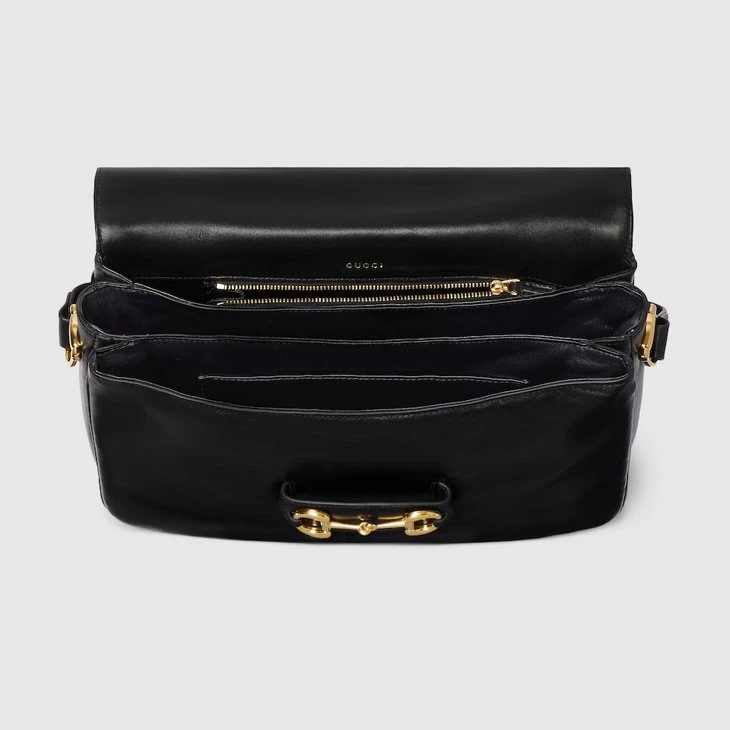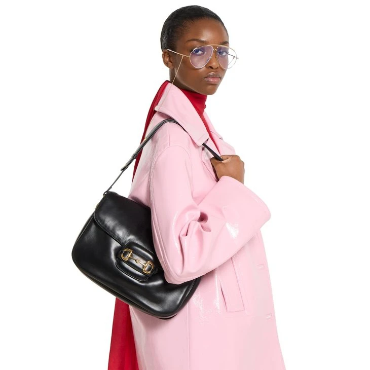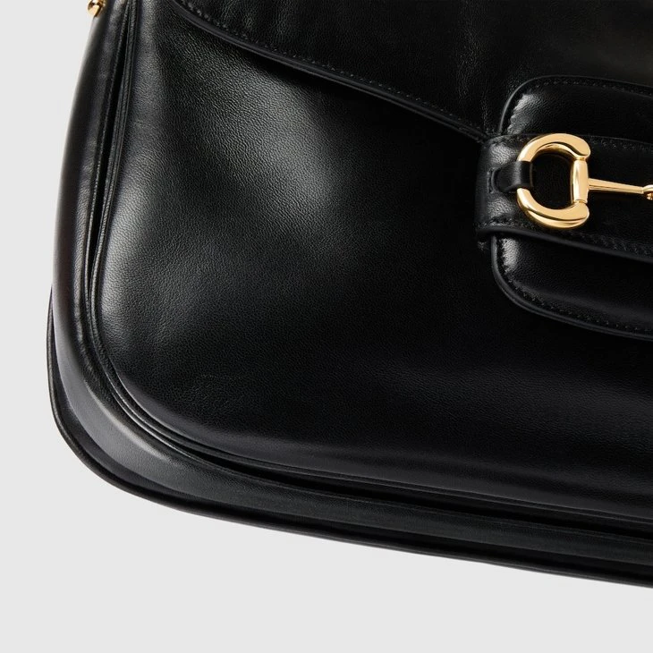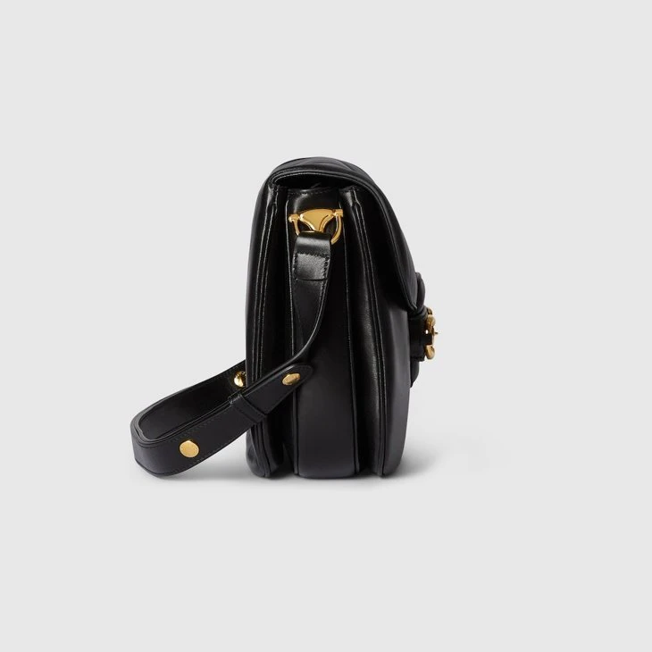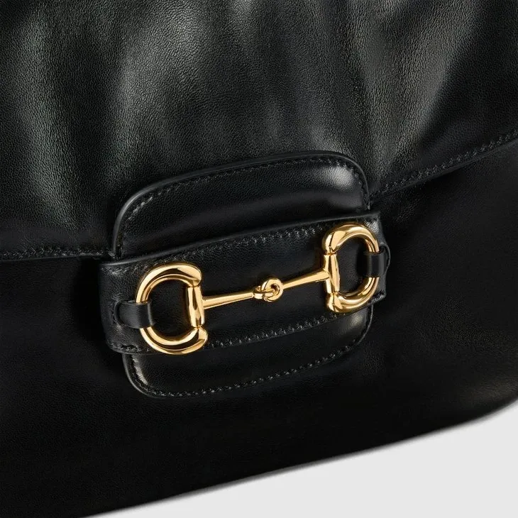 In the Fall Winter 2025 collection, the Gucci Horsebit 1955 continues its equestrian-inspired design with the double ring and bar hardware, blending light gold-toned details and soft, smooth leather on this shoulder bag.Black soft leather