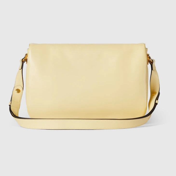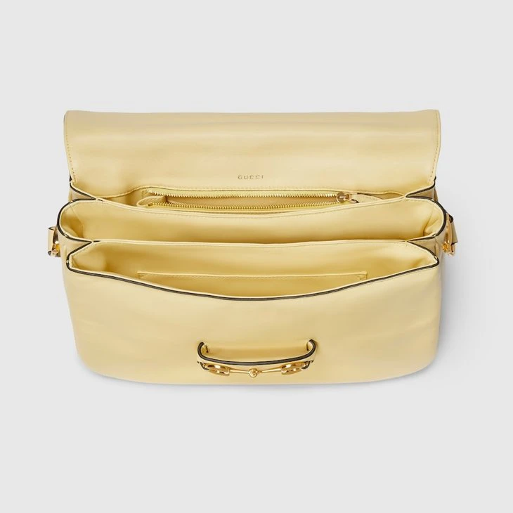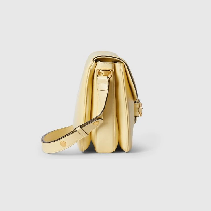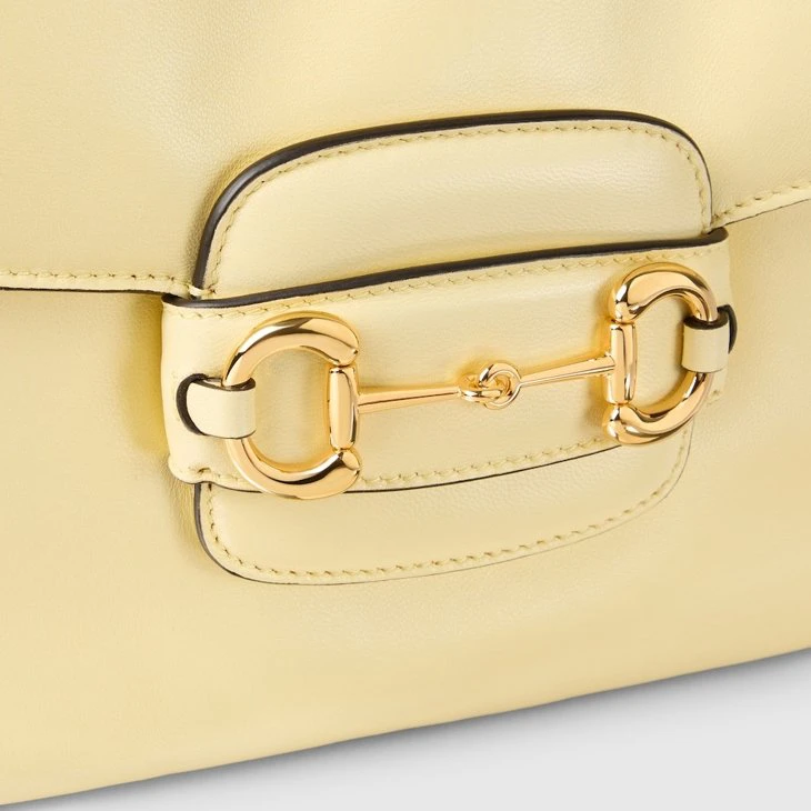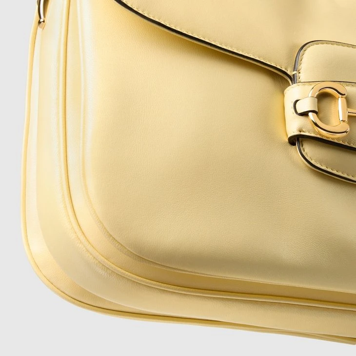In the Fall Winter 2025 collection, the Gucci Horsebit 1955 continues its equestrian-inspired design with the double ring and bar hardware, blending light gold-toned details and soft, smooth leather on this shoulder bag.Yellow soft leather