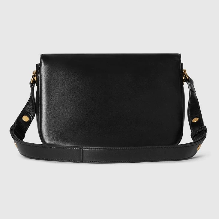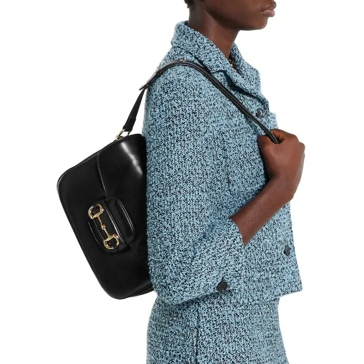 In the Fall Winter 2025 collection, the Gucci Horsebit 1955 continues its equestrian-inspired design with the double ring and bar hardware, blending light gold-toned details and soft, smooth leather on this shoulder bag.Black soft leather