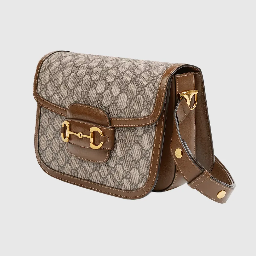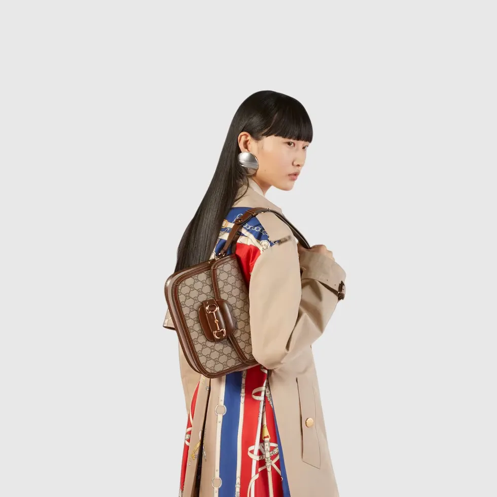 Part of Gucci’s genetic code, the double ring and bar design has been established as one of the most distinctive elements among the House symbols borrowed from the equestrian world. Presented on a small flap shoulder bag, the hardware is paired with the House’s monogram fabric.Beige/dark brown GG Supreme, with brown leather trim