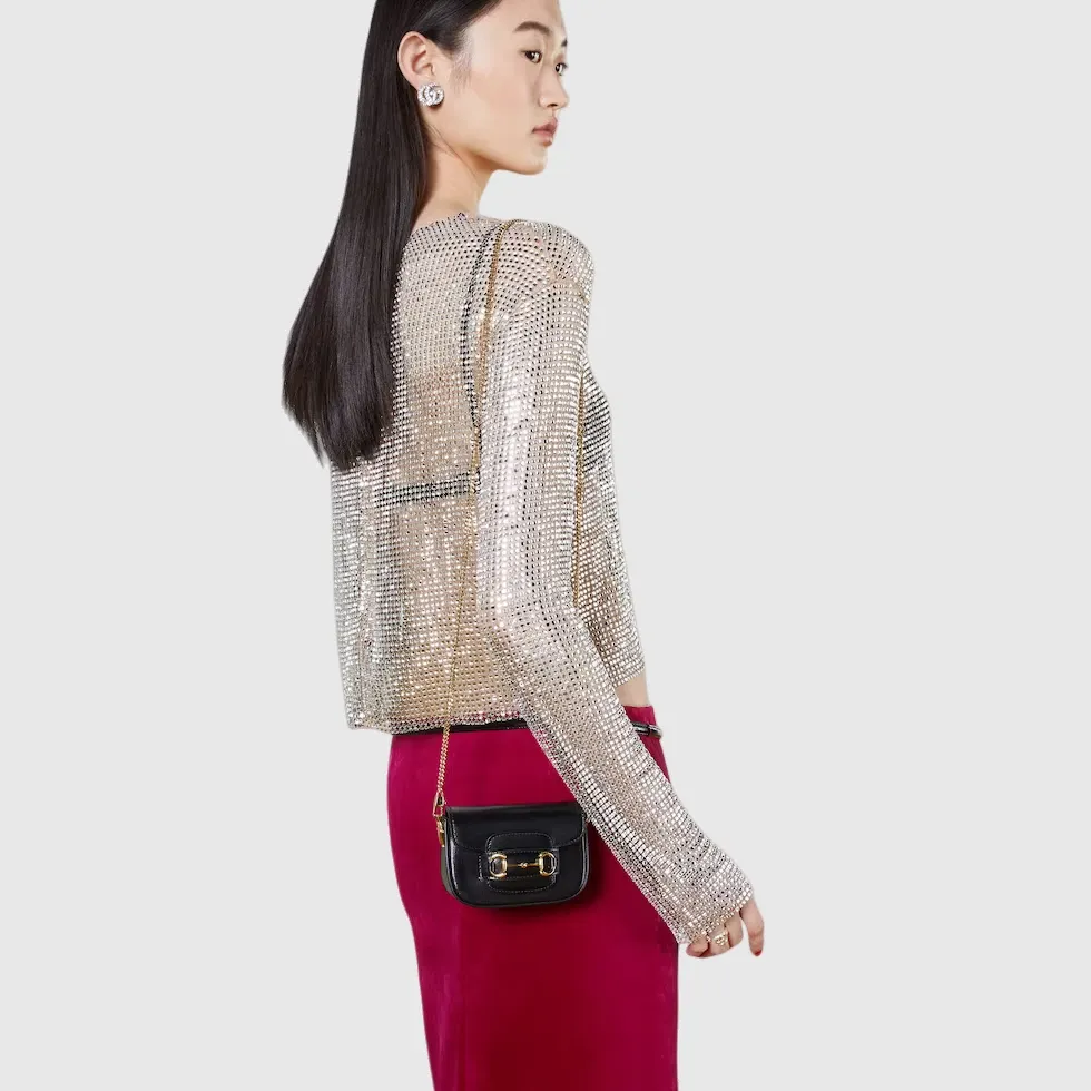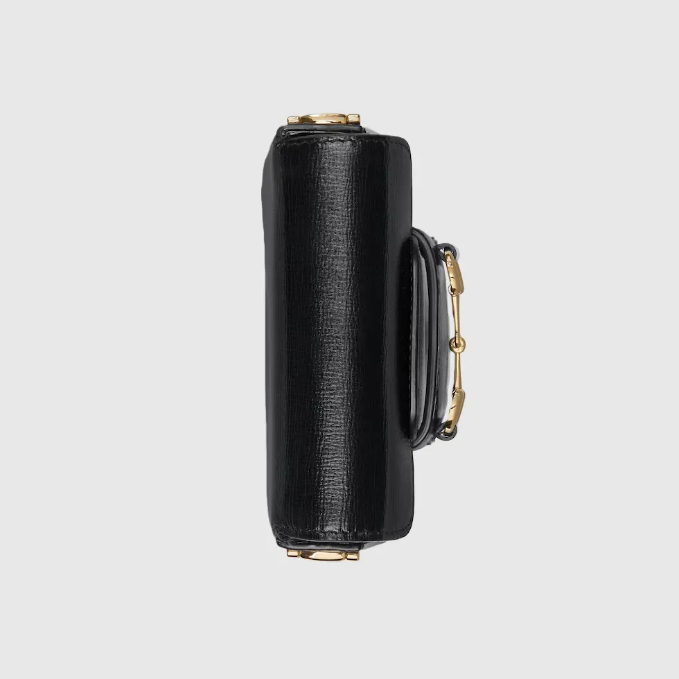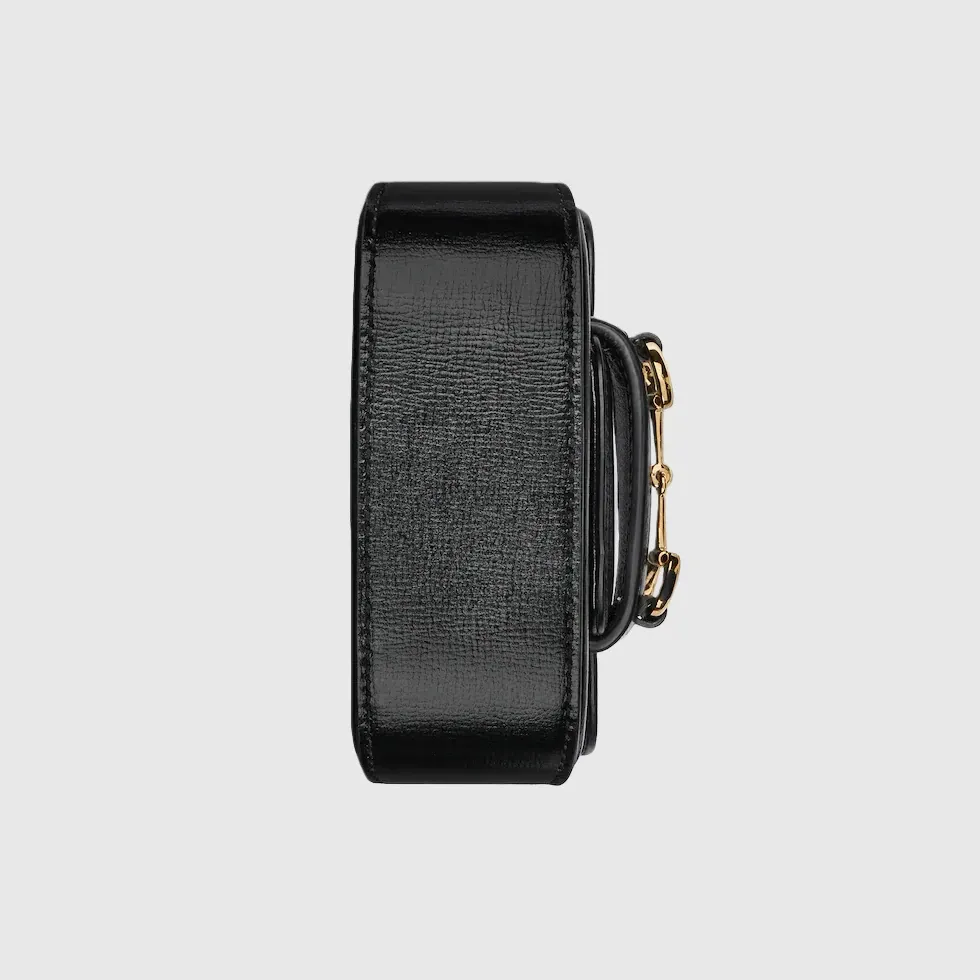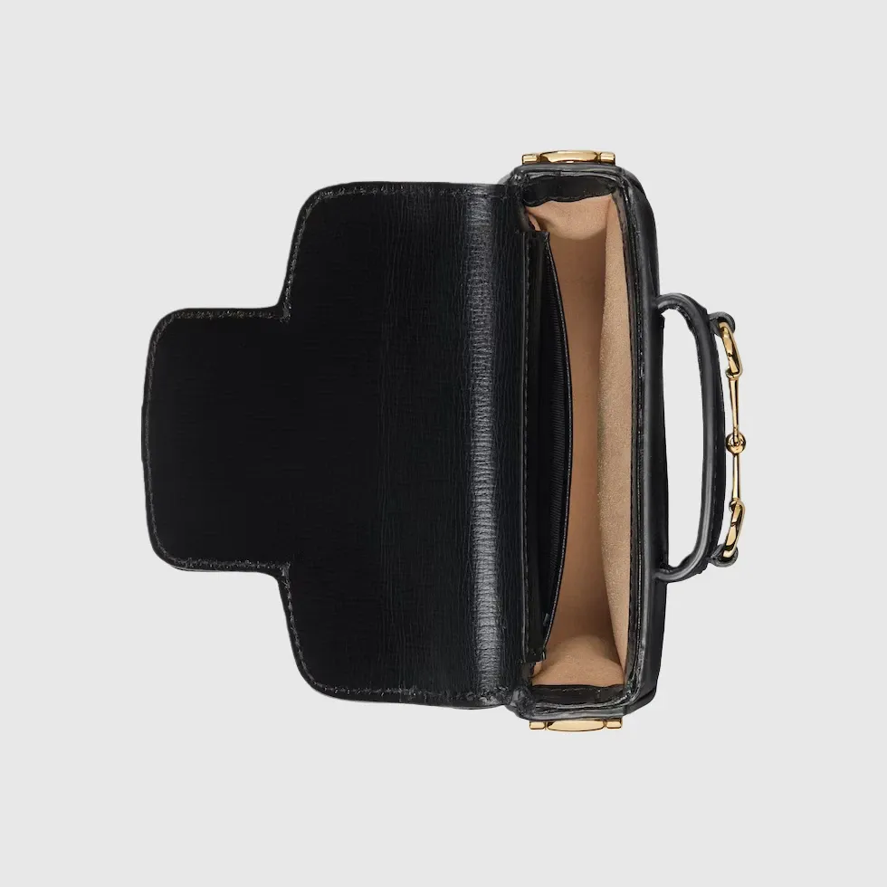 Signature Gucci designs go miniature for Fall Winter 2023. Featuring the same unmistakable hardware and finishes, this black leather Gucci Horsebit 1955 is a playful variation of the original dimensions. With multiple ways to style it, the design is seamlessly integrated into everyday wear.Black leather