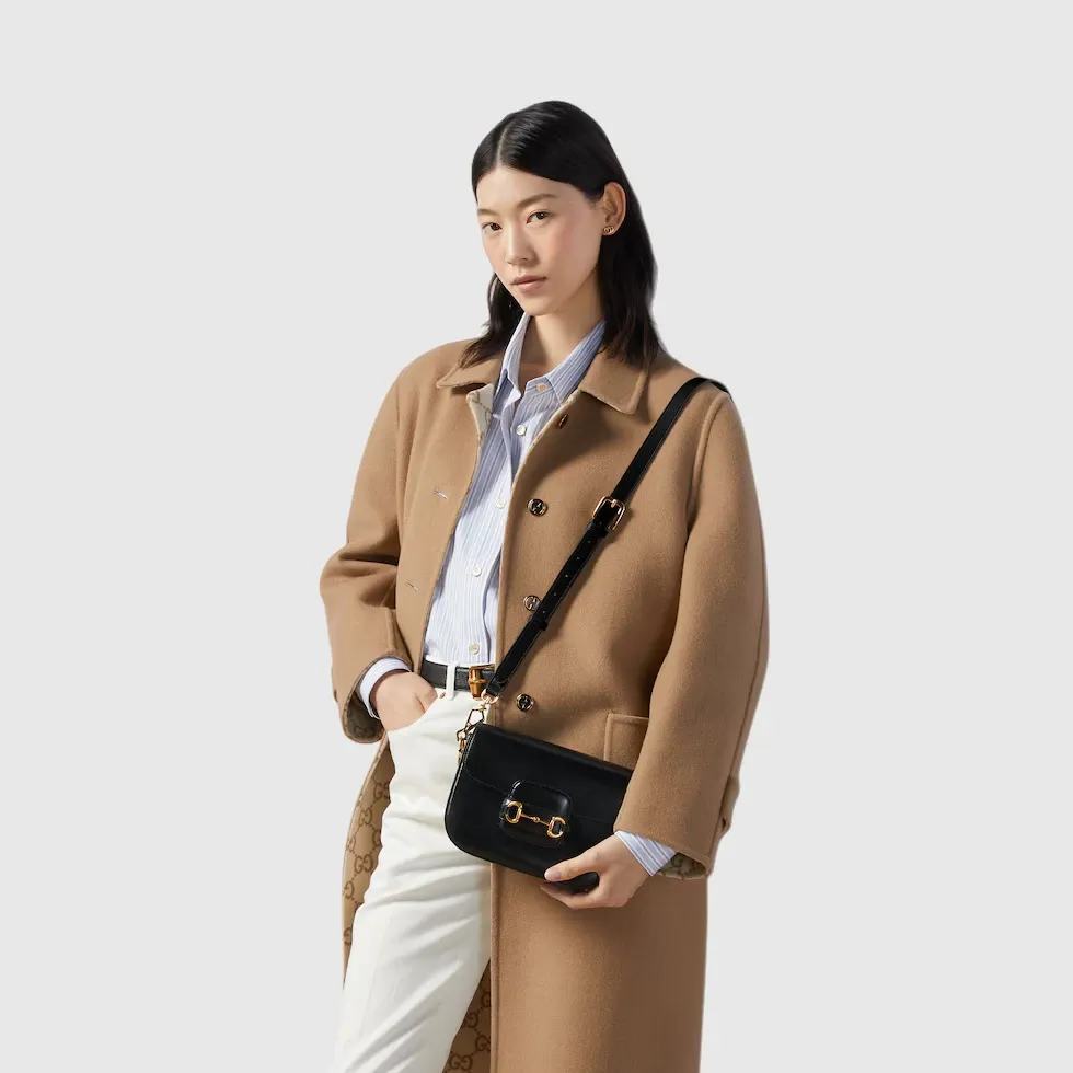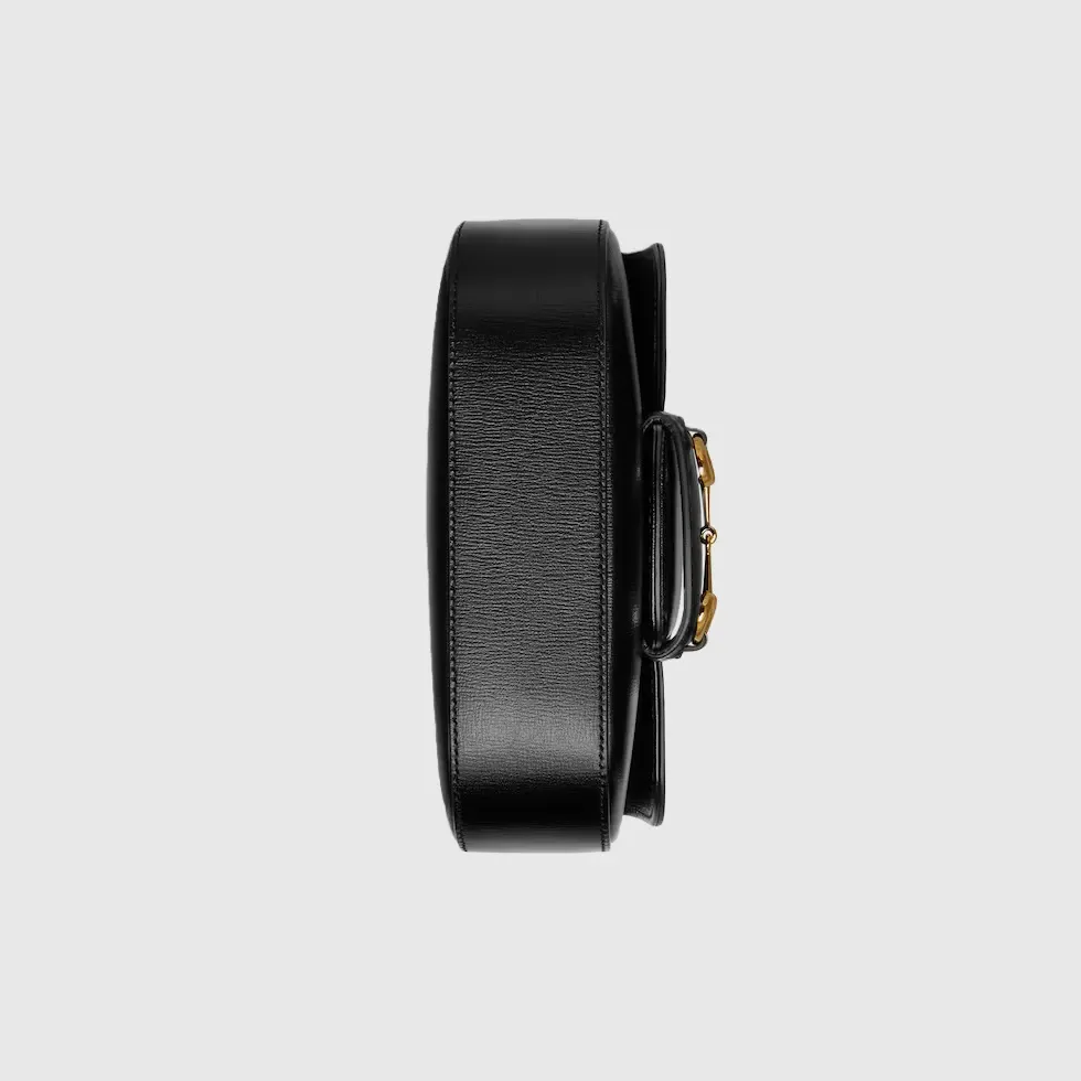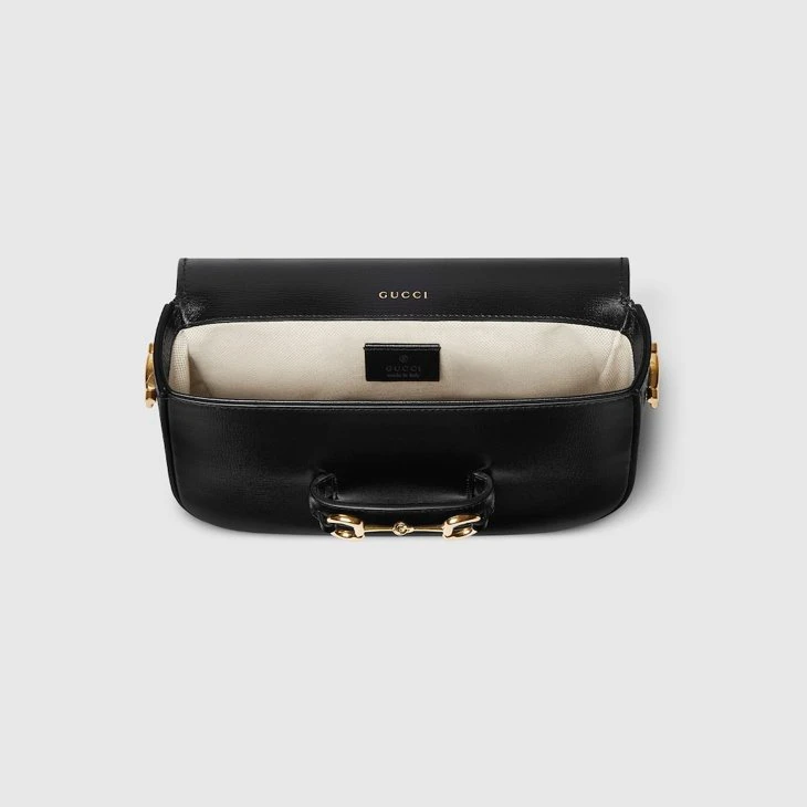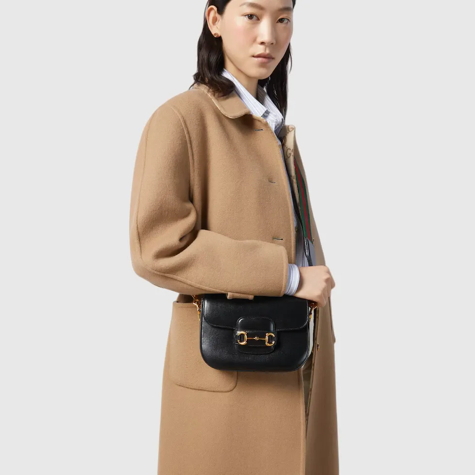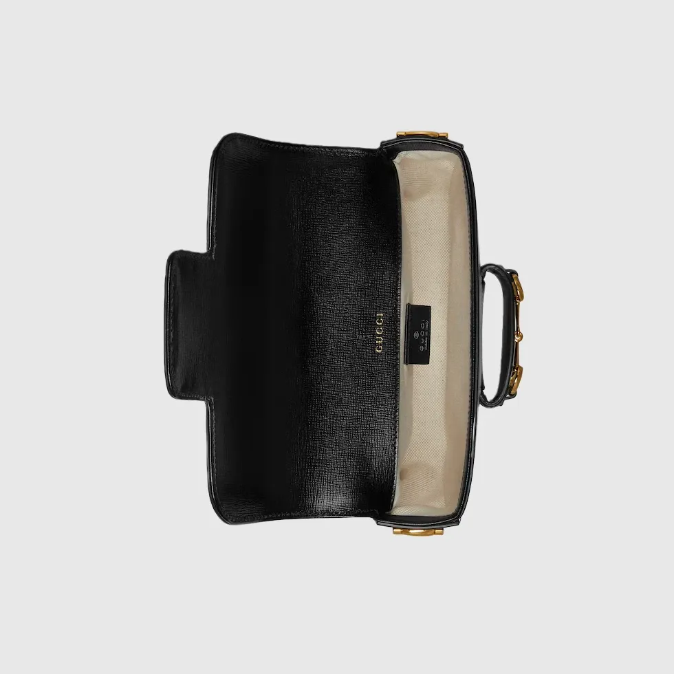 Small versions of the Gucci Horsebit 1955 add a contemporary twist to the vintage inspired line. Enriched with two different shoulder straps, the bag transforms from understated elegance with a tonal leather strap to a strong logo feel thanks to a red and green Web option.Black leather