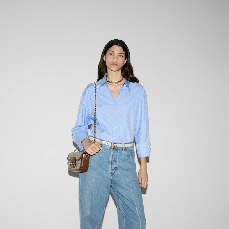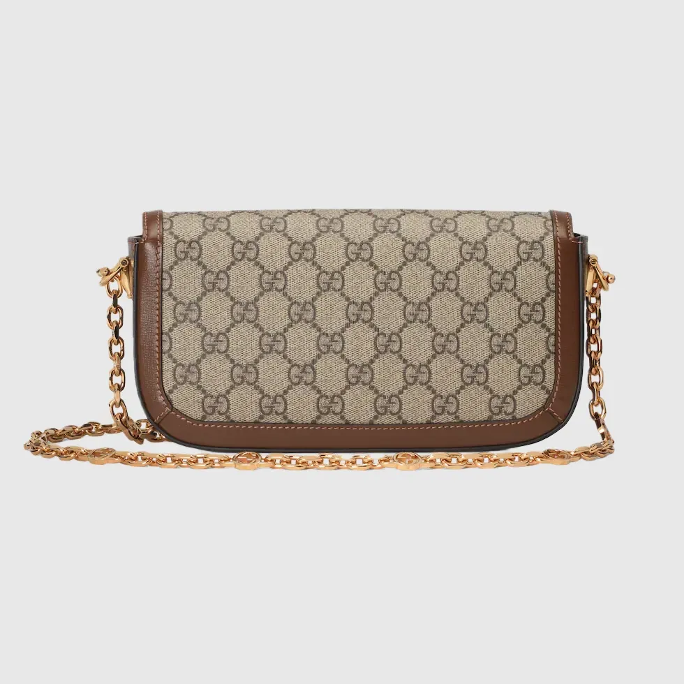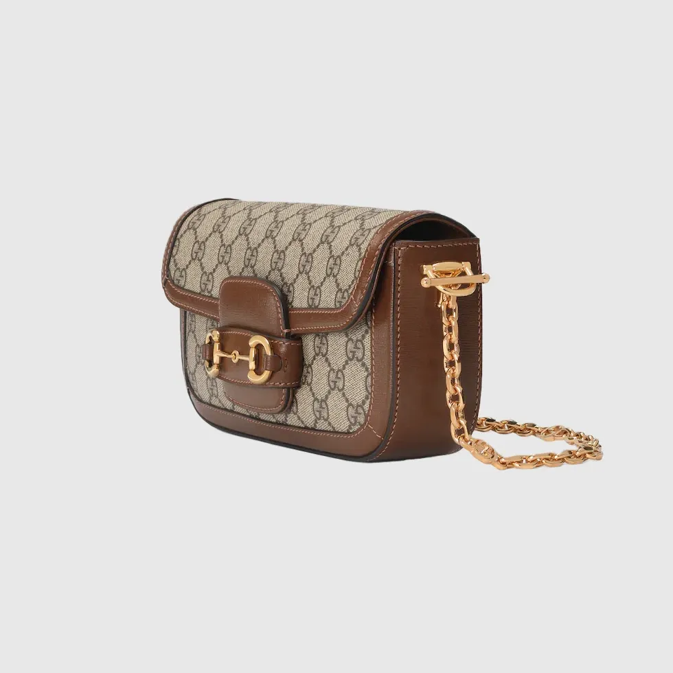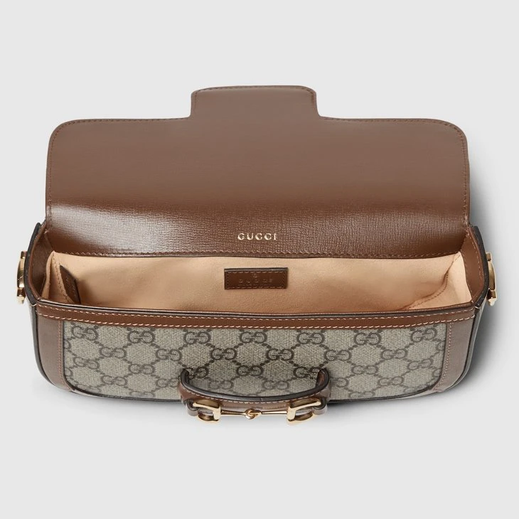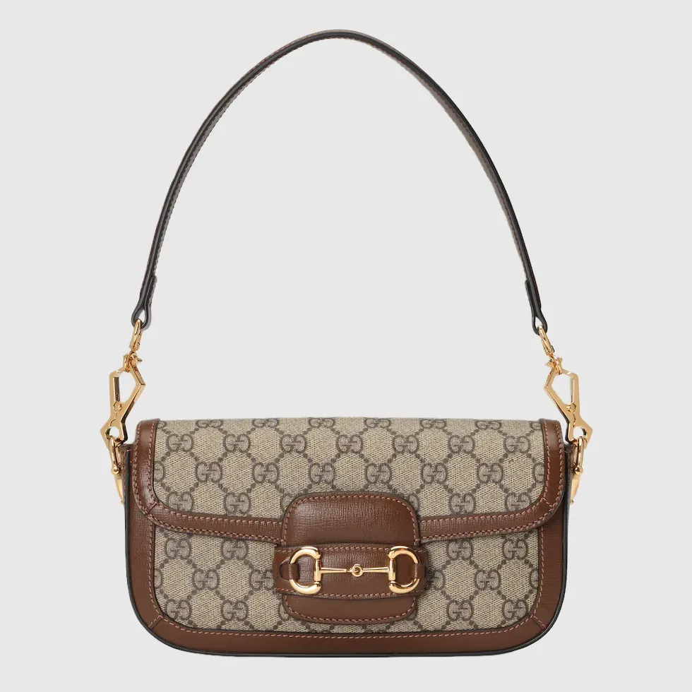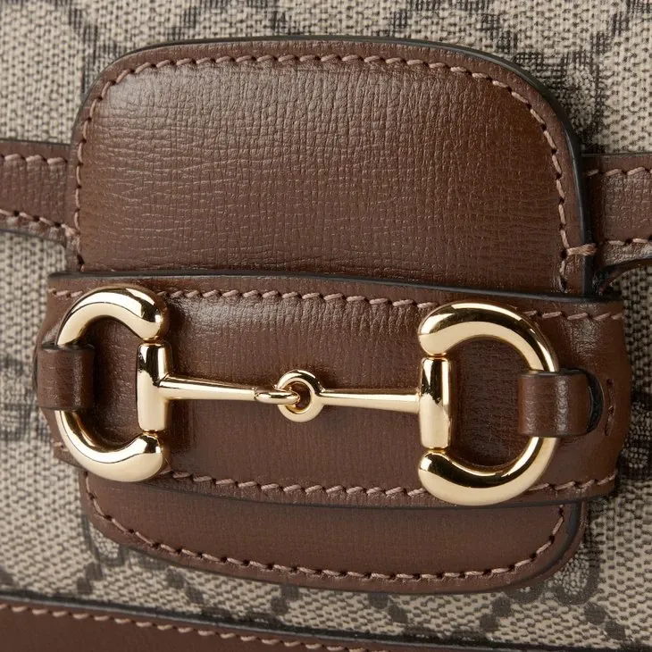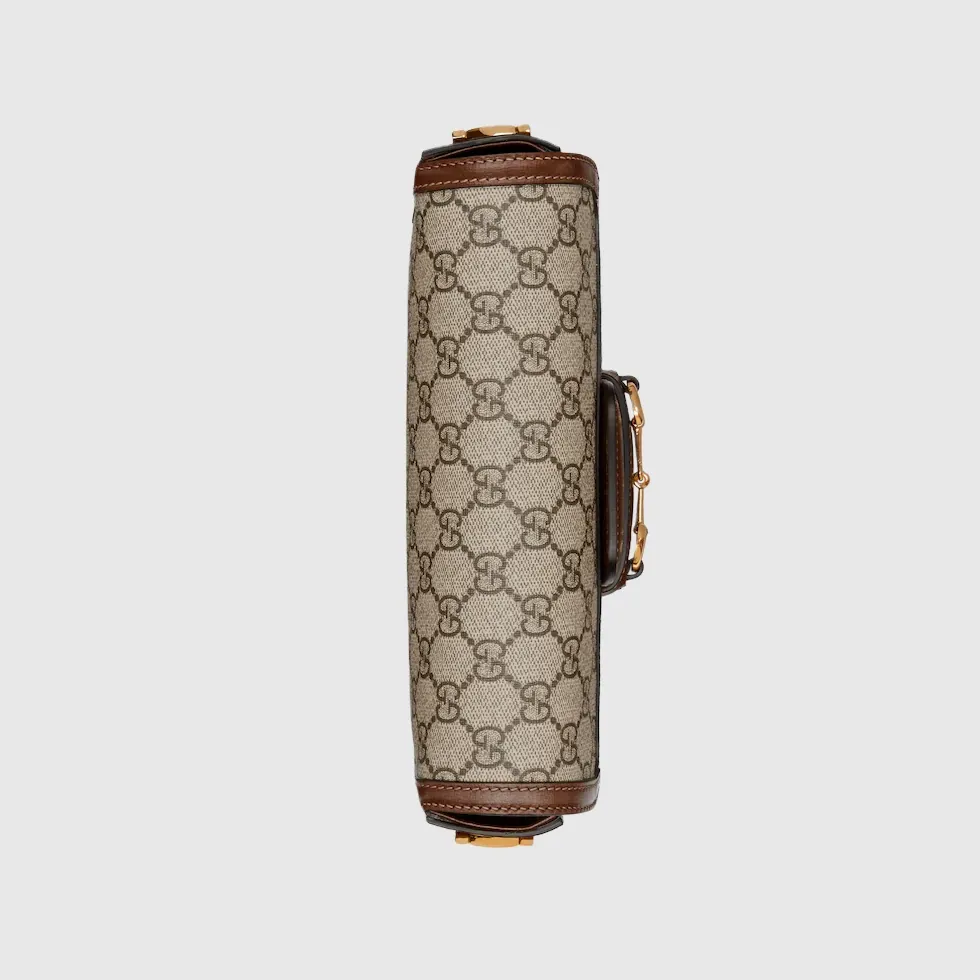 Inspired by archival designs, the Gucci Horsebit 1955 collection unifies the original details first introduced over six decades ago with a modern spirit, highlighting the Horsebit. Part of Gucci’s genetic code, the double ring and bar design has been established as one of the most distinctive elements among the House symbols borrowed from the equestrian world.Beige/ebony GG Supreme, with brown leather trim