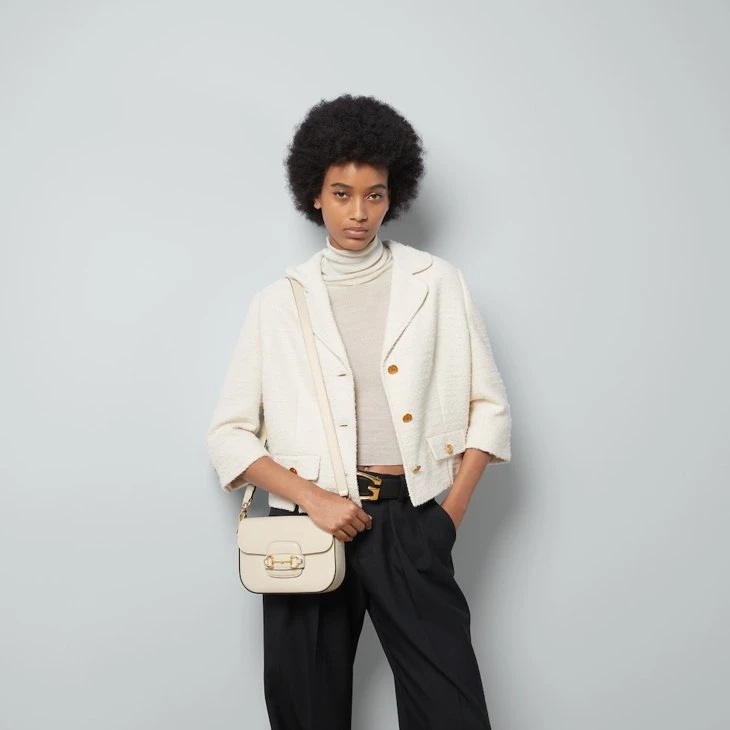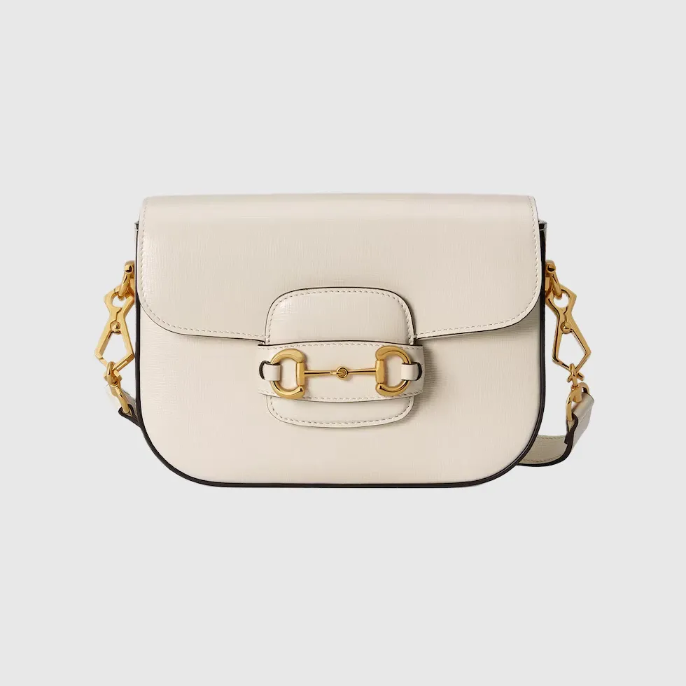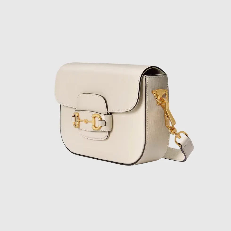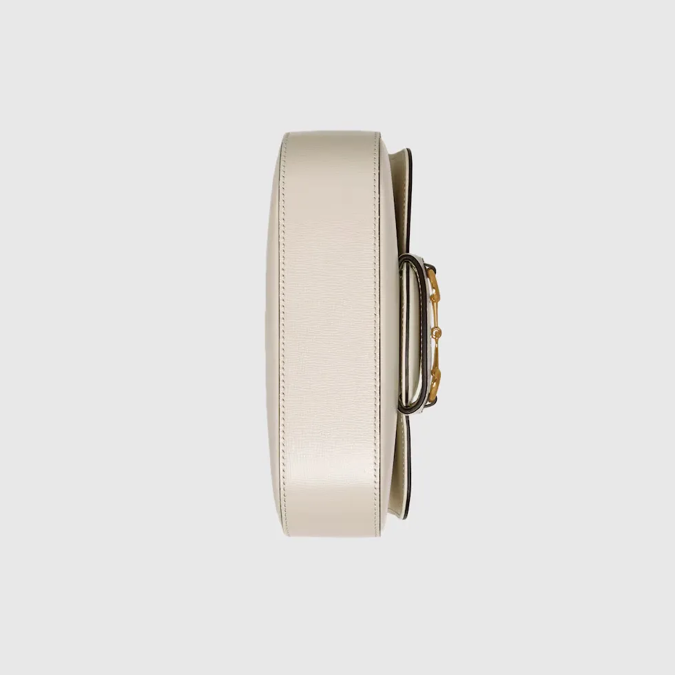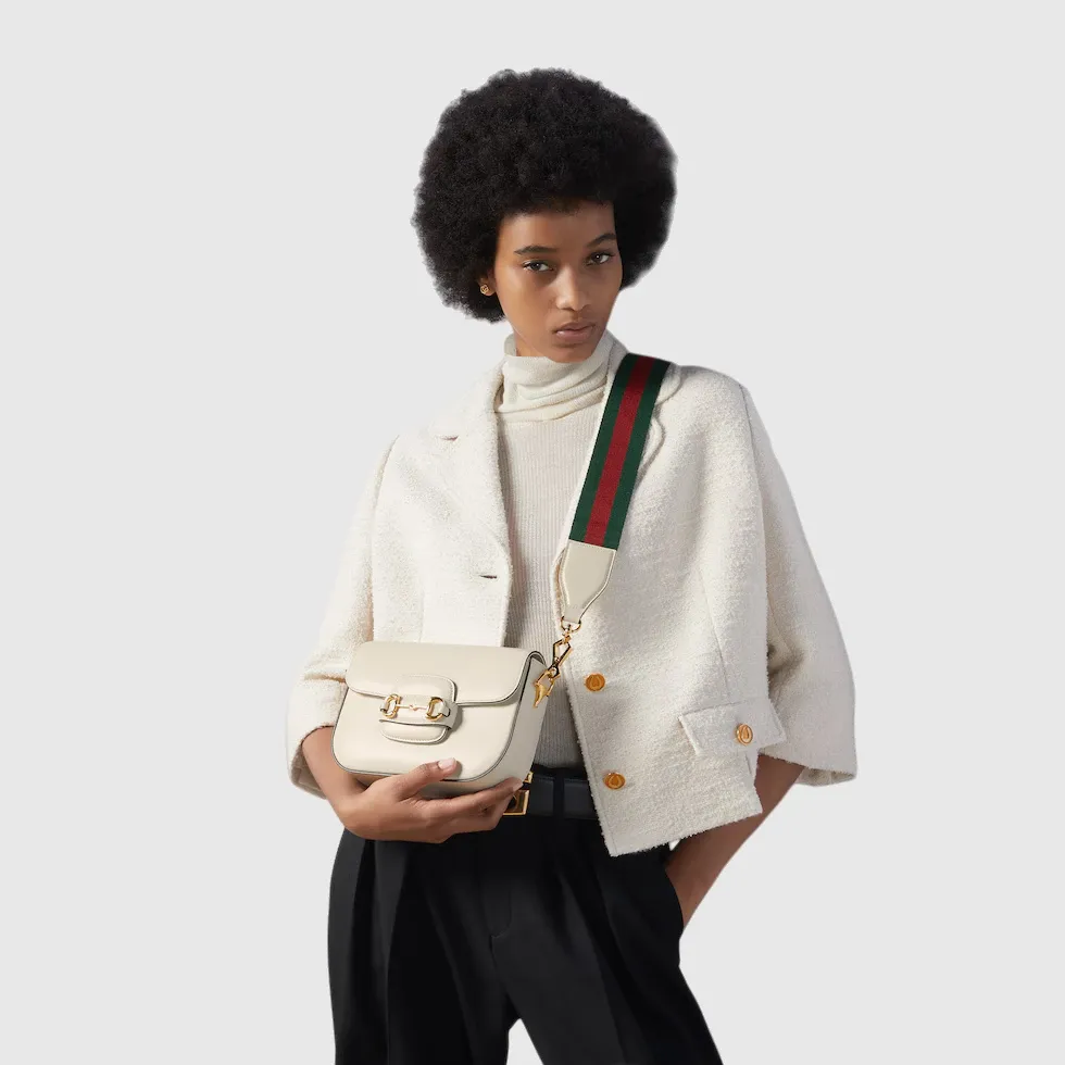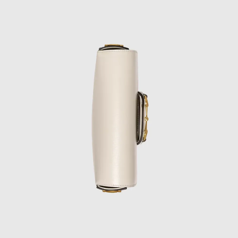 Small versions of the Gucci Horsebit 1955 add a contemporary twist to the vintage inspired line. Enriched with two different shoulder straps, the bag transforms from understated elegance with a tonal leather strap to a strong logo feel thanks to a red and green Web option.White leather