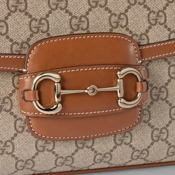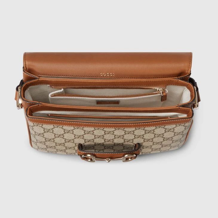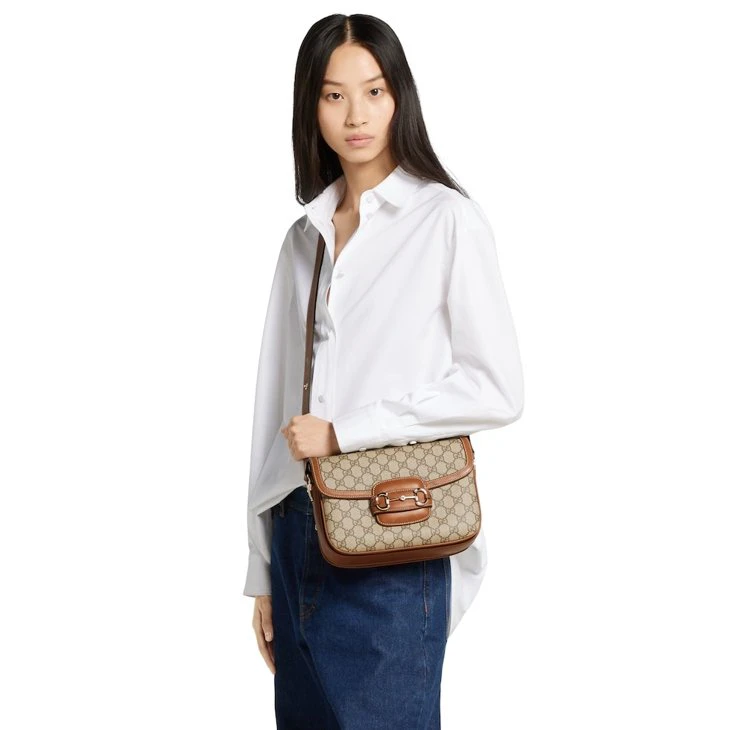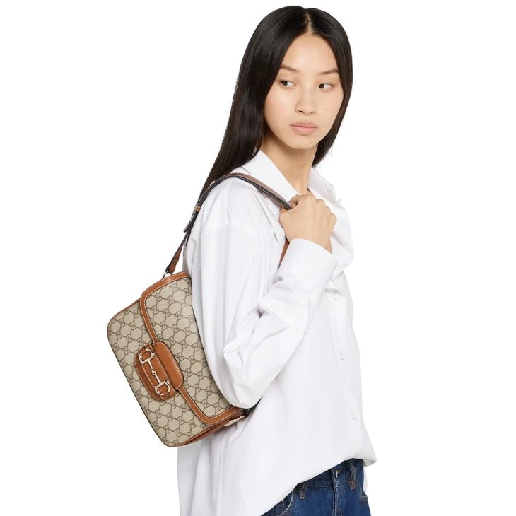 The Gucci Horsebit 1955 continues its equestrian-inspired design with the double ring and bar hardware, blending light gold-toned details and GG Monogram coated fabric, with a soft and sophisticated feel, on this shoulder bag.Beige and dark brown new GG Monogram coated fabric