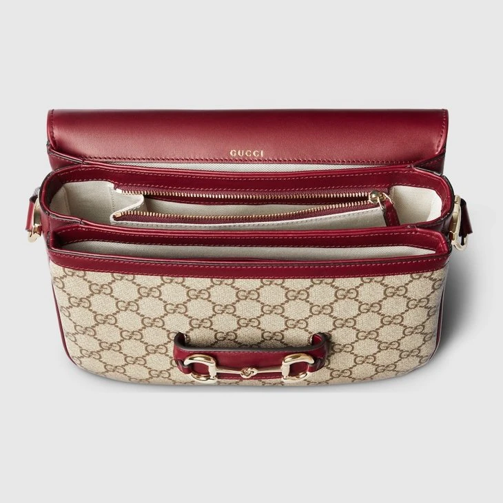 The Gucci Horsebit 1955 Soft continues to highlight its signature double ring and bar hardware. This shoulder bag style is crafted from the new GG Monogram coated fabric, which has gone through a unique heat embossing process to create the motif and a soft, sophisticated feel.Beige and dark brown new GG Monogram coated fabric