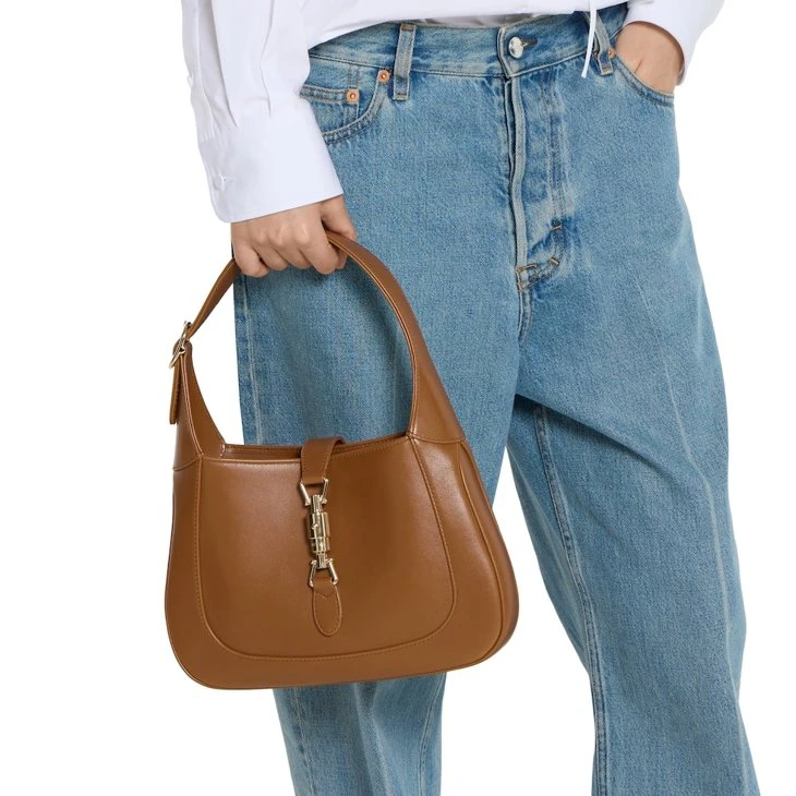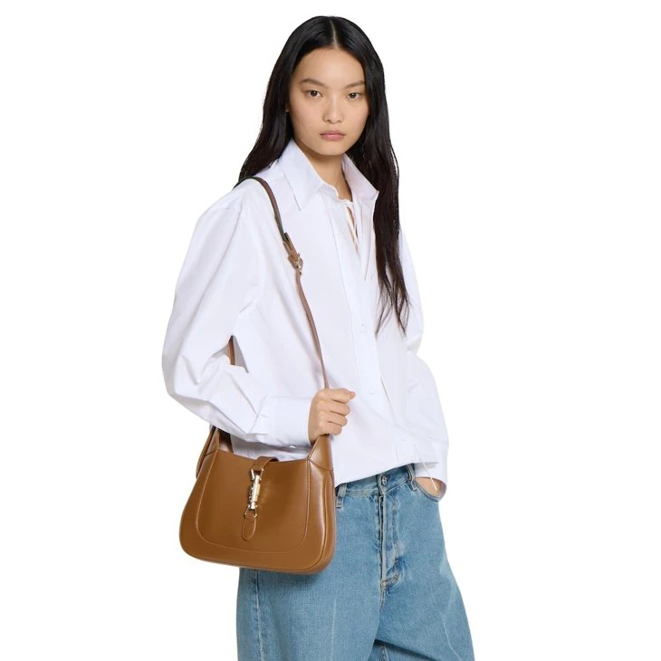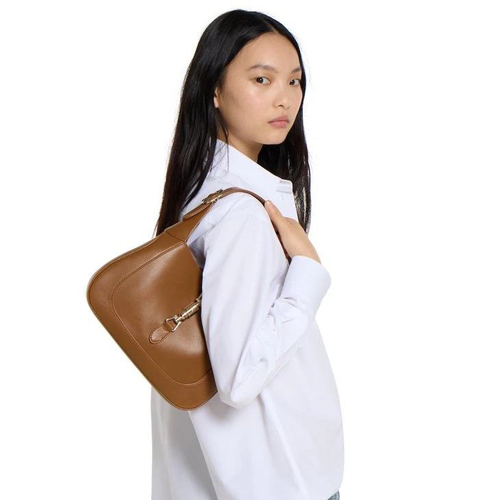 The Gucci Jackie 1961 with its signature piston closure and emblematic shape tells a story that spans eras. The shoulder bag exudes timeless elegance with a contemporary edge.Brown leather