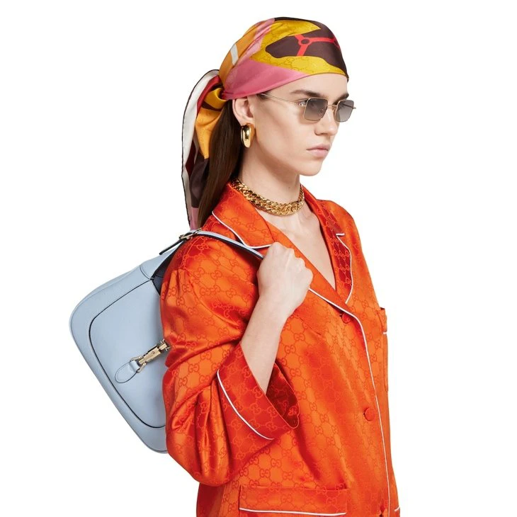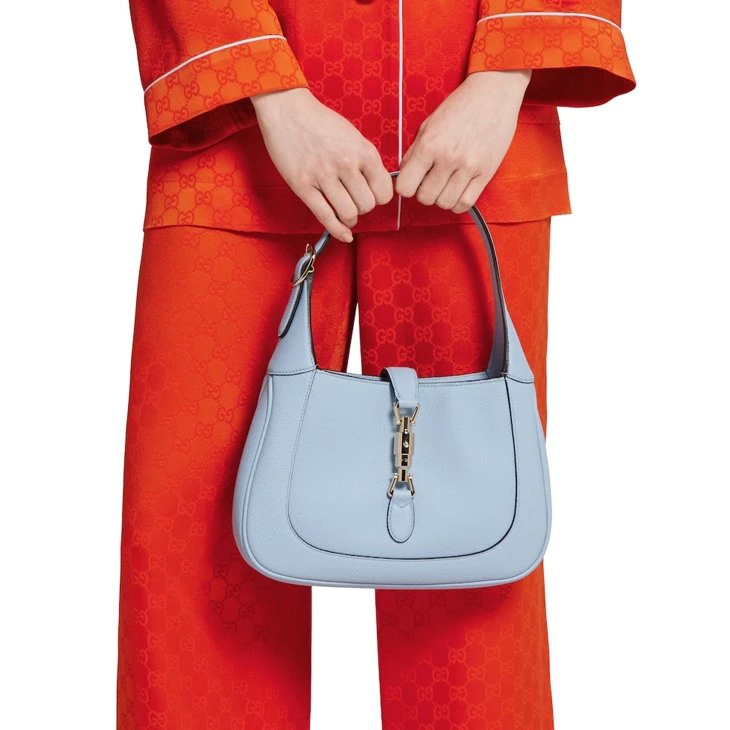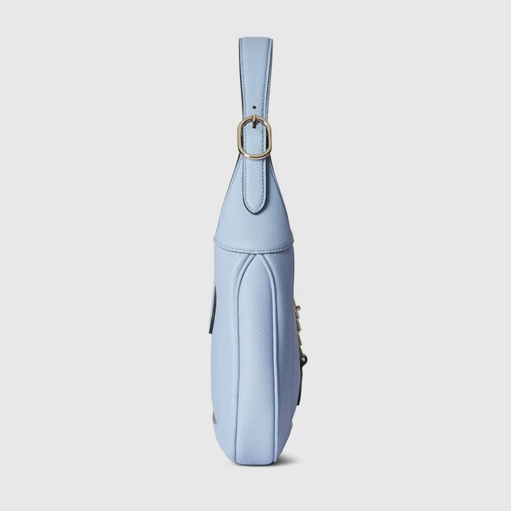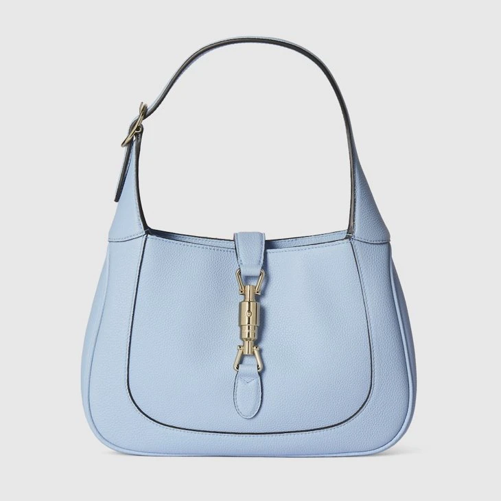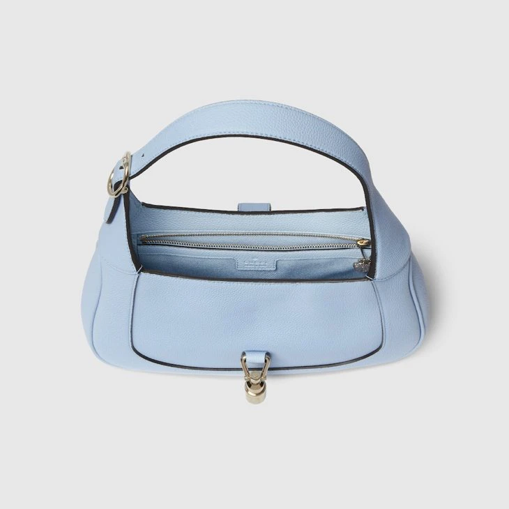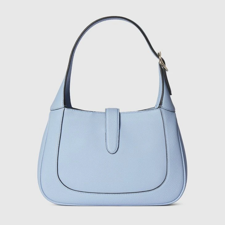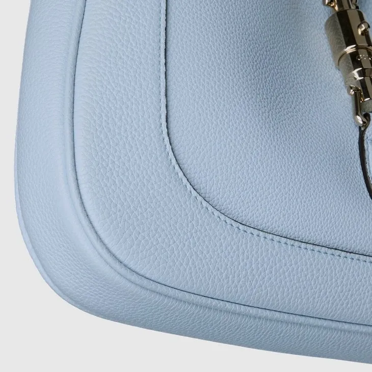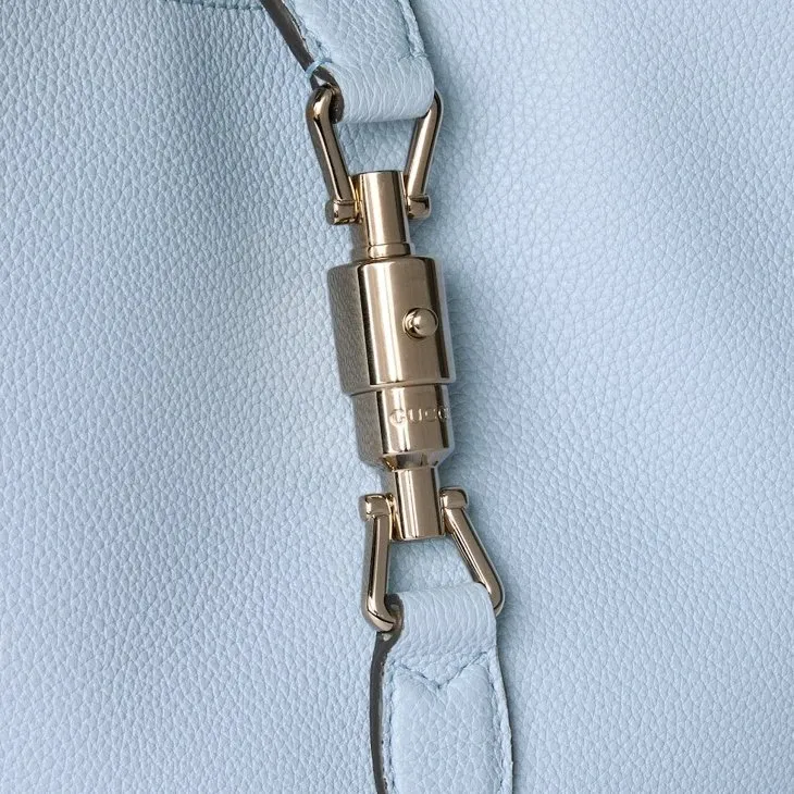The Gucci Jackie 1961 shoulder bag features a light gold-toned piston closure and fine leather that highlights the craftsmanship, crescent shape, and sleek silhouette of the House’s iconic design. This medium size includes a leather strap and an additional Web strap for versatile styling options.Light blue natural grain leather