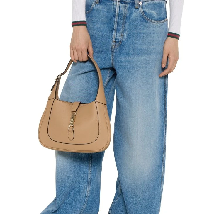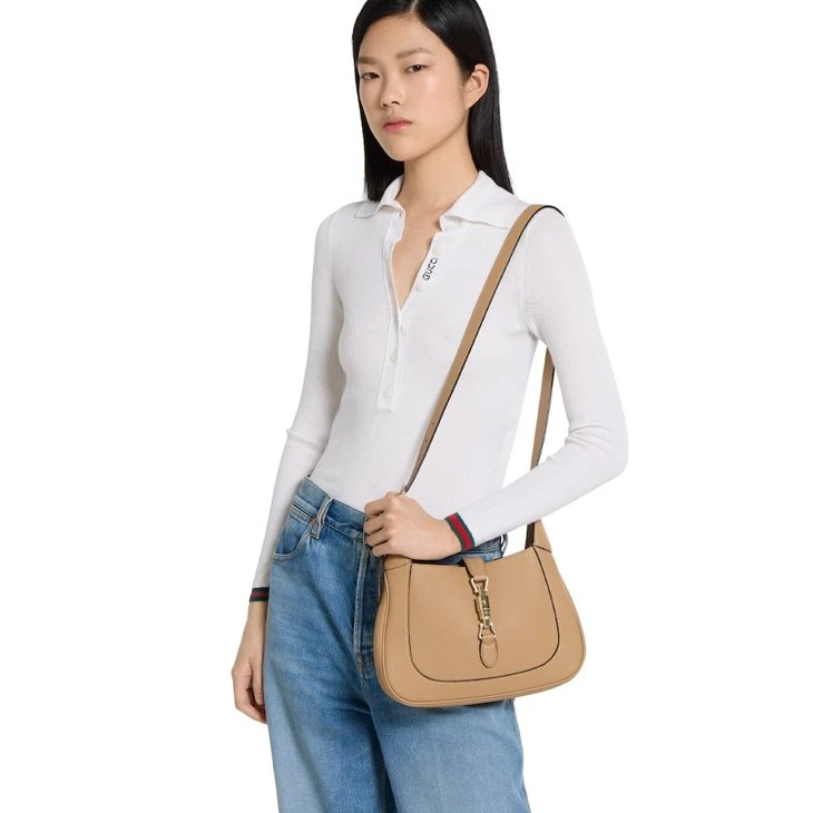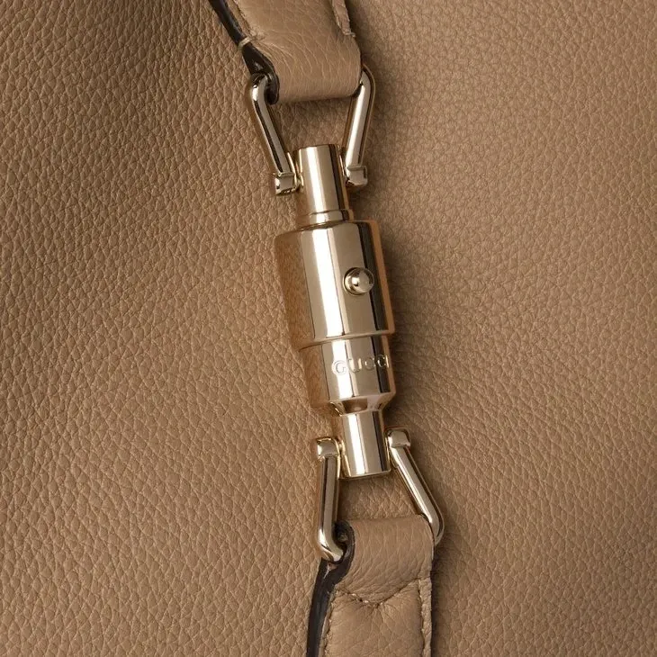 The Gucci Jackie 1961 shoulder bag features a light gold-toned piston closure and fine leather that highlights the craftsmanship, crescent shape, and sleek silhouette of the House’s iconic design. This medium size includes a leather strap and an additional Web strap for versatile styling options.Beige natural grain leather
