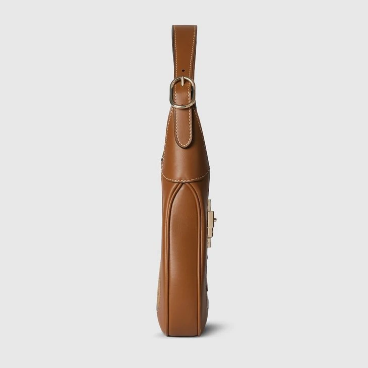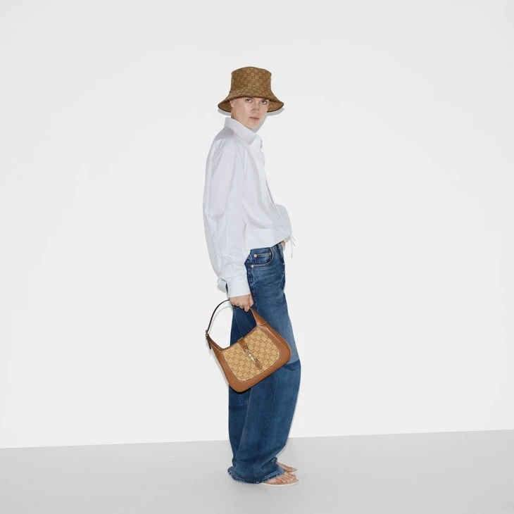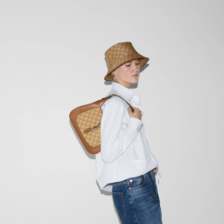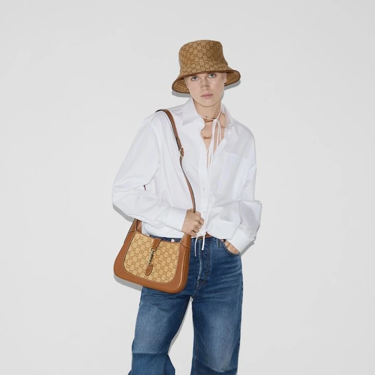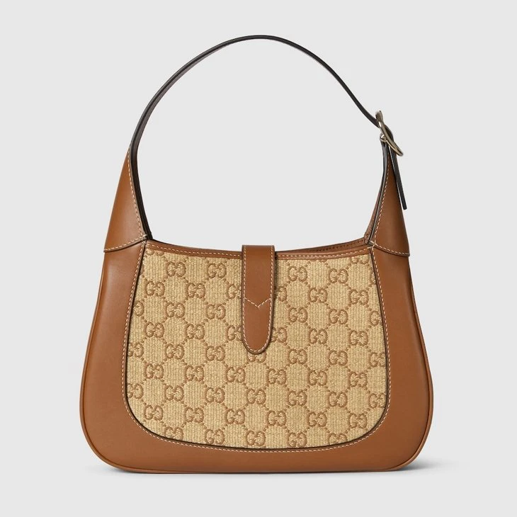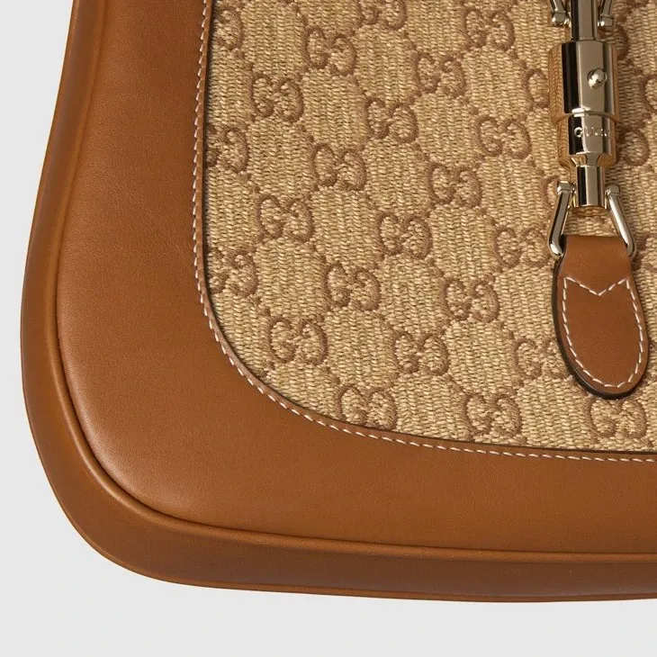 The Gucci Jackie 1961 with its signature piston closure and emblematic shape tells a story that spans eras. The shoulder bag exudes timeless elegance with a contemporary edge.Natural and brown GG raffia-effect fabric