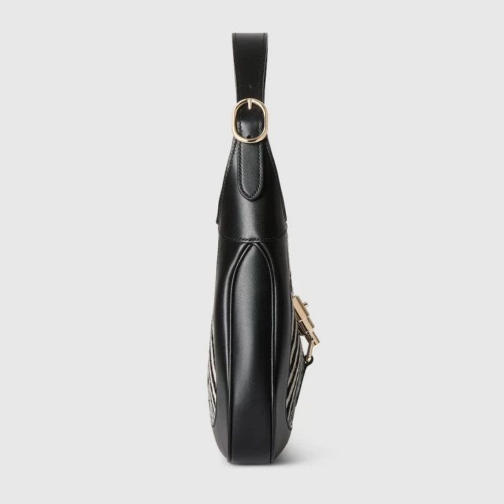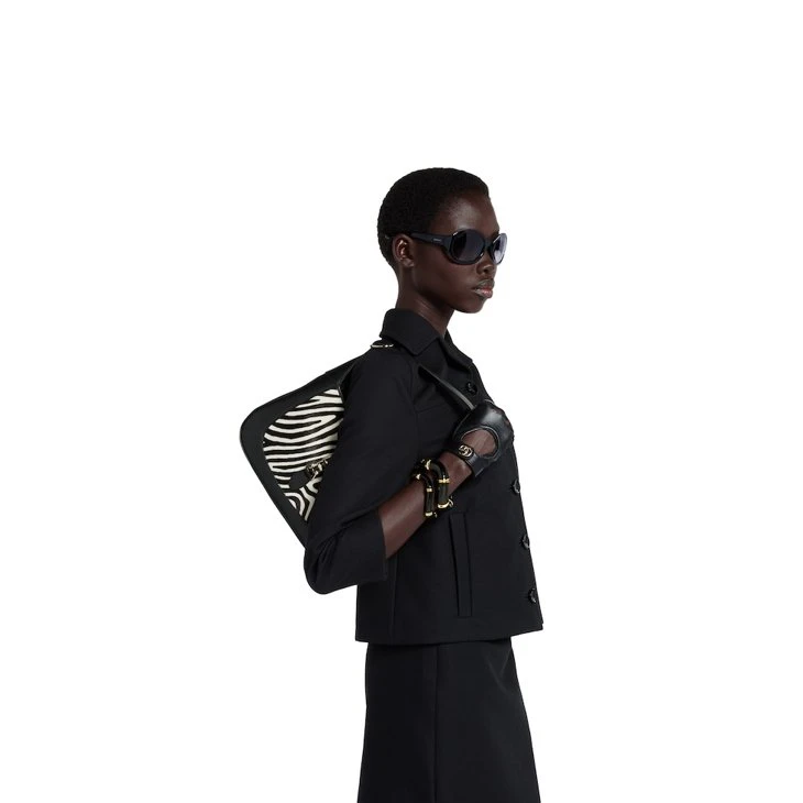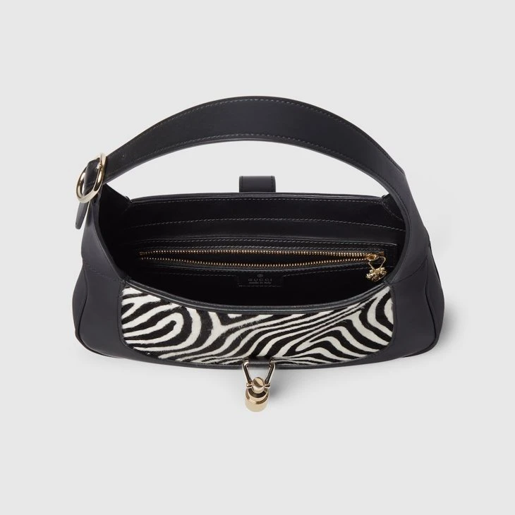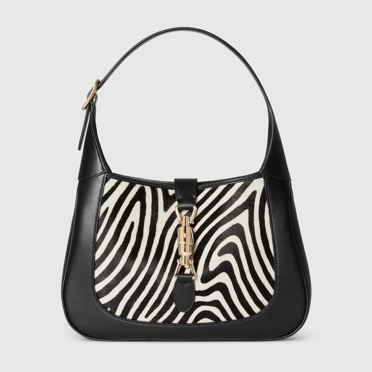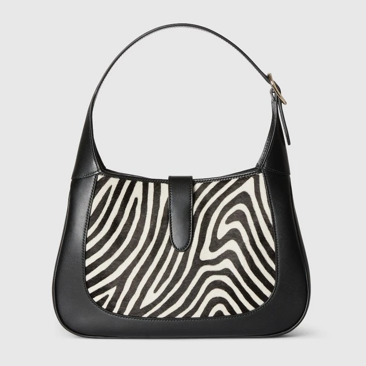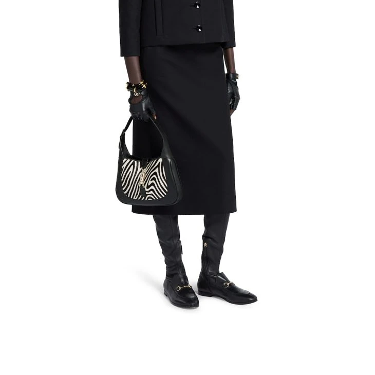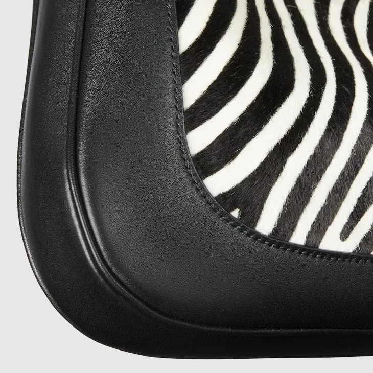 In the Spring Summer 2025 collection, this Gucci Jackie 1961 medium shoulder bag is crafted from black and white calf hair, inspired by animal print.Black and white printed calf hair