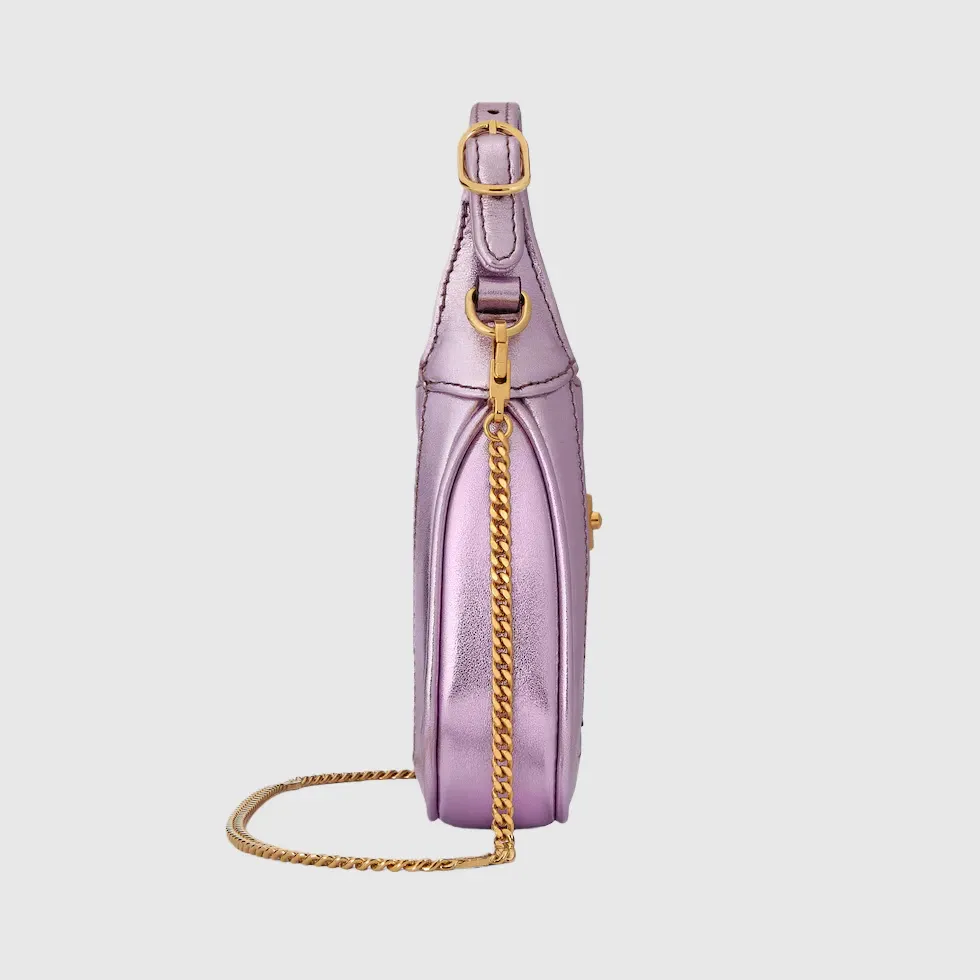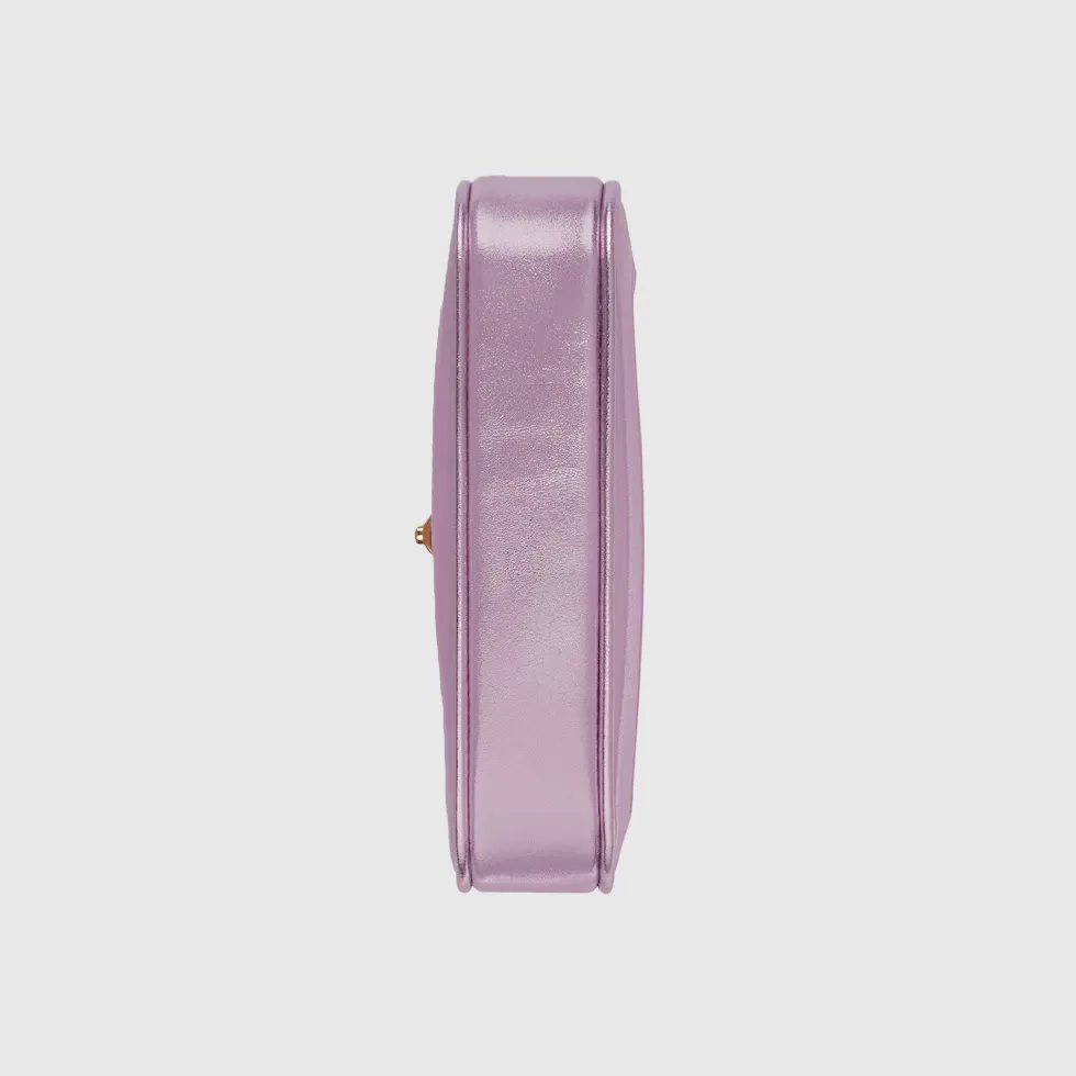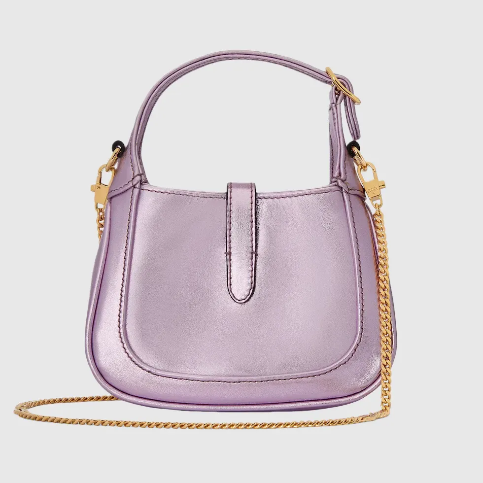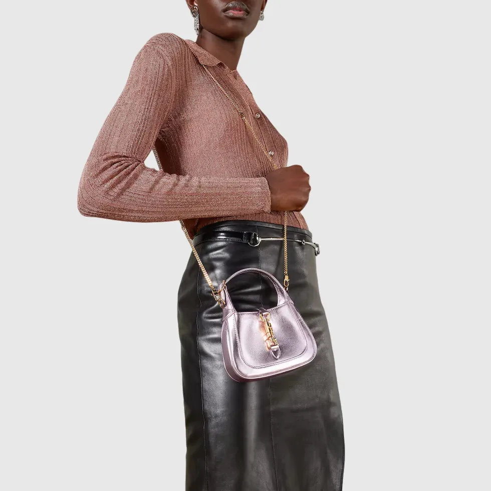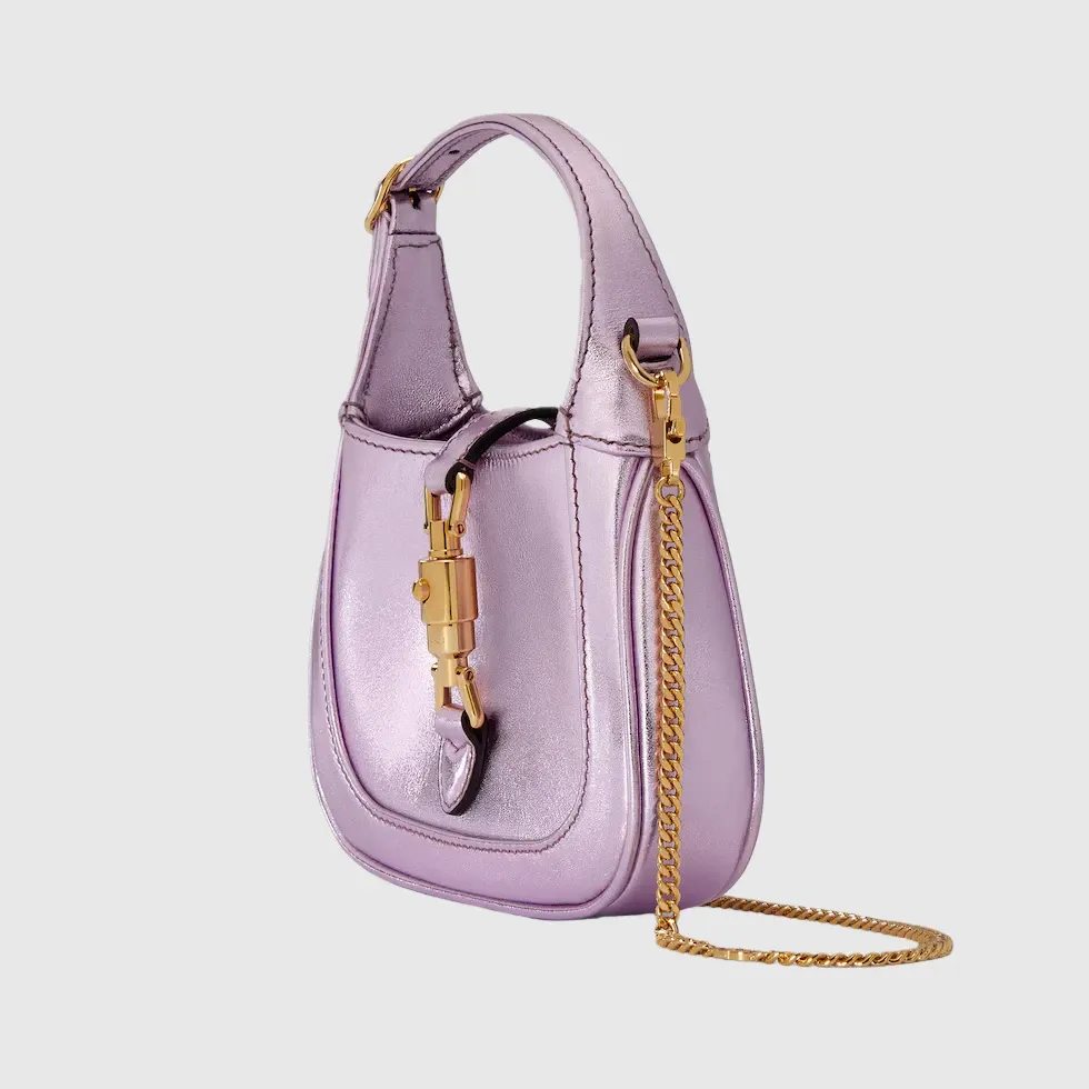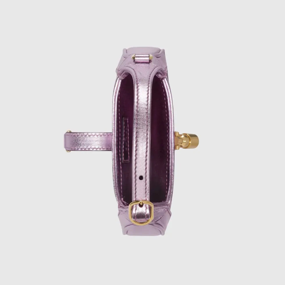 Signature Gucci designs go miniature for Fall Winter 2023. Featuring the same unmistakable hardware and finishes, this Jackie 1961 mini bag is a playful variation of the original dimensions. With multiple ways to style it, the design is seamlessly integrated into everyday wear. Here it appears in a metallic pink laminated leather.Metallic pink laminated leather