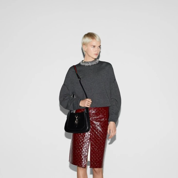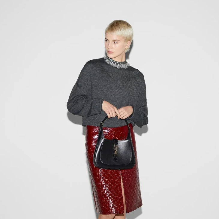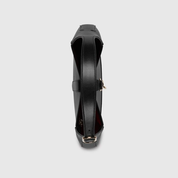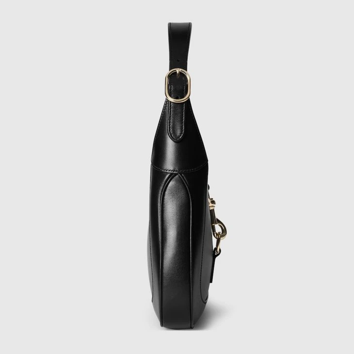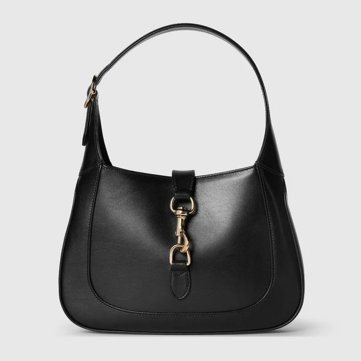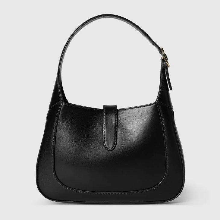 The new Gucci Jackie is crafted from premium fine leather which highlights the craftsmanship, crescent shape, and sleek silhouette of the House’s iconic shoulder bag. Light gold-toned hook closure, leather trim, and an additional Web strap gives this Gucci Jackie medium shoulder bag in black leather further styling options.Black leather