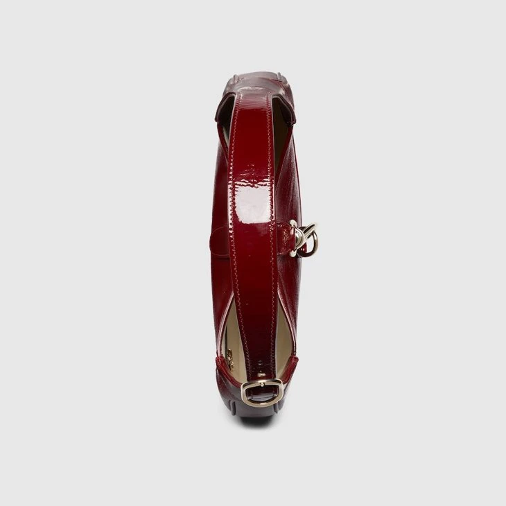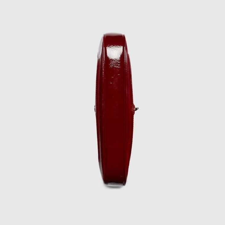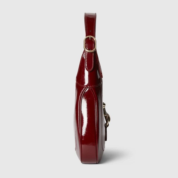 The new Gucci Jackie is crafted from fine leather which highlights the craftsmanship, crescent shape, and sleek silhouette of the House’s iconic shoulder bag. Light gold-toned hook closure, leather trim, and an additional strap featuring the green and red Web gives this Gucci Jackie medium shoulder bag in Gucci Rosso Ancora leather, the signature red hue of the House, further styling options.Rosso Ancora red patent leather