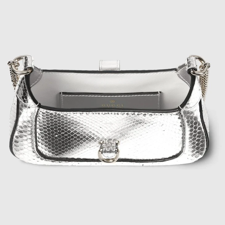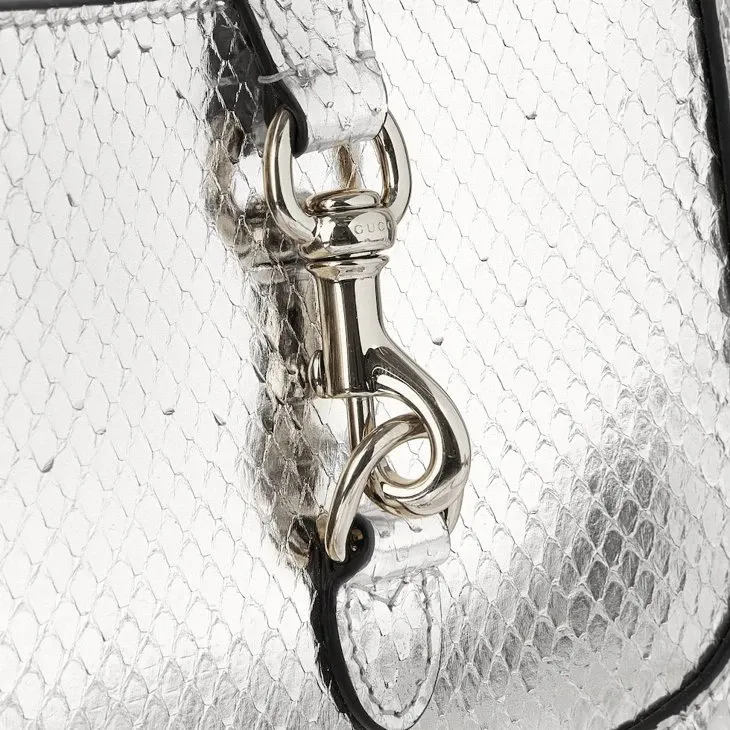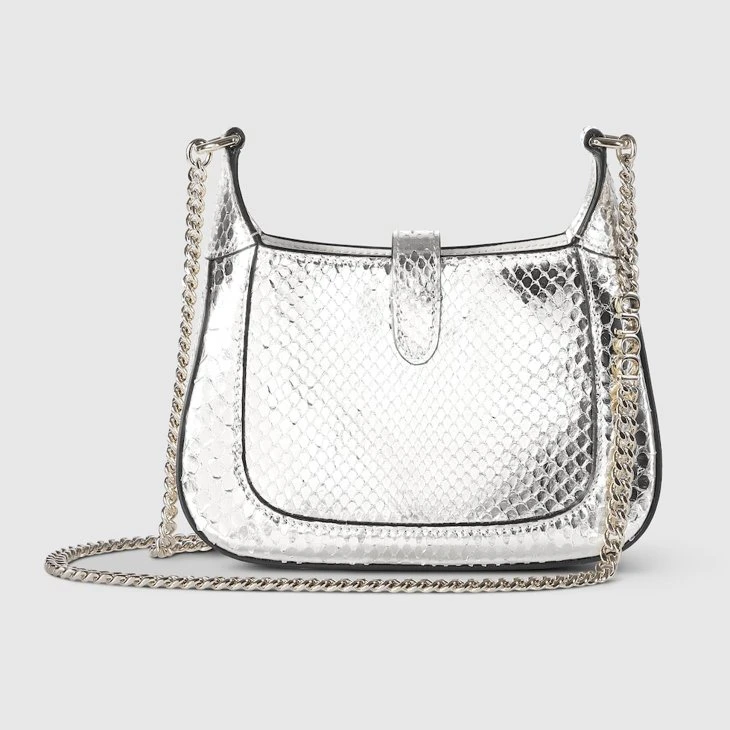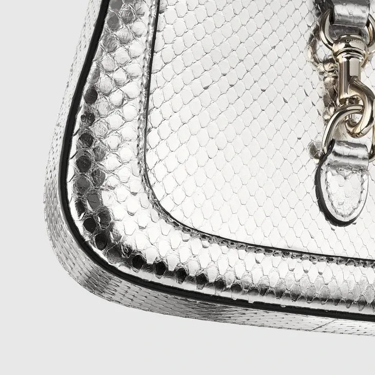 Inspired by the self-confidence of the signature Jackie line, the Jackie Notte is an evening handbag with subtle details that make it perfect for nighttime wear. This silver-toned python style is complete with a hook closure and Gucci Lettering Chain shoulder strap.Silver-toned python