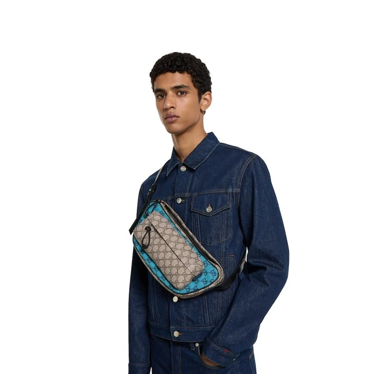 Gucci Match is a distinctive collection crafted from repurposed materials, featuring a bold mix of contrasting textures, from supple leather and durable nylon to soft GG Monogram canvas. The result is a playfully contemporary aesthetic, marked by new color combinations with an eclectic touch across a range of pieces including backpacks and crossbody bags to coordinated baseball caps.Light blue and black new GG canvas and beige and dark brown GG Supreme
