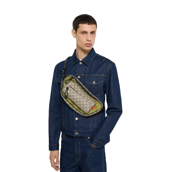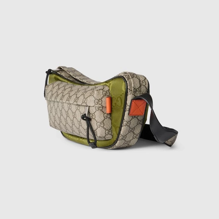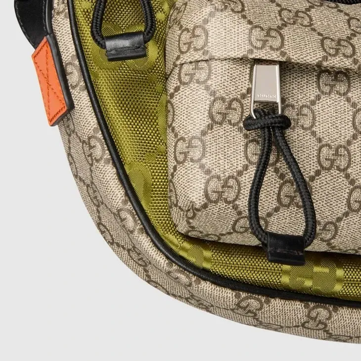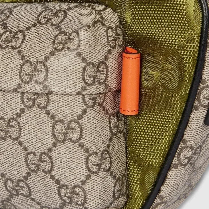 Gucci Match is a distinctive collection crafted from repurposed materials, featuring a bold mix of contrasting textures, from supple leather and durable nylon to soft GG Monogram canvas. The result is a playfully contemporary aesthetic, marked by new color combinations with an eclectic touch across a range of pieces including backpacks and crossbody bags to coordinated baseball caps.Dark green GG nylon and beige and dark brown GG Supreme