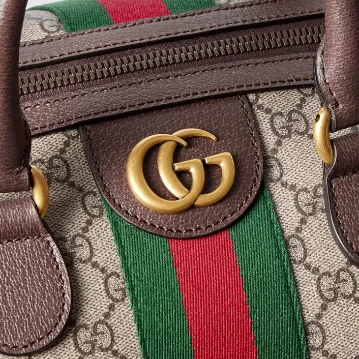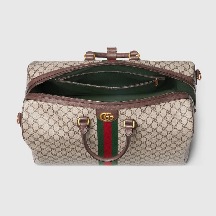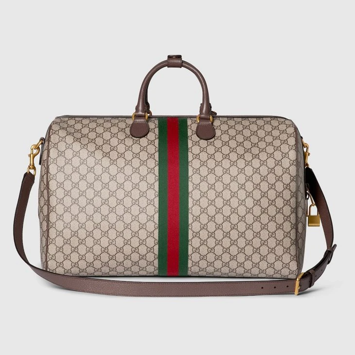 Gucci Savoy in the beige and dark brown palette offers signature silhouettes, crafted with a soft touch. This duffle bag is presented in GG Monogram coated fabric and enriched with a Double G and Web detail.Beige and dark brown GG Monogram coated fabric