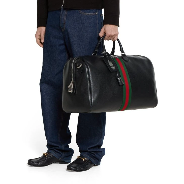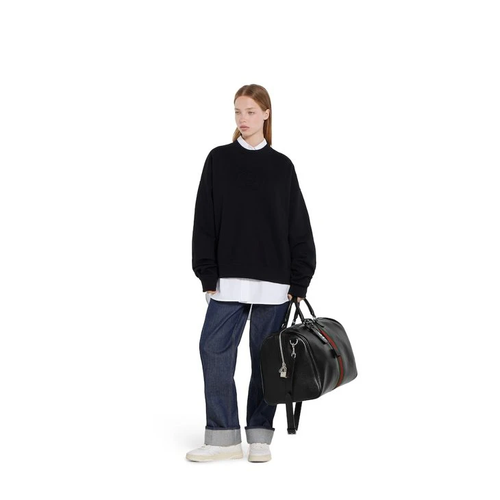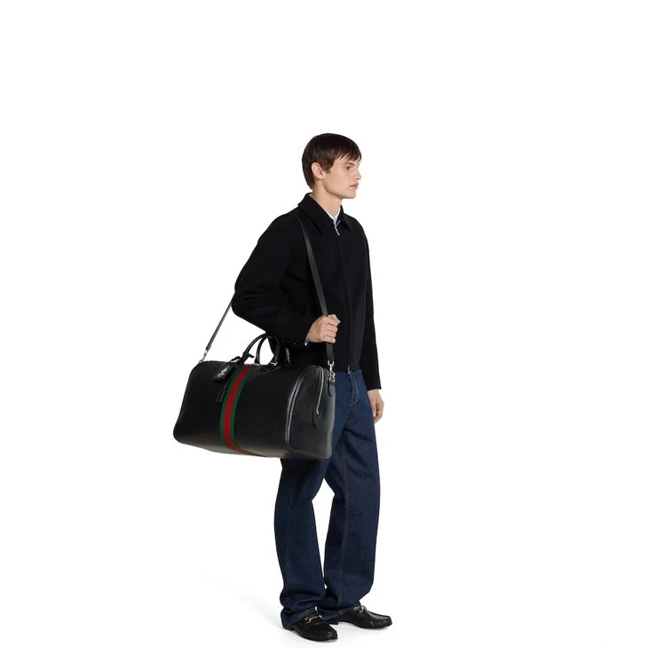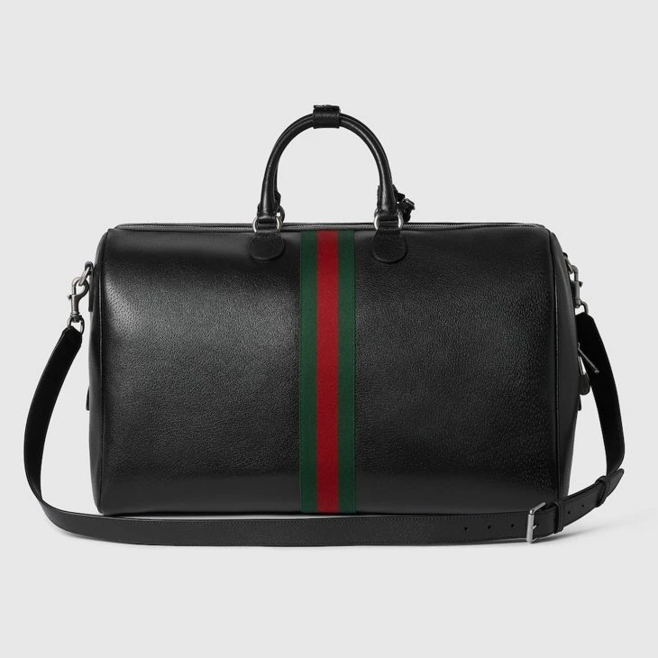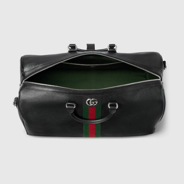Gucci Savoy in black features sophisticated leather, elevating signature silhouettes. This duffle bag is presented in a soft leather with natural shine, revealing a Double G and Web detail.Black soft leather with natural shine
