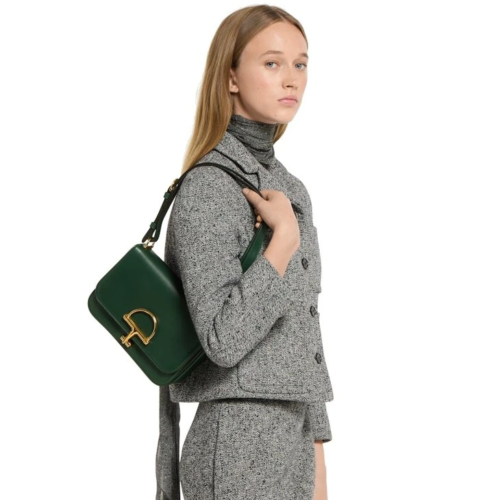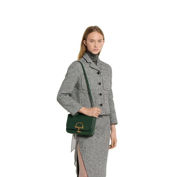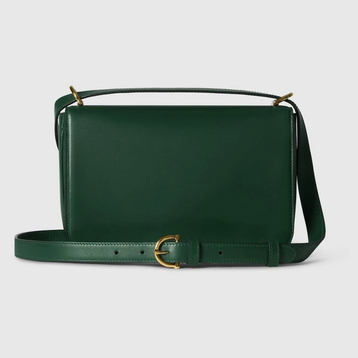 In the Fall Winter 2025 collection, the Gucci Siena small shoulder bag carries forward the evolution of the Horsebit, a signature code that is inherently Gucci. Crafted from fine smooth leather, its structured silhouette is defined by the half Horsebit clasp, a distinctive detail first introduced in the 1970s. Finished with gold-toned hardware and a lined interior featuring three gussets and a zip pocket.Green fine, smooth leather