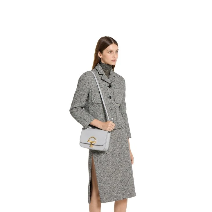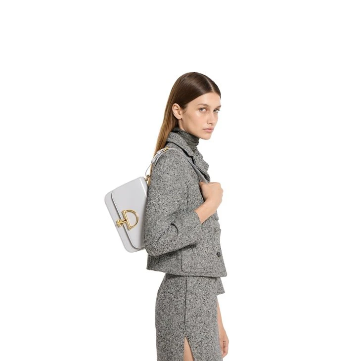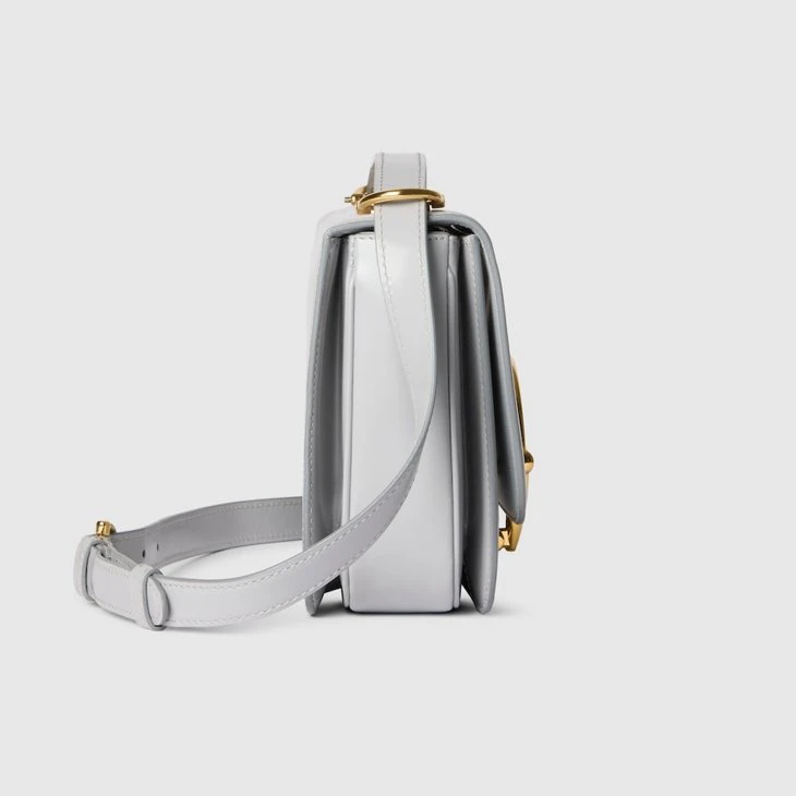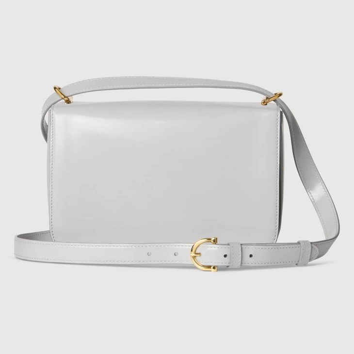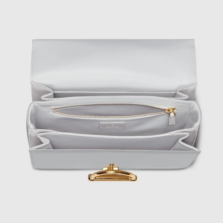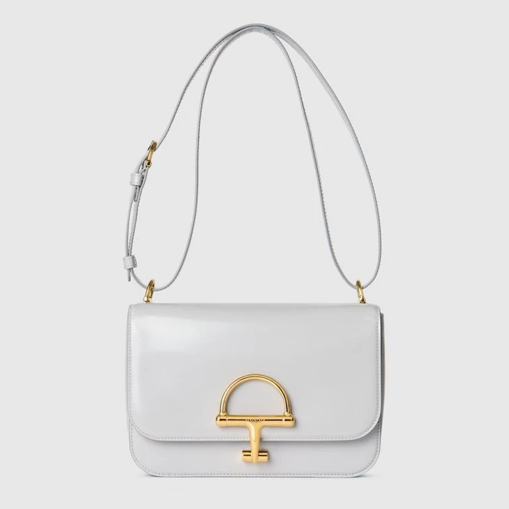 In the Fall Winter 2025 collection, the Gucci Siena small shoulder bag carries forward the evolution of the Horsebit, a signature code that is inherently Gucci. Crafted from leather, its structured silhouette is defined by the half Horsebit clasp, a distinctive detail first introduced in the 1970s. Finished with gold-toned hardware and a lined interior featuring three gussets and a zip pocket.Light grey leather