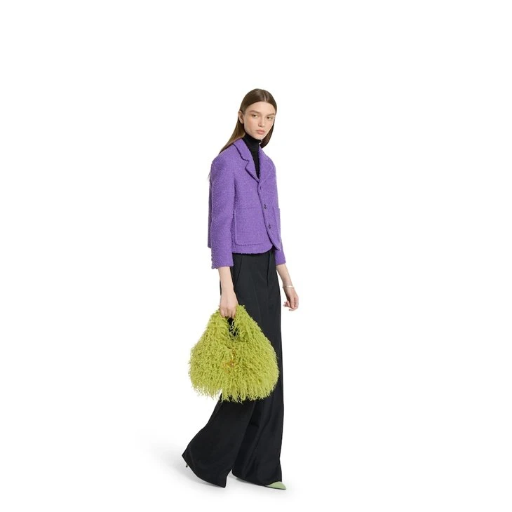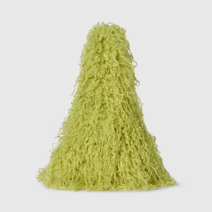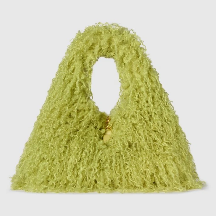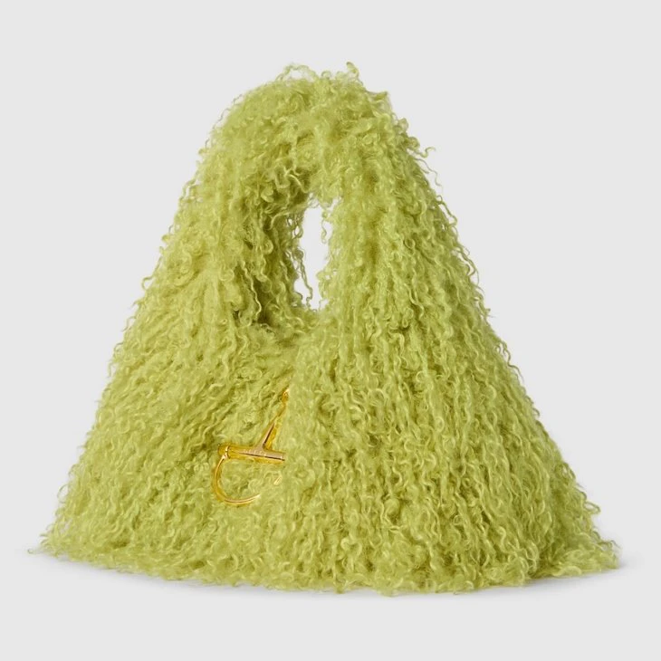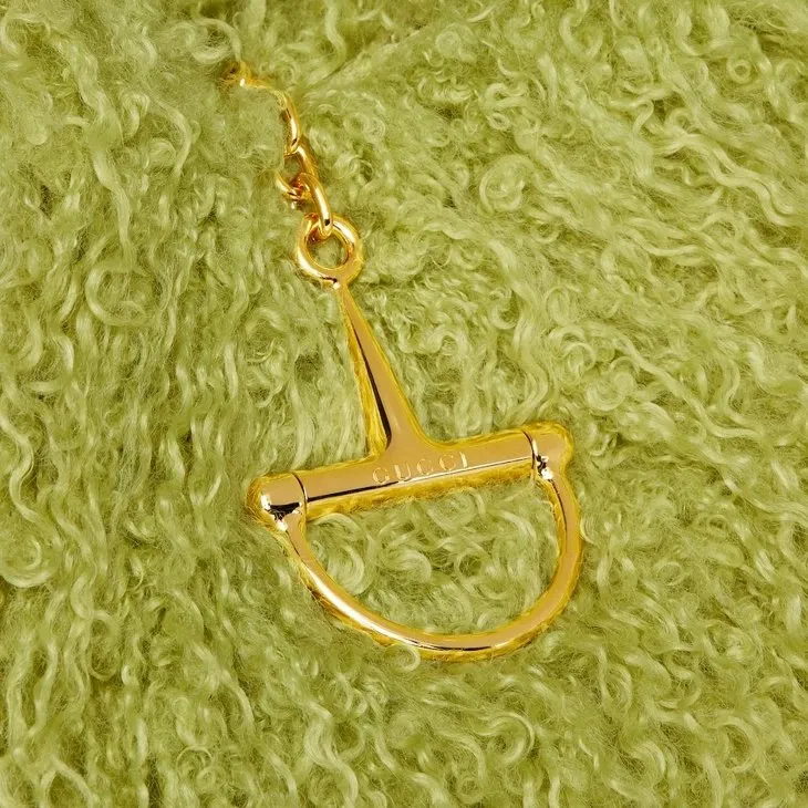 In the Fall Winter 2025 collection, the new Gucci Softbit reimagines the House’s signature hardware as an oversized half Horsebit. It is both aesthetic and functional as the magnetic closure of the relaxed silhouette, crafted from long fuzzy fabric with a rich texture.Pale green long fuzzy fabric