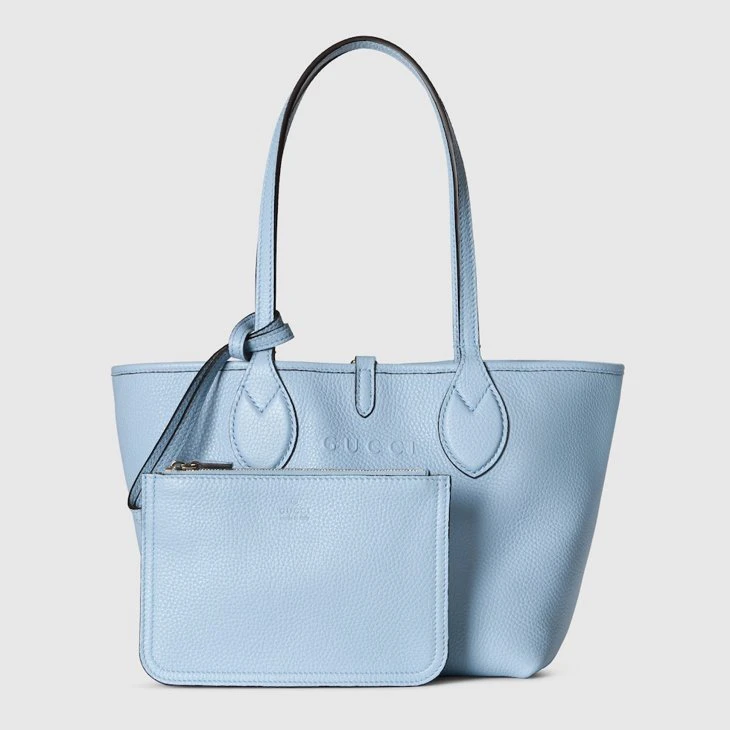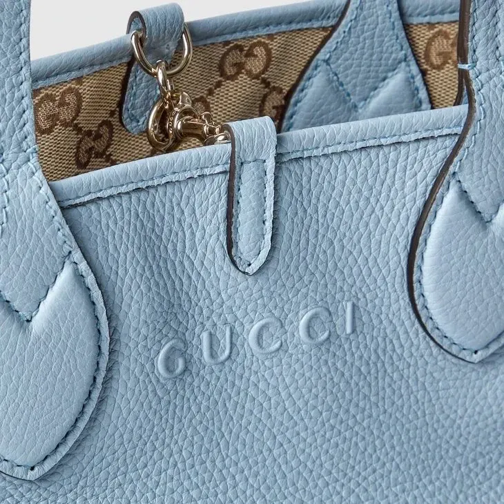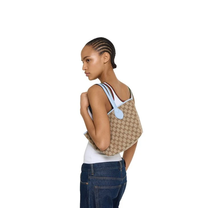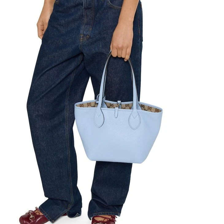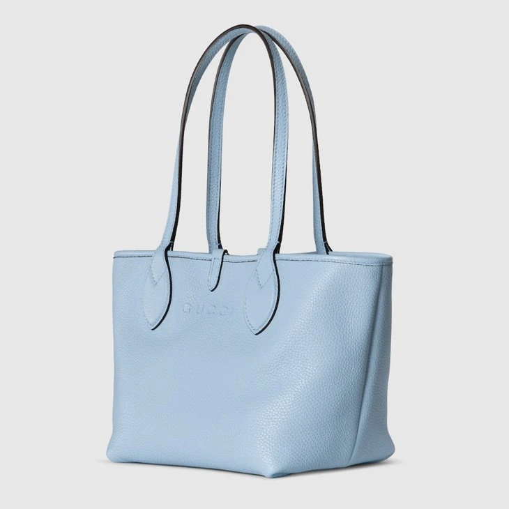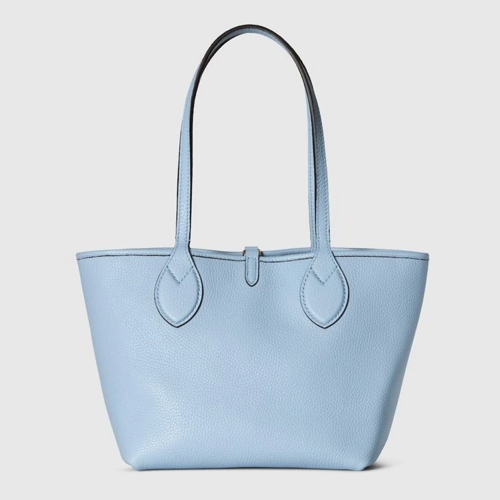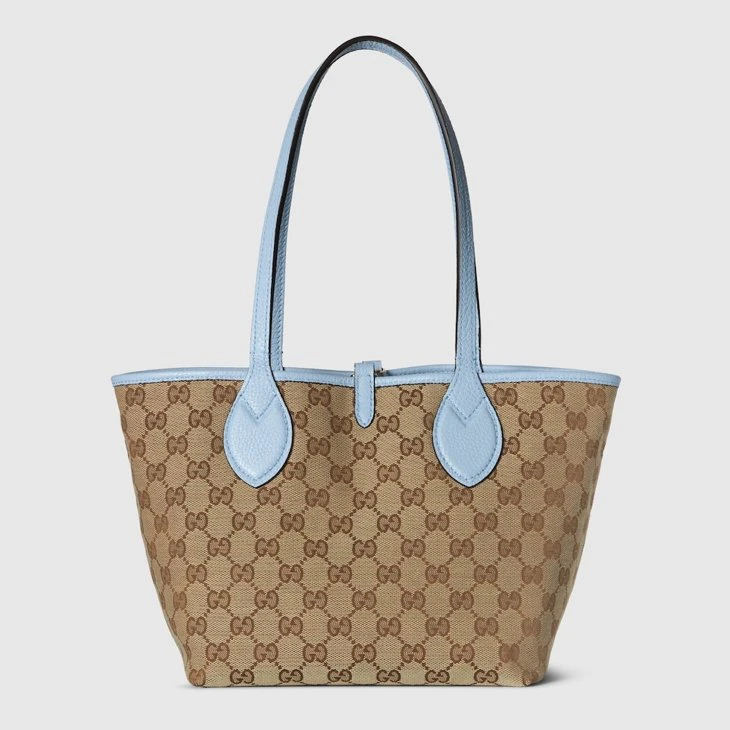 Introducing a reversible style with two distinct looks in one piece, this Gucci Totissima is crafted with grainy leather on one side, and GG canvas on the other. The name Totissima emphasizes an enduring style and functionality.Light blue grainy leather on one side, beige and dark brown GG canvas on the other