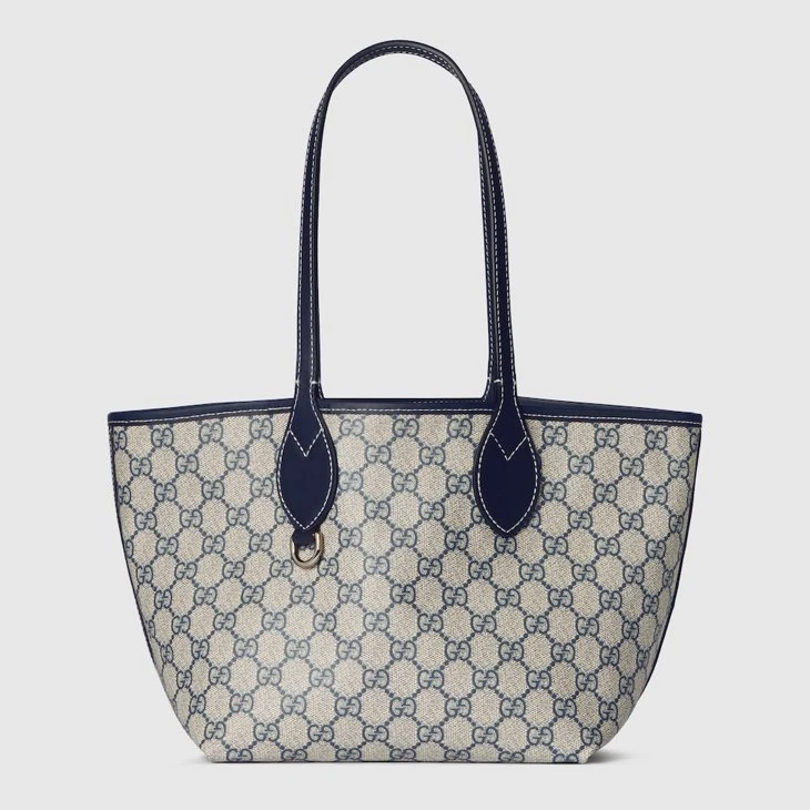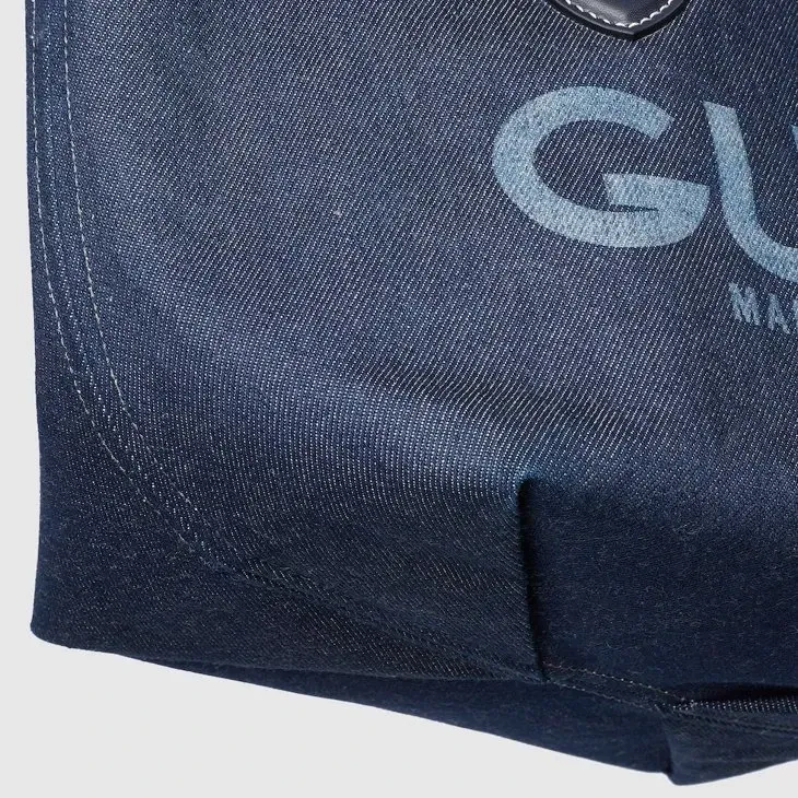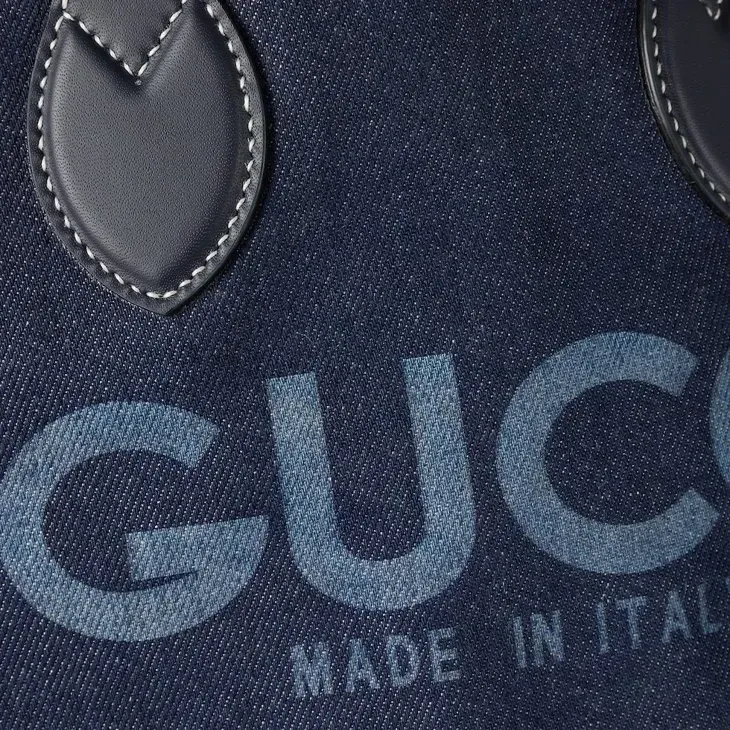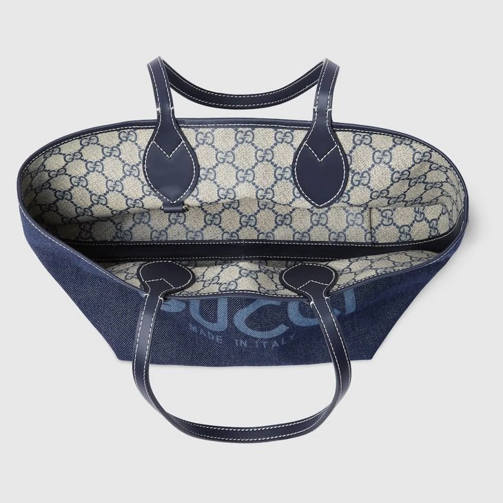 Introducing a reversible style with two distinct looks in one piece, this Gucci Totissima small tote bag is crafted with denim on one side, and GG Supreme on the other. The name Totissima emphasizes an enduring style and functionality.Dark blue denim on one side, beige and blue GG Supreme on the other