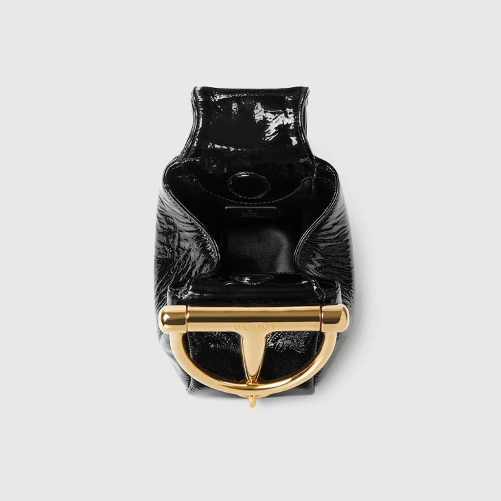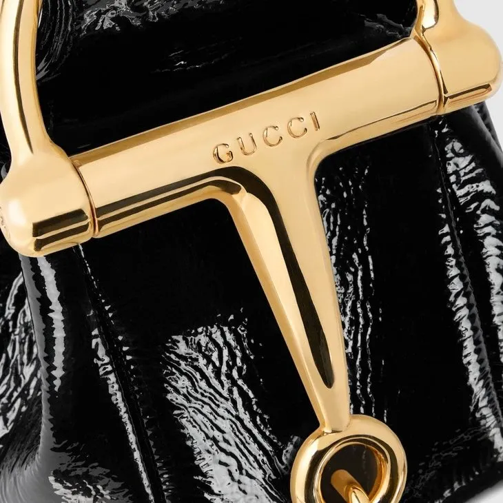 In the Fall Winter 2025 collection, this evening pouch features the signature Half Horsebit detail, highlighting the House’s equestrian-inspired hardware. Crafted from patent leather with gold-toned accents, it combines timeless style with a modern silhouette.Black patent leather