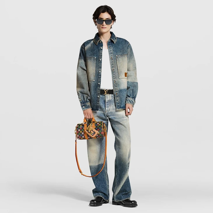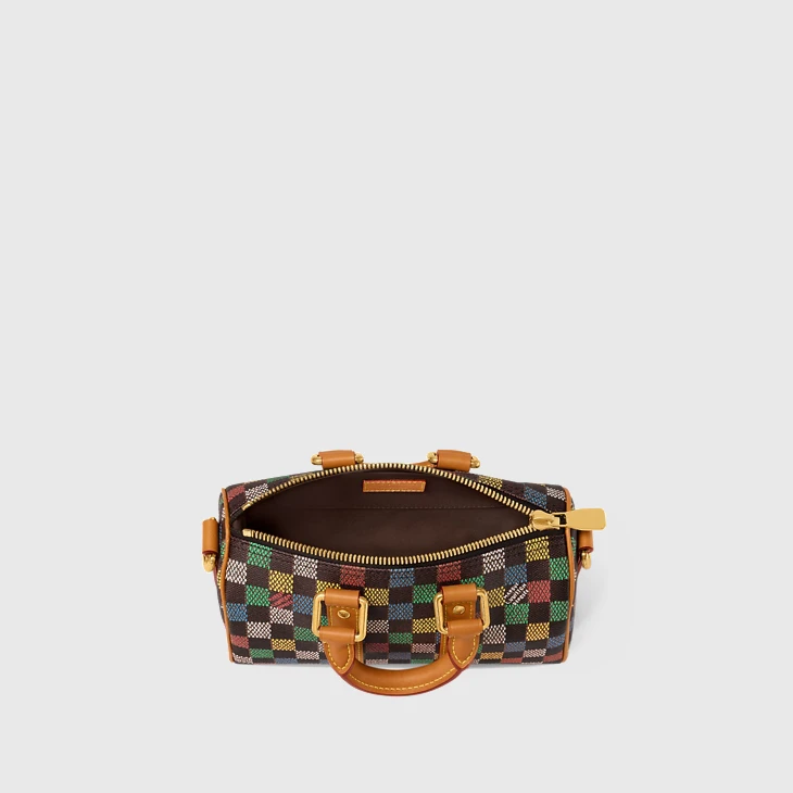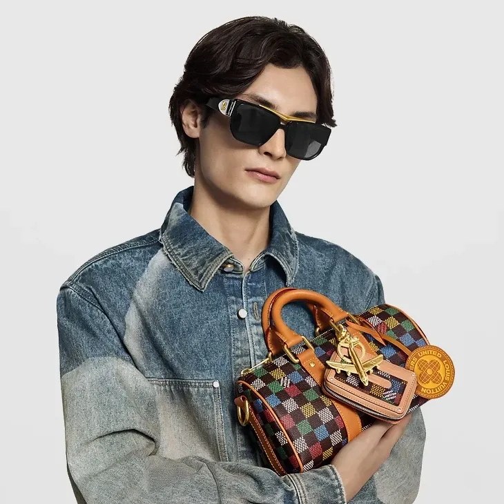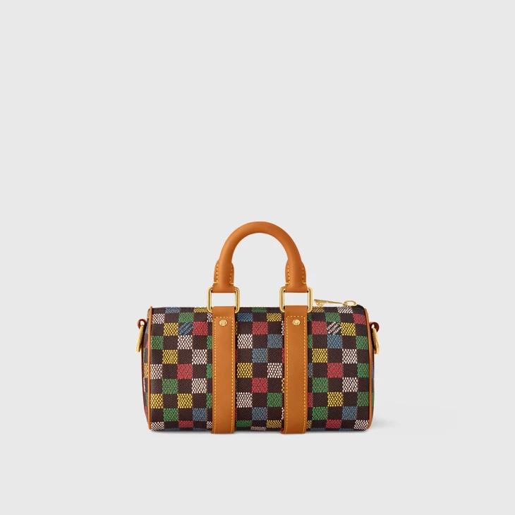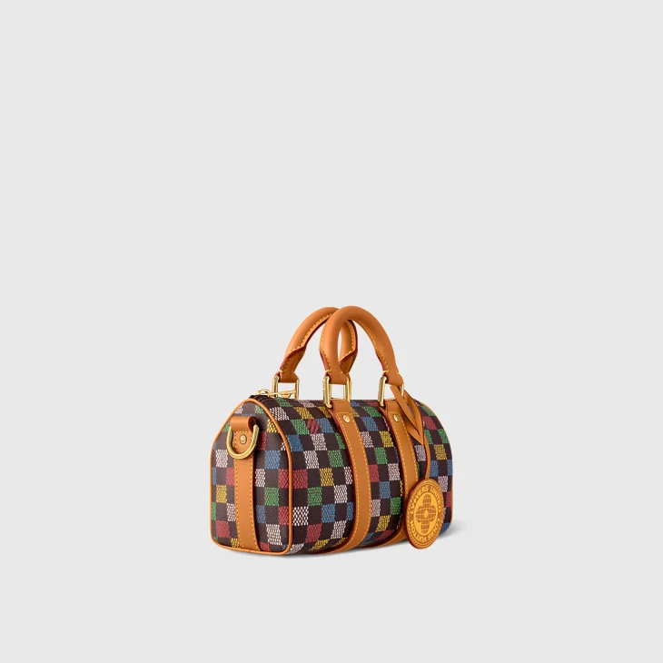 The Keepall Bandoulière 25 city bag is made from Pharrell Williams’ LV Vers Damier Ebene canvas, on which what looks to be hand-painted squares are printed over the Damier Ebene checkerboard. Luxurious details, like the pearl zip pull, LV Vers UNITED tag, and the “Marque Louis Vuitton Deposee” on the Damier incarnates Williams’ blending of past and present.