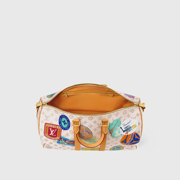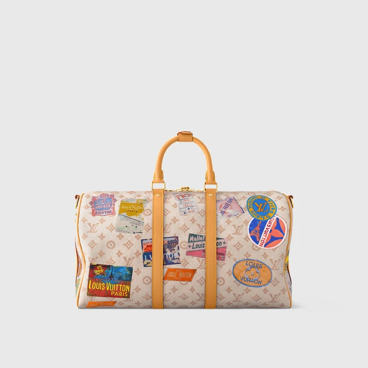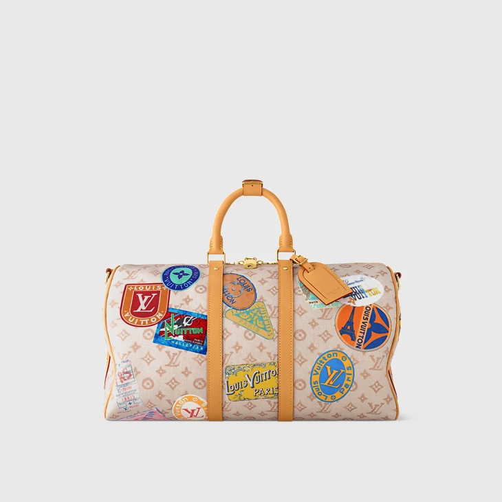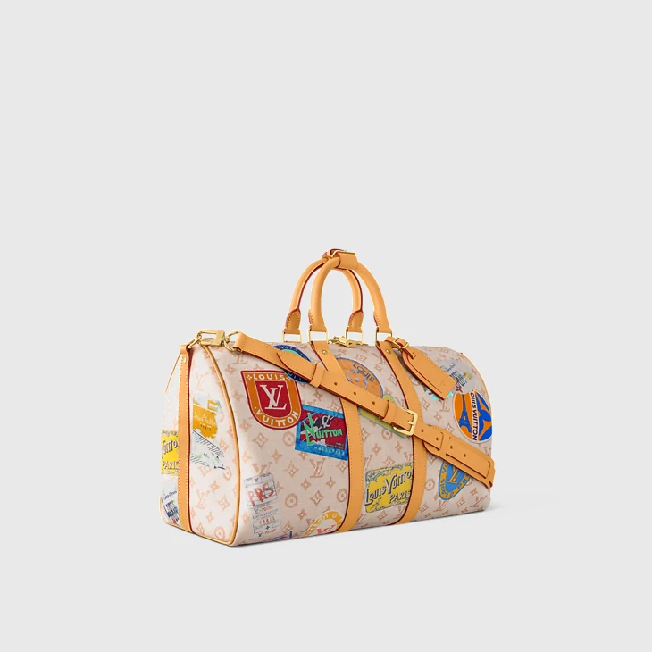 The sandy colorway of this Keepall Bandoulière 45 in Monogram Dune coated canvas is enlivened with a print of Louis Vuitton vintage-style travel stickers. Natural cowhide trim enhances the retro look of this Keepall. This cabin-size bag can be carried by its two top handles or with its removable, adjustable shoulder strap.