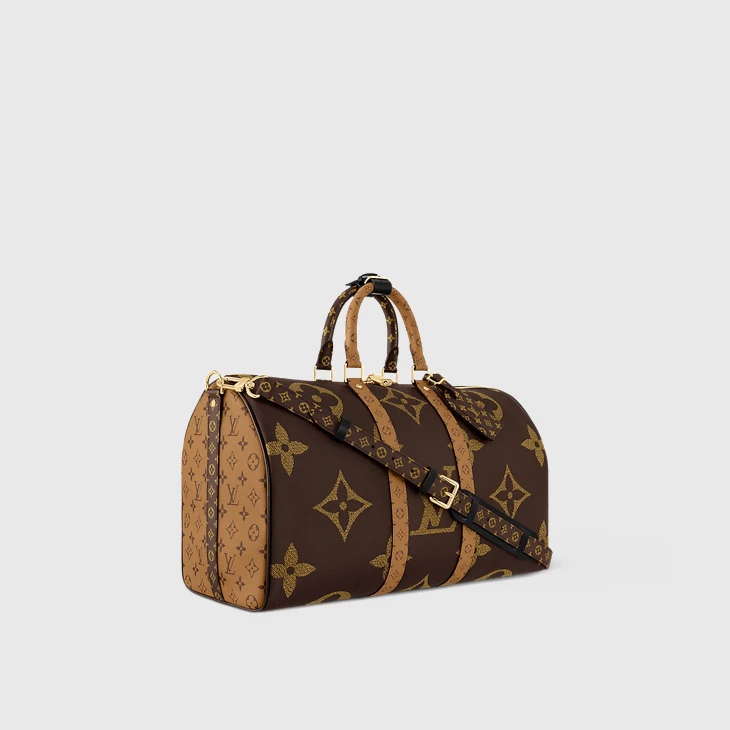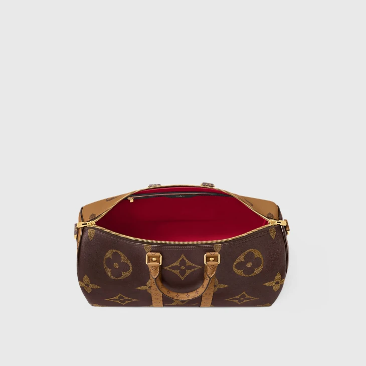 Fashioned from Monogram Giant coated canvas with trim in Monogram Reverse, this Keepall Bandoulière 45 celebrates one of the House’s most emblematic patterns. Lined in sumptuous red textile, the interior boasts a zipped pocket. A removable and adjustable leather strap, in addition to two top handles, give carry options.