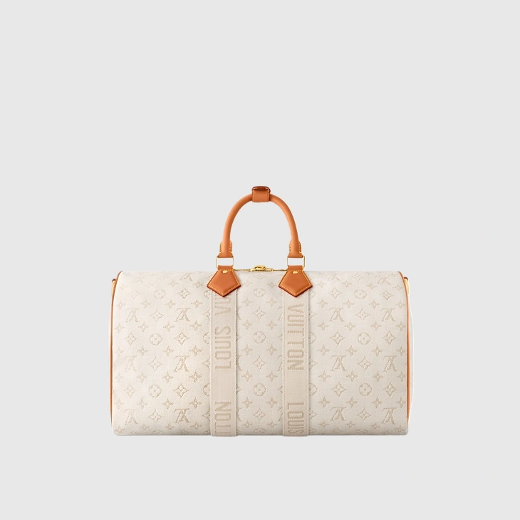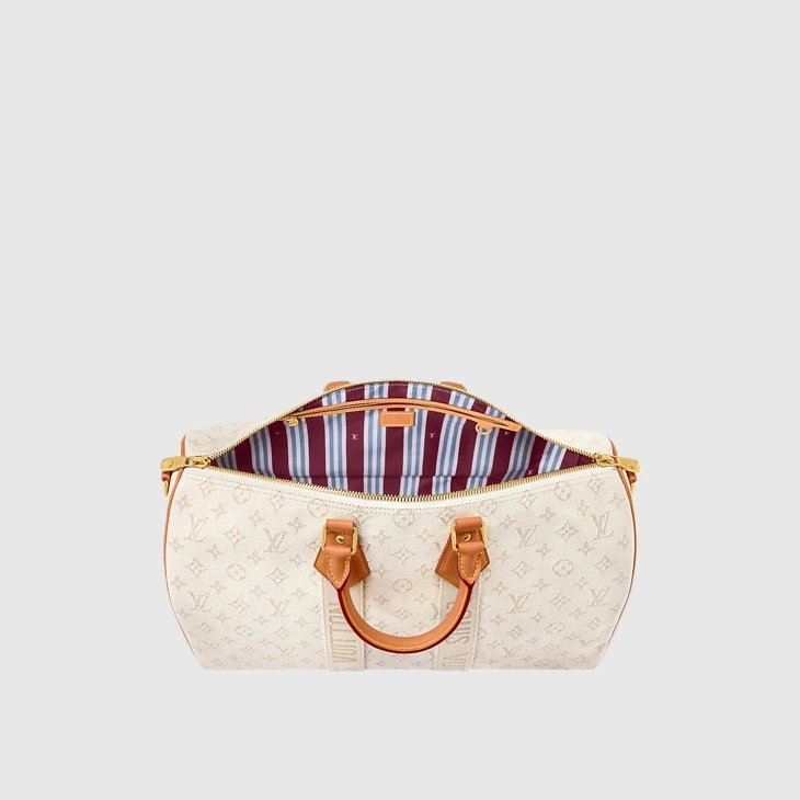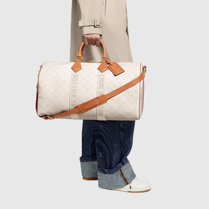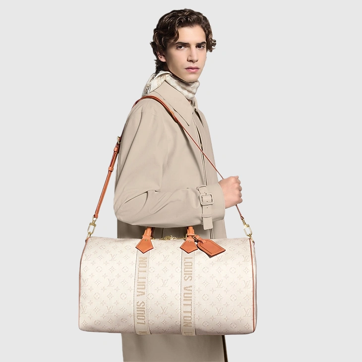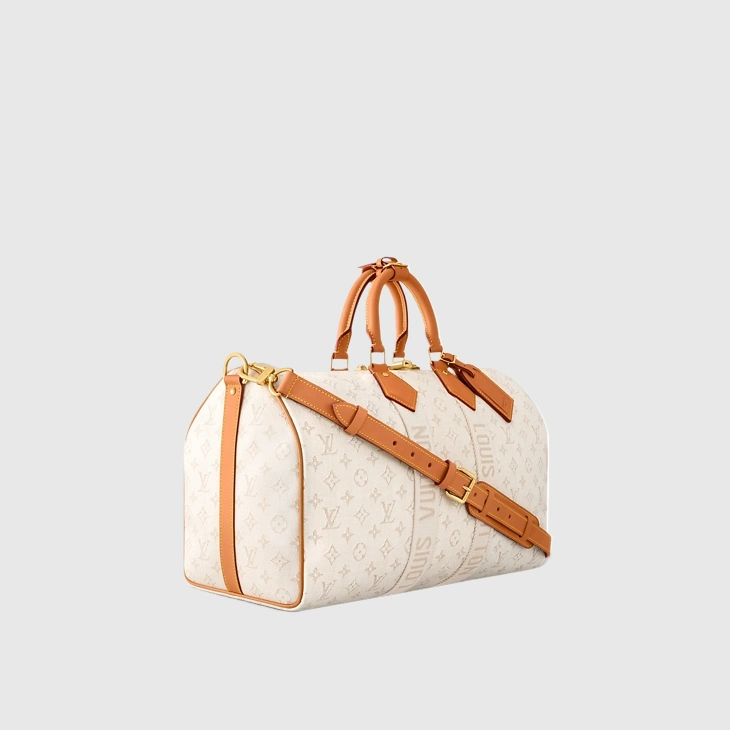 The Keepall Bandoulière 45 bag in Monogram Heritage coated canvas captures the glamorous ambiance of the cruise ship lifestyle. Its discreet colorway and aged-gold-toned hardware exude sophistication, while the supple cowhide leather details showcase the House’s leather expertise. With top handles and a removable, adjustable strap, it offers versatile carrying options.