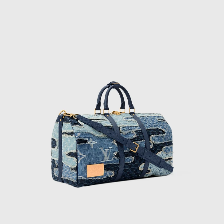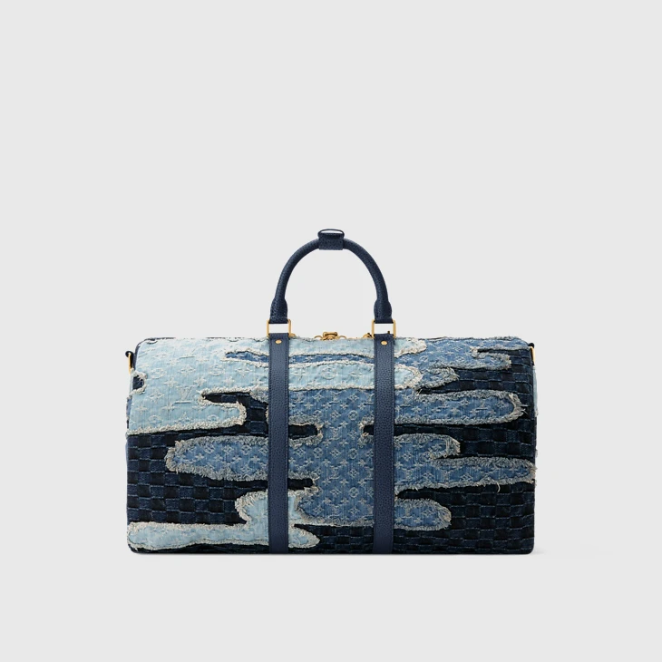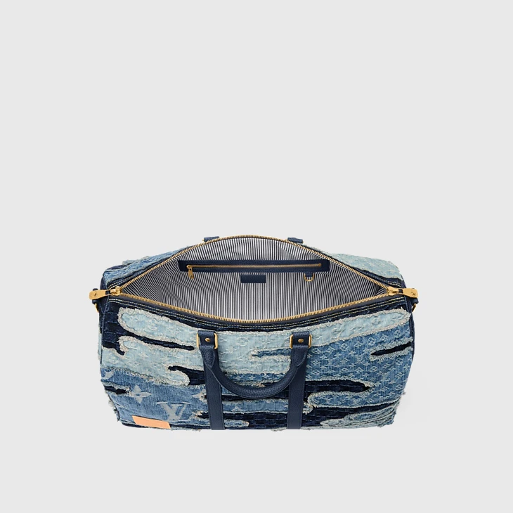 This Keepall Bandoulière 50 is crafted from a patchwork of stone-washed denims, evoking the Japanese Boro technique of repeatedly patching and mending cloth. The Damier denim base is stitched over with denim patches featuring the Monogram. Signed with a Japan-inspired leather patch depicting a carp, this meticulously crafted bag is lined in striped cotton.