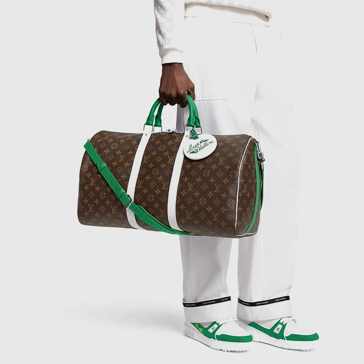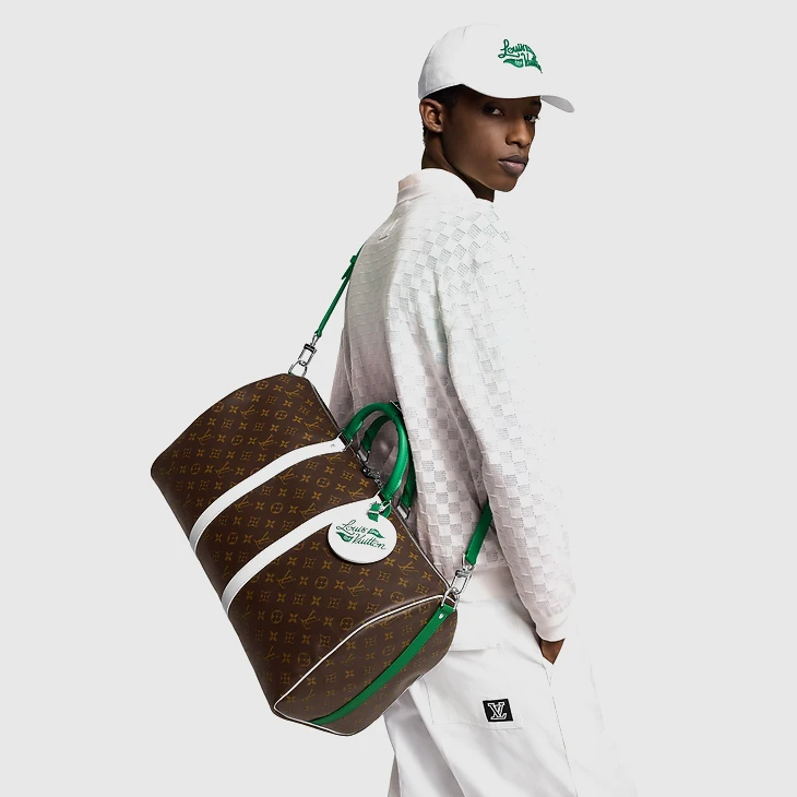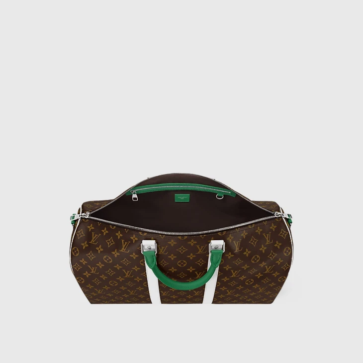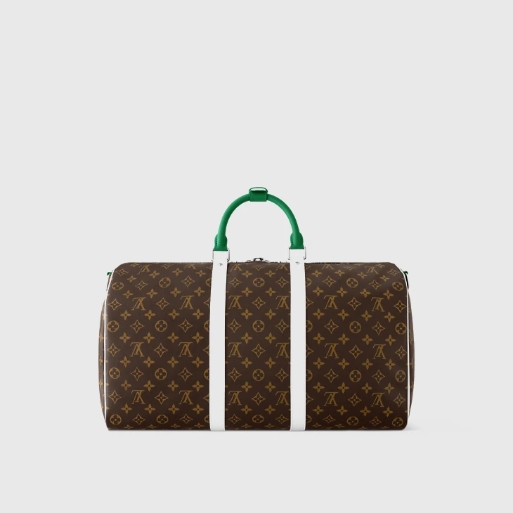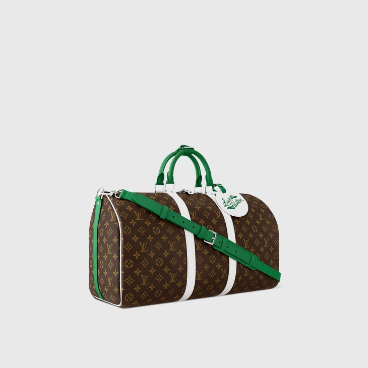 Crafted from Monogram coated canvas, the Keepall Bandoulière 50 is part of the LV Golf collection and features green-and-white leather trim. The white-leather side bands perfectly complement the vivid green top handles. This spacious bag is small enough to be used as carry-on luggage. It also includes the collection’s signature Louis Vuitton golf name tag.