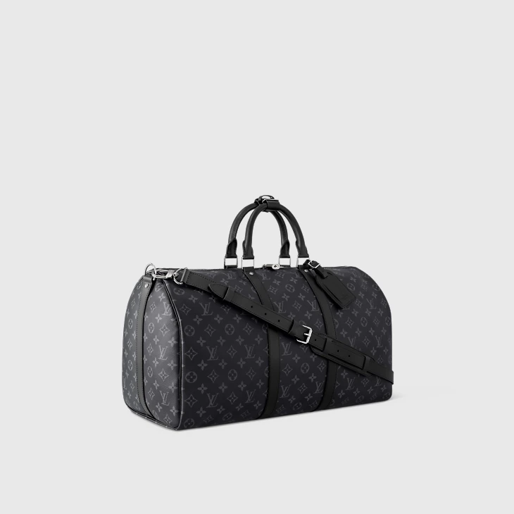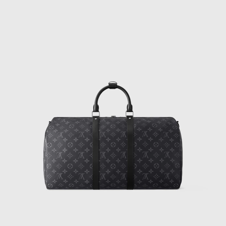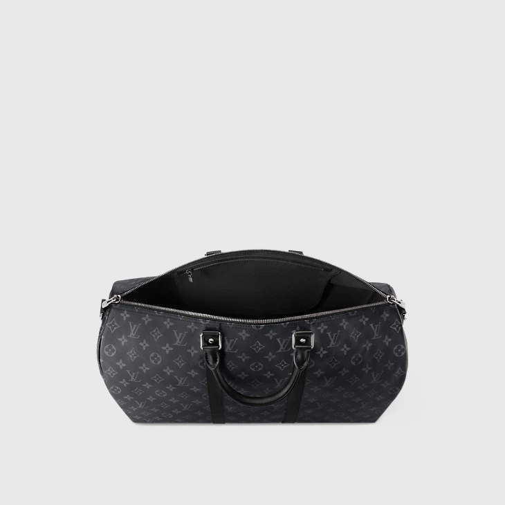 The Keepall Bandoulière 50 travel bag looks elegant in Monogram Eclipse coated canvas with black-leather trim and top handles. This cabin-friendly bag features the all the details associated with the historic Keepall line: lateral leather bands, rolled-leather top handles, padlock and removable name tag. The roomy interior includes a zipped pocket to keep things organized.