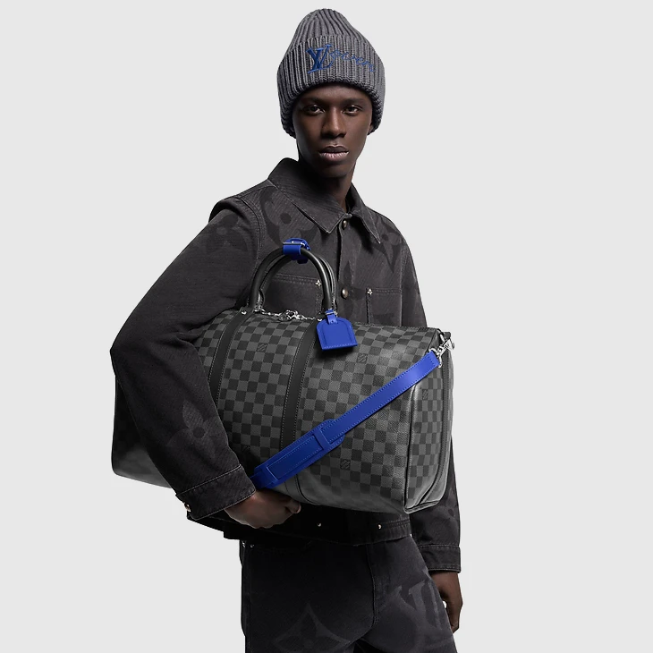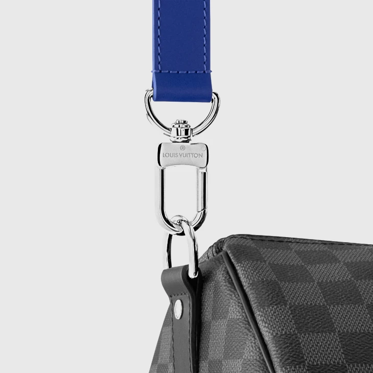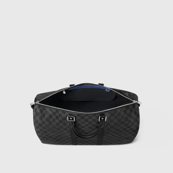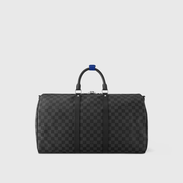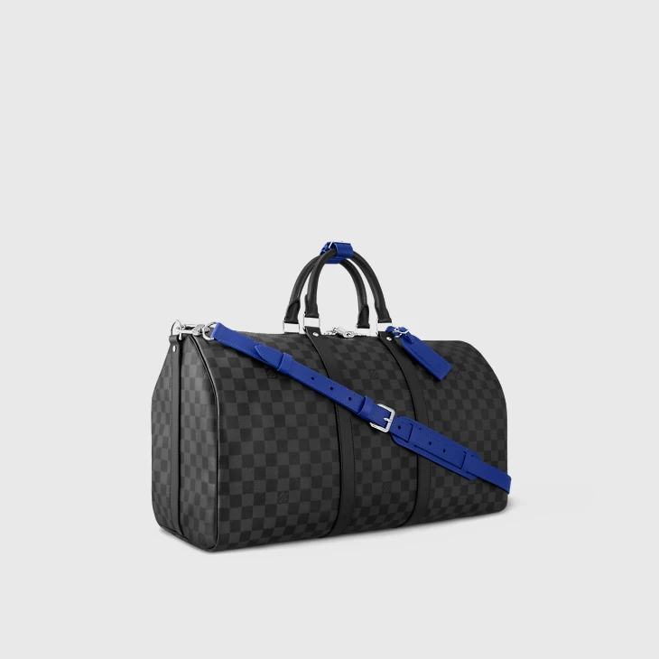 This Keepall Bandouliere 50 is a cabin-sized bag in Damier Graphite canvas with an indigo-blue shoulder strap and name tag. The touches of blue bring a contemporary feel to the classic checkerboard pattern. This Keepall is lined in textile and includes an inside zipped pocket. Two top handles and the removable and adjustable strap give carry options.