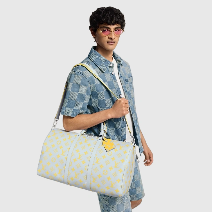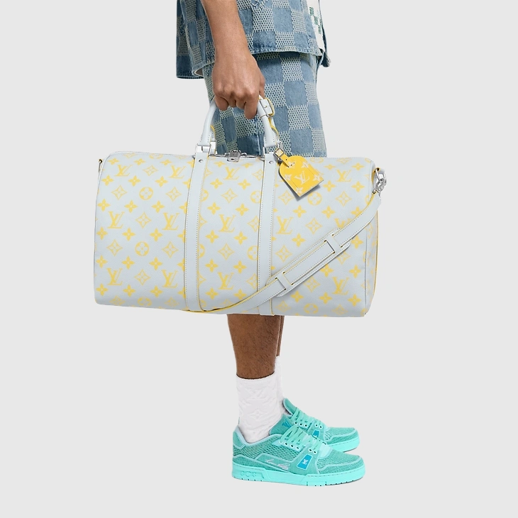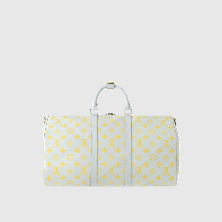 This Keepall Bandoulière 50 bag is made from Monogram Glow canvas, with its vibrant Monogram. The interior is lined with textile featuring a reverse version of the pattern, which also appears on the name tag. Aged silver-toned hardware, leather side bands, top handles, and a removable strap in the same color as the canvas complete the design.