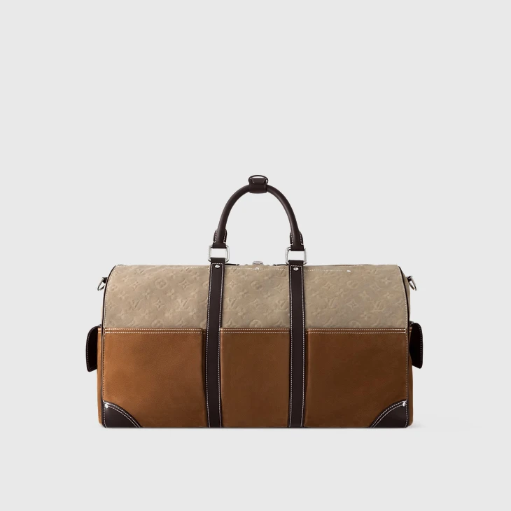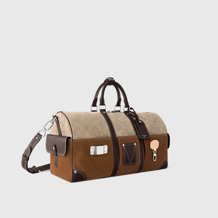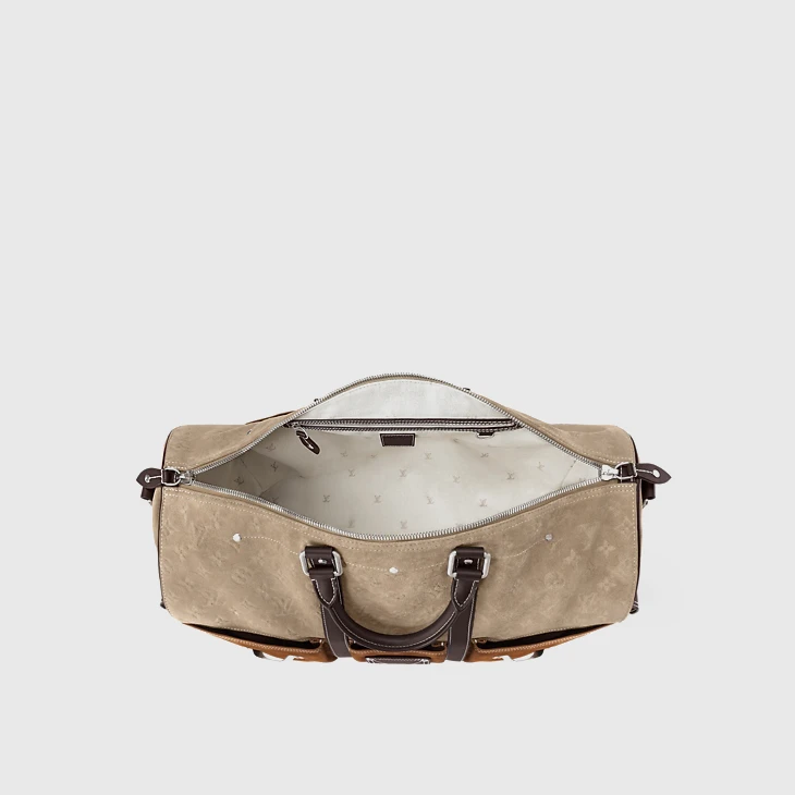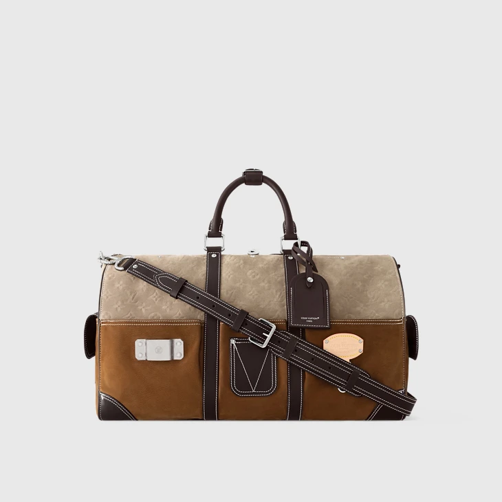 Inspired by the cult-favorite workwear style in Japan, Pharrell Williams and Japanese designer Nigo reimagine the classic Keepall Bandoulière 50 through a bold, industrial lens. Crafted in Monogram suede leather, it features silver-toned hardware—including a carabiner-style hook and a small metallic plate on the front—that underscore its utilitarian aesthetic.