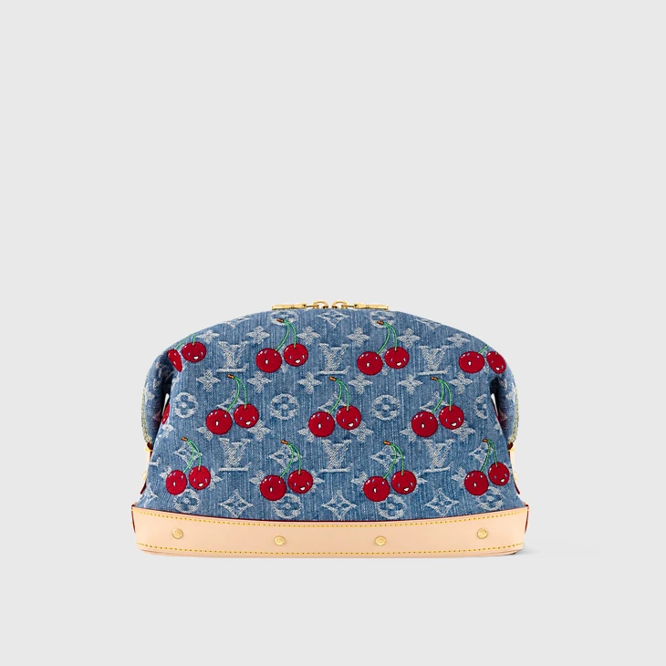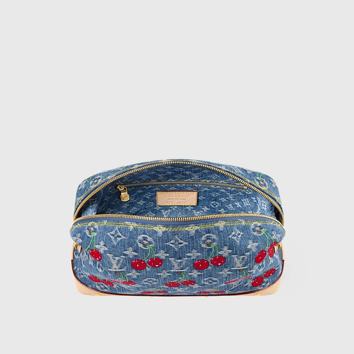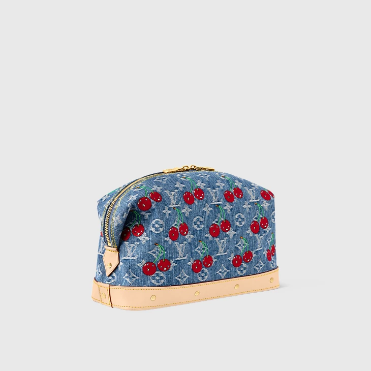 The Cosmetic Pouch GM is a spirited essential in Monogram denim detailed with kawaii cherry embroidery as part of the re-edition of the cross-category Louis Vuitton x Takashi Murakami collection. Golden studs add a rebellious touch to the natural leather trim, while the extra-wide zipper opening and removable washable lining underscore the practicality.