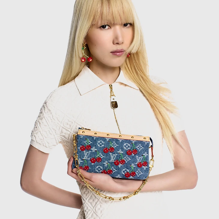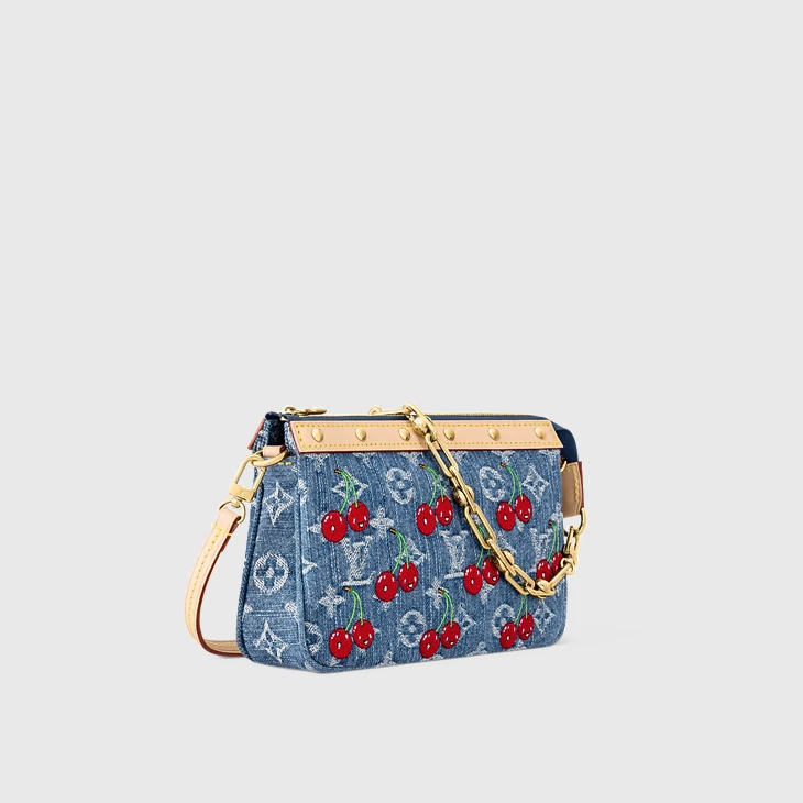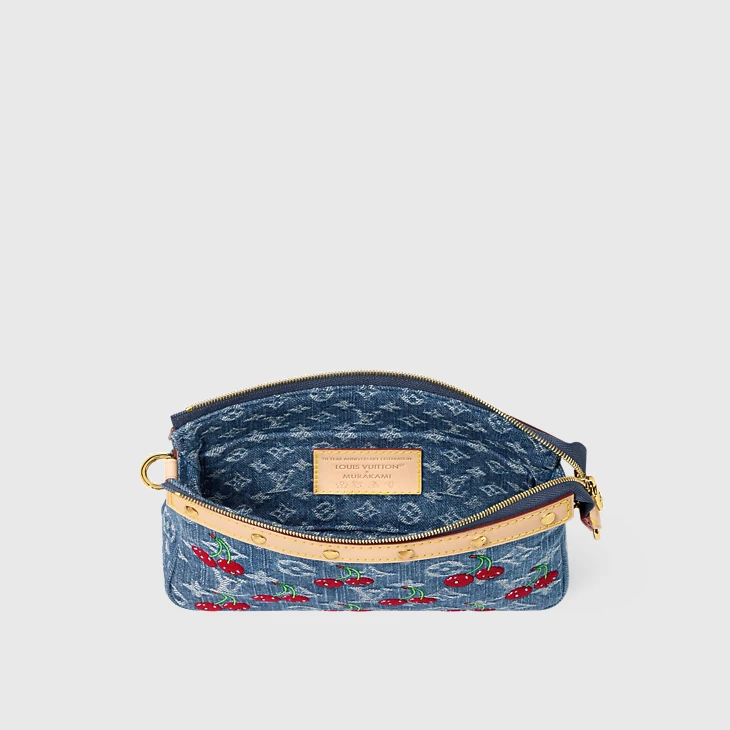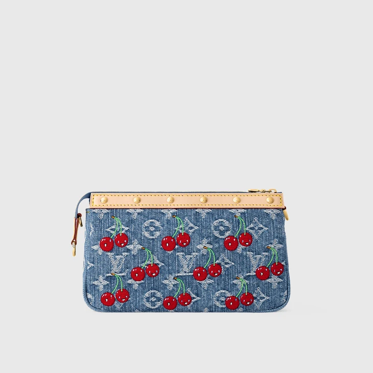 The Pochette Accessoires makes a chic statement as part of the celebratory second edition of the Louis Vuitton x Murakami collection. It is crafted from Monogram denim detailed with vibrant embroidered cherry motifs in the Japanese artist’s signature playful aesthetic, while studded leather trims and gleaming golden hardware complete the look.
