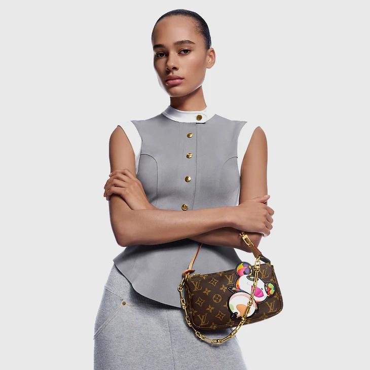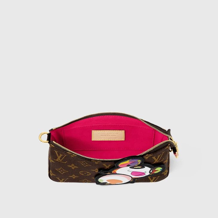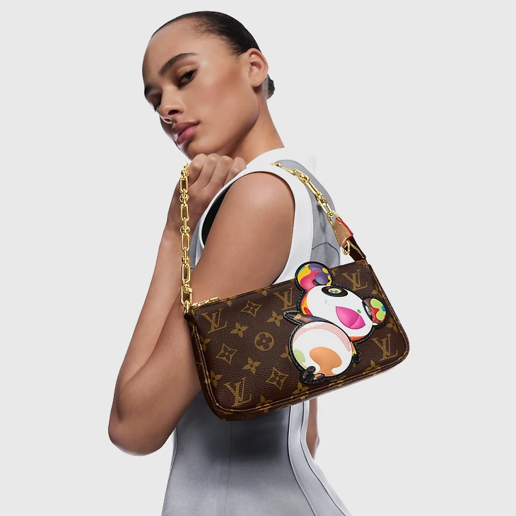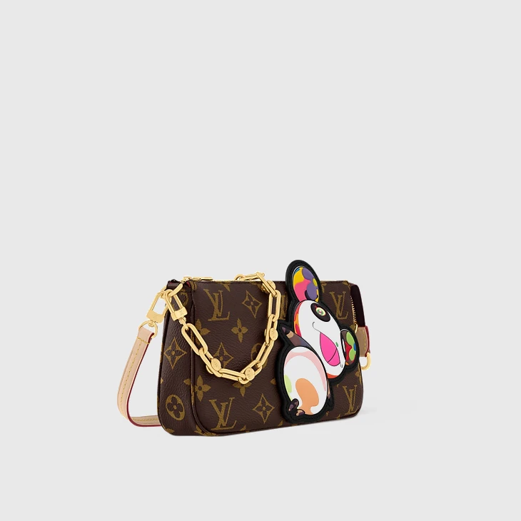 The House’s classic Pochette Accessoires makes a vibrant statement as part of the re-edition of the Louis Vuitton x Murakami collection. Crafted from timeless Monogram coated canvas, the silhouette of the pouch is reworked with the artist’s playful Panda character in vibrant pop colors. The natural cowhide leather strap and chic golden chain are both removable for versatile styling options, while a zipper fastening keeps daily essentials secure.