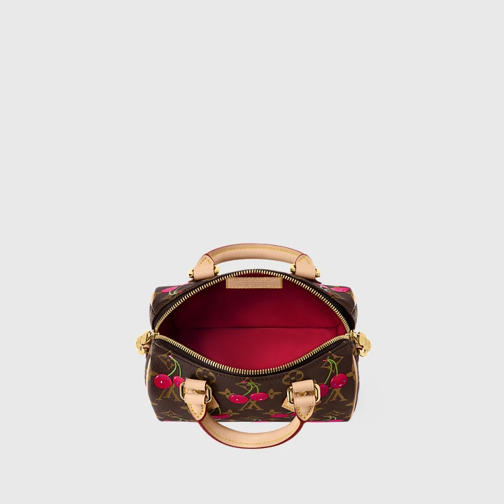 Spirited signatures from the re-edition of the Louis Vuitton x Murakami collection elevate the Speedy Bandoulière with a chic twist. Luscious cherry motifs uplift the House’s iconic Monogram coated canvas with a joyful burst of color, while natural leather highlights the Toron top handles, removable strap and exclusive LV x TM keybell. It is crafted in bijou proportions to carry daily essentials including a smartphone and long wallet.