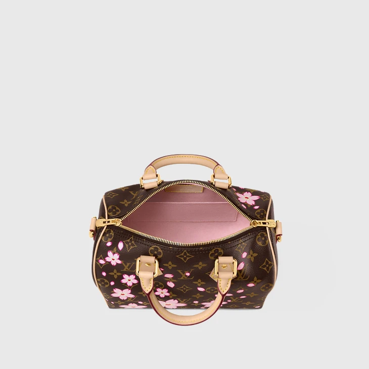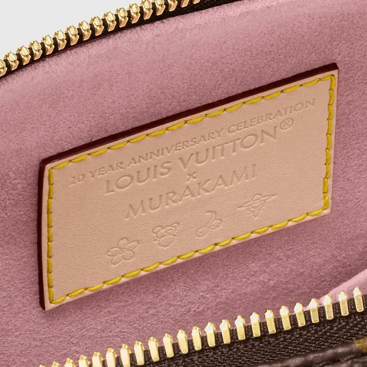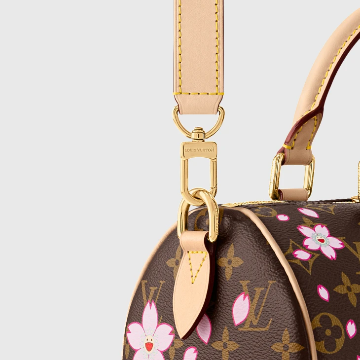 As part of the exclusive re-edition of the Louis Vuitton x Murakami collection, this Speedy Bandoulière 25 twists the House’s iconic Monogram coated canvas with celebratory Cherry Blossom motifs in the renowned artist’s vernacular playful style – including a removable Cherry Blossom bag charm. The elegant Toron top handles and removable leather strap are highlighted in natural cowhide leather, while a golden double zipper closure complete with padlock ensures personal items are secured.